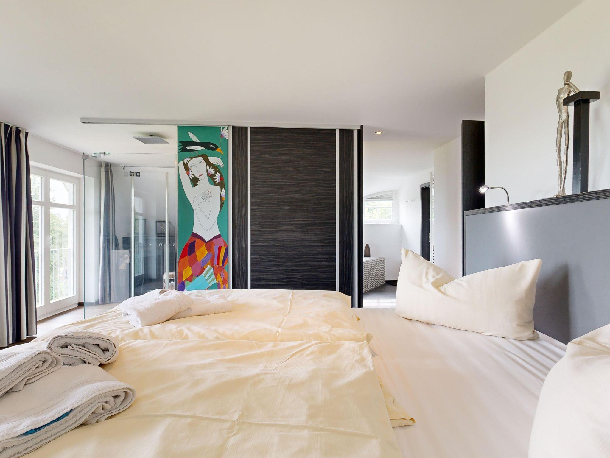 1 großes Schlafzimmer (32 m²) mit einem Doppelbett und Meerblick, Sat-TV, integrierte Badewanne, Dusche