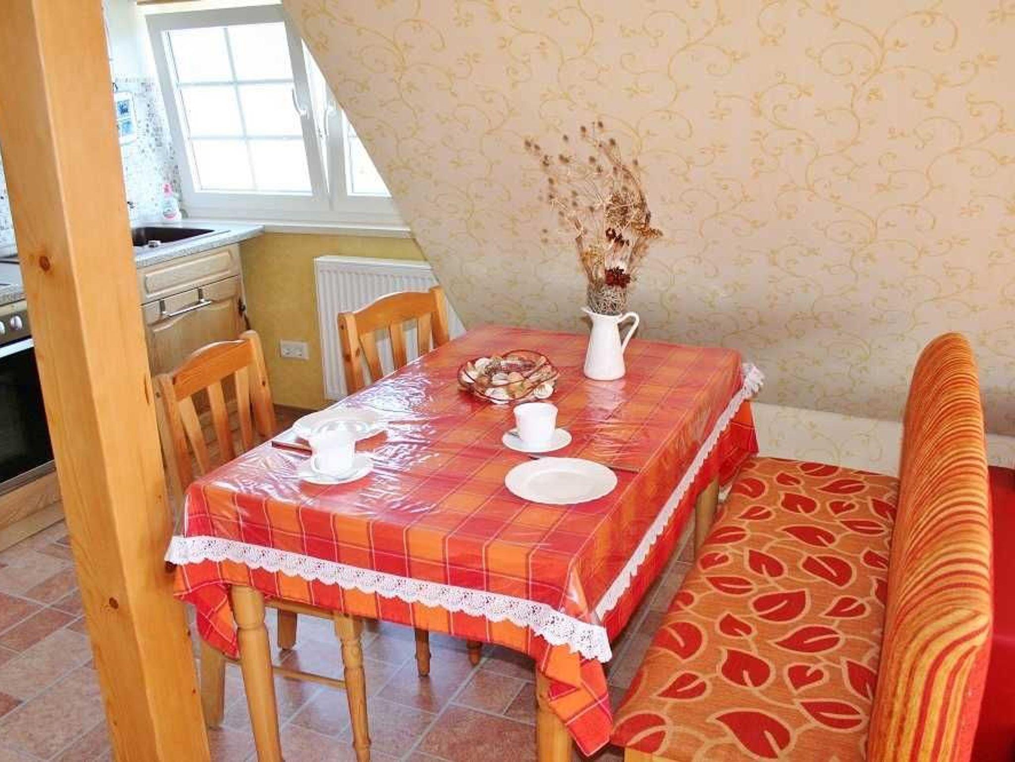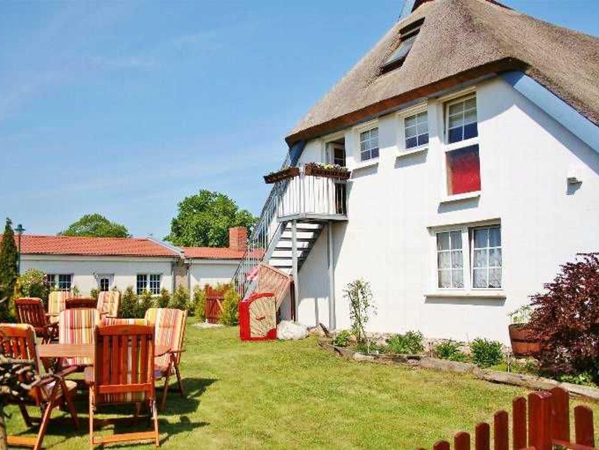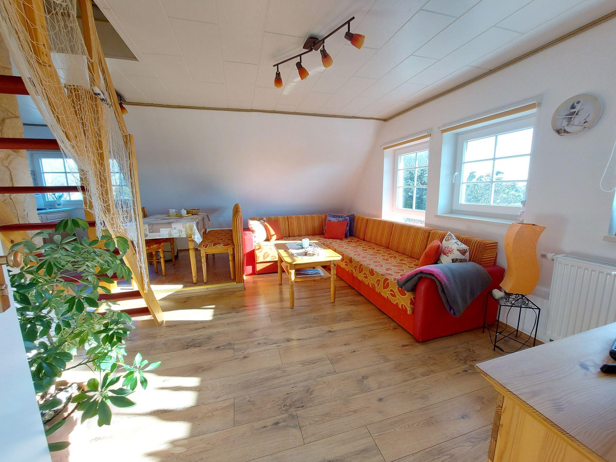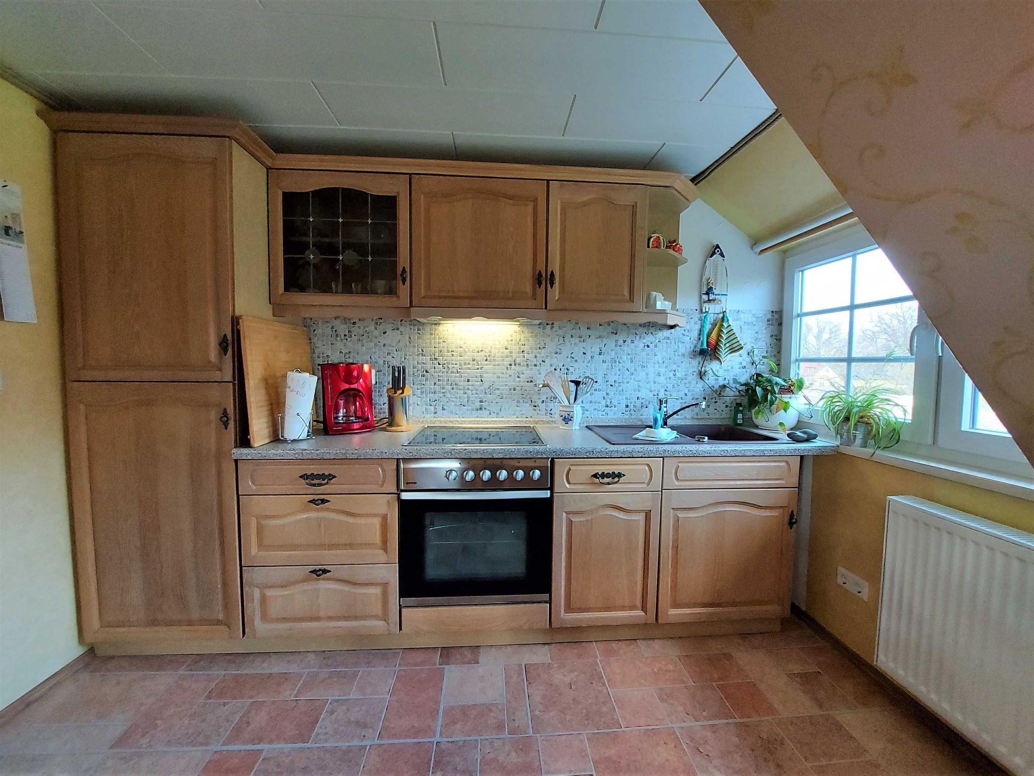Ferienwohnung Putbus OT Kasnevitz. Im Dachgeschoss unseres Reetgedeckten Landhauses erstreckt sich diese schicke Wohnung über 2 Etagen.Das Haus liegt in einem schönen Dorf 3km von der Rosenstadt Putbus entfernt. Sie besteht aus dem Eingangsbereich mit Garderobe,einem grossen Wohn-Schlafraum ,schicke Einbauküche mit allem Komfort(4 Platten Ceranfeld,Backofen mit Umluft,Kühl-Gefrierkombi,Geschirrspüler,Kaffeemaschine,Toaster,Wasserkocher,Mikrowelle) und ein Esstisch mit 4 Sitzplätzen. Von der Küche haben sie einen herrlichen Ausblick auf den Garten, Der Wohn-Schlafbereich hat ein Doppelbett, auf dieser Etage erwartet sie ein sehr schickes Natursteinbad mit Dusche. Über eine Holztreppe gelangen sie ins Obergeschoss wo sich ein Schlafbereich mit 2 Einzelbetten und ein WC-Bad mit Waschbecken befindet. Im Garten haben sie eigene Sitzecken mit hochwertigen Holzmöbeln und Sonnenliegen.
