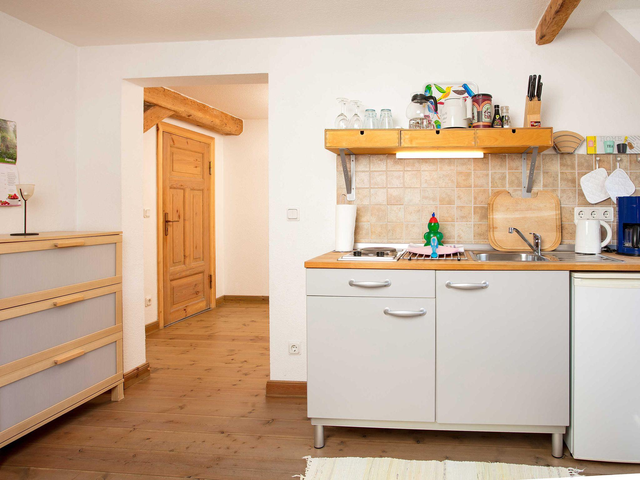 Die Ferienwohnung besteht aus einen Wohnraum und einem sep. Schlaftzimmer, Flur, Küchenzeile, Bad mit Badewanne. Die Fewo liegt im 2 OG. des Gutshauses.