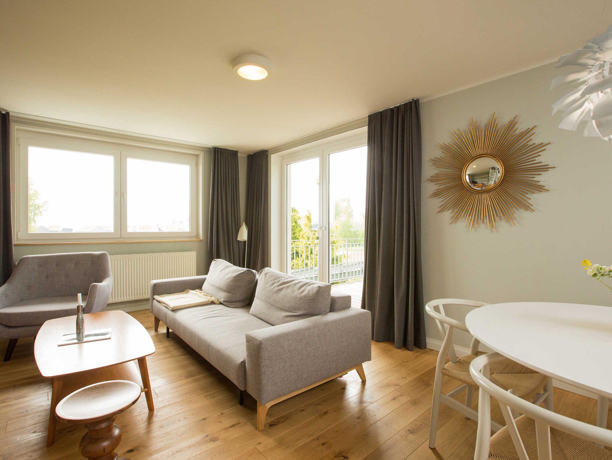 Zwei Schlafräume mit Doppelbetten und ein Wohnraum mit Aufbettung für zwei Personen (Schlafcouch), Küchenzeile, SAT-TV, Musikanlage, Bad mit WC und Dusche, Balkon.