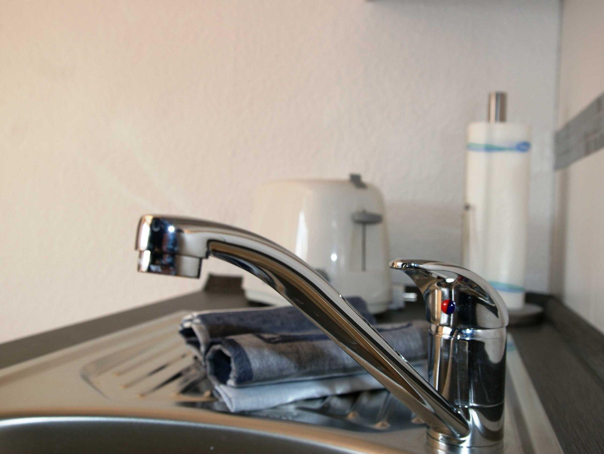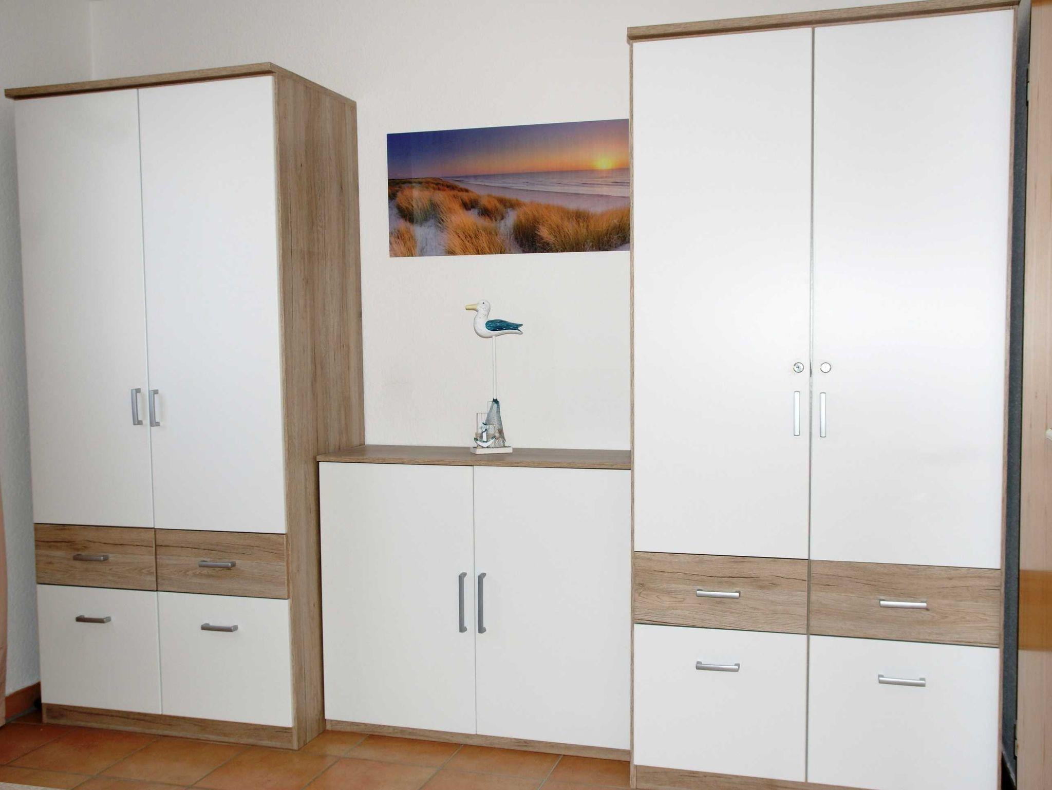 2 Raumapartment mit Balkon , Doppelbett im Schlafzimmer und Schlafcouch im Wohnzimmer sowie einer gut ausgestatteten Küchenzeile mit Geschirrspüler und Backofen . Kaffemaschine und Toaster sind vorhanden. Kinderbett und Hochstuhl für die kleinsten bitte vorbestellen .
