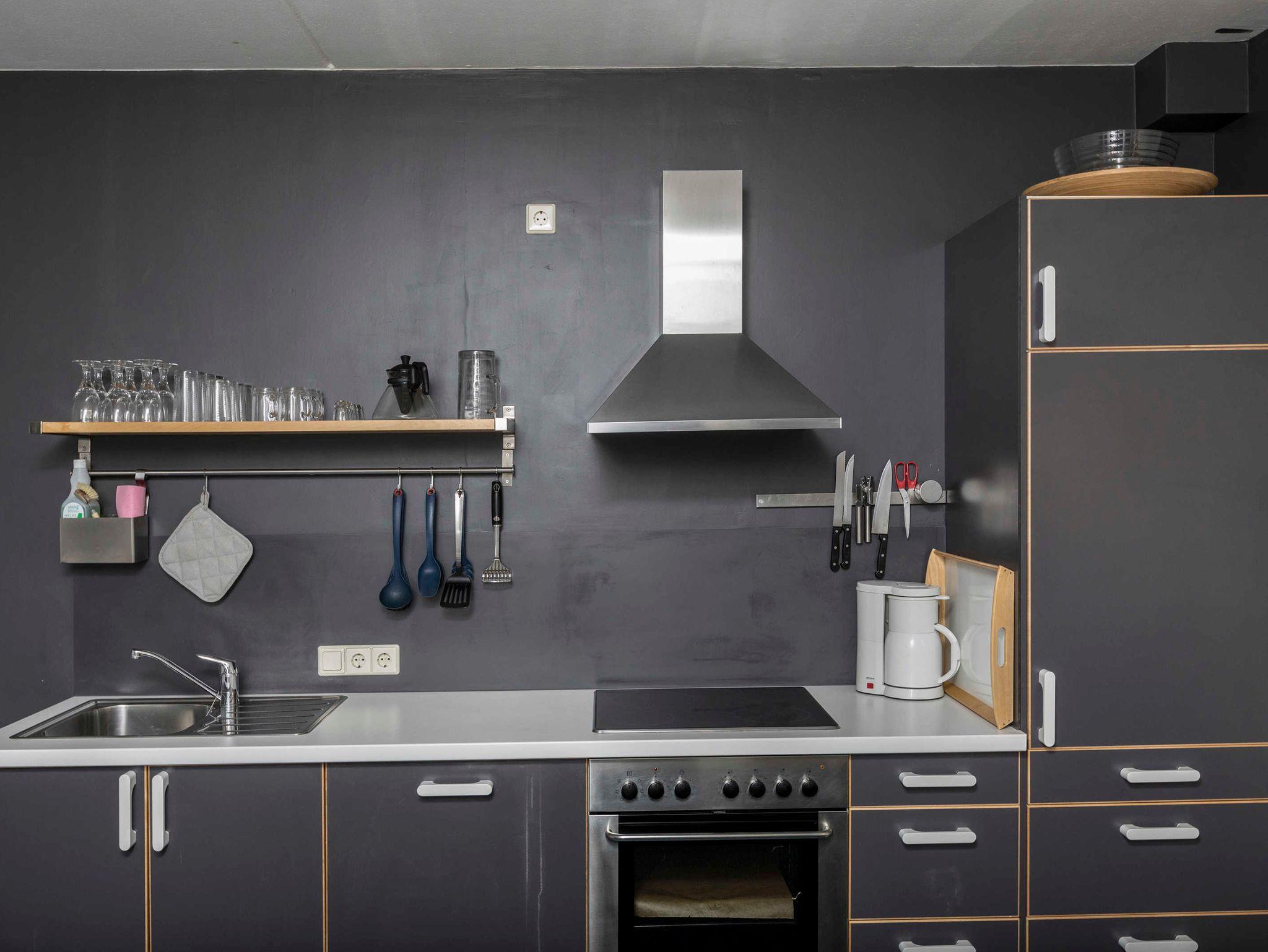 Ausstattung der Küche: 4-Zonen-Kochfeld, Backofen, Geschirrspüler, Filterkaffeemaschine, Wasserkocher, Toaster, Geschirr, Besteck, Pfannen und Töpfe.