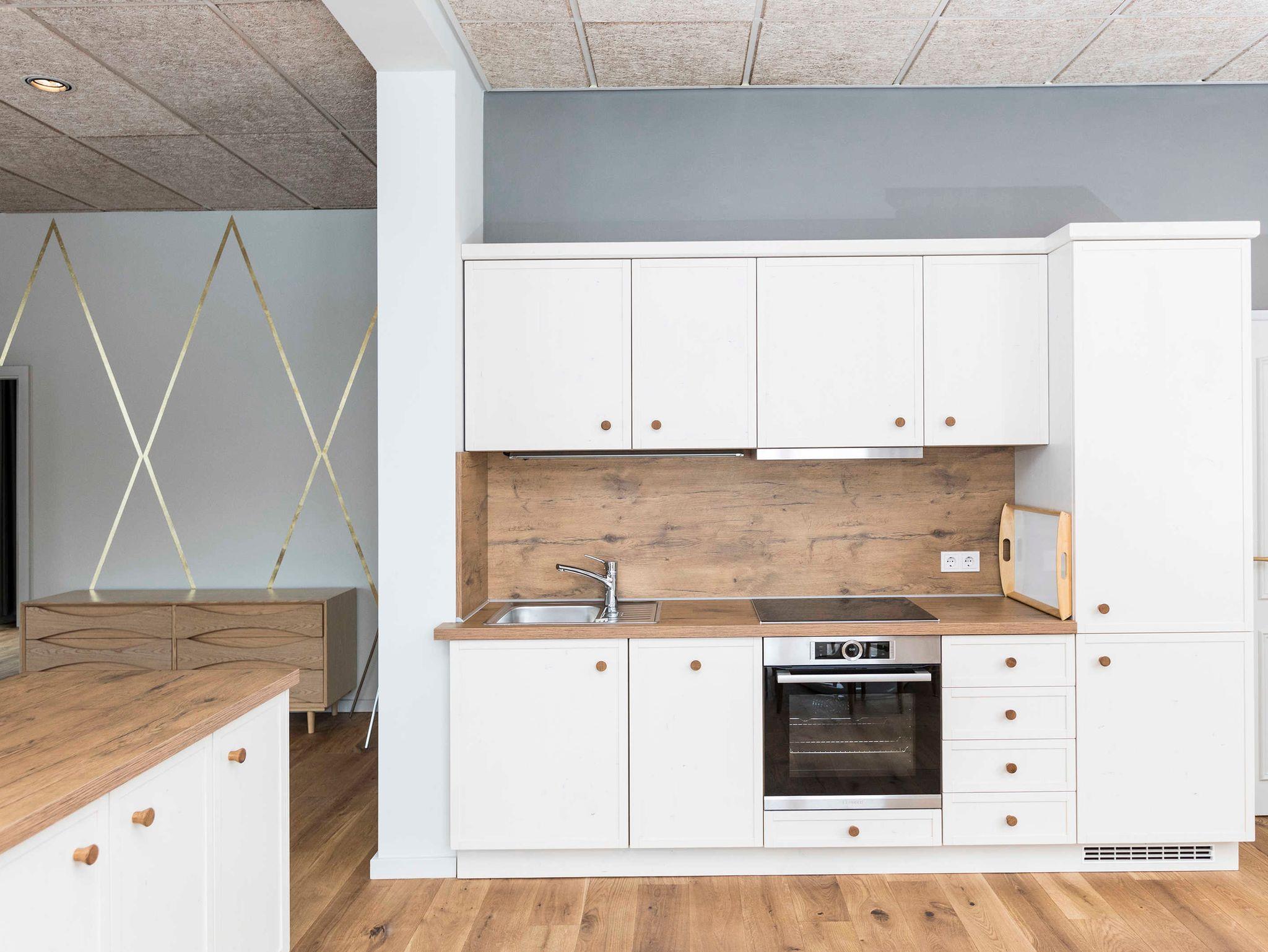 Ausstattung der Küche: 4-Zonen-Kochfeld, Backofen, Geschirrspüler, Filterkaffeemaschine, Wasserkocher, Toaster, Geschirr, Besteck, Pfannen und Töpfe.