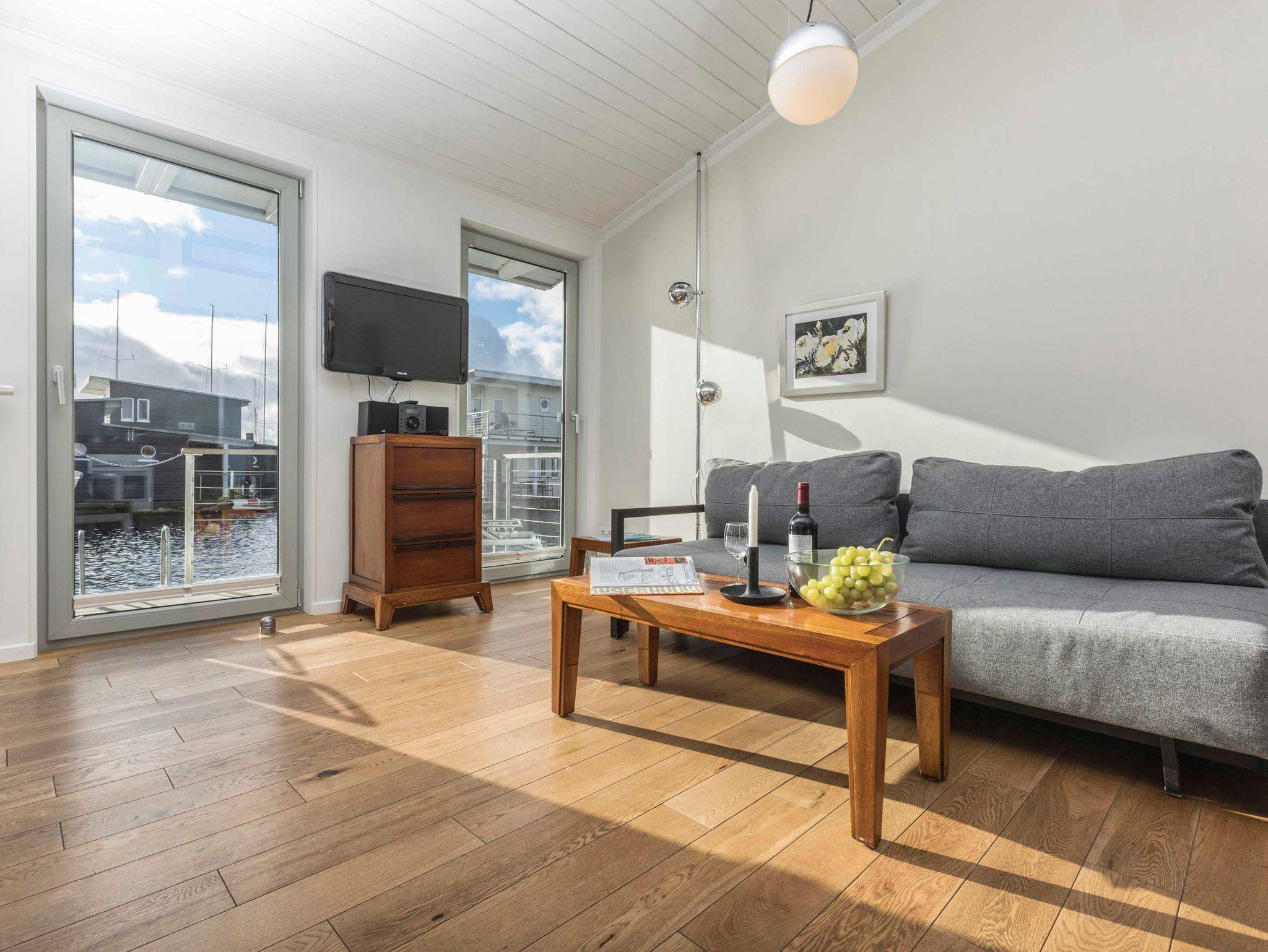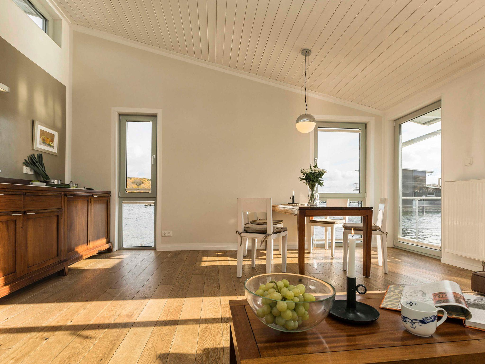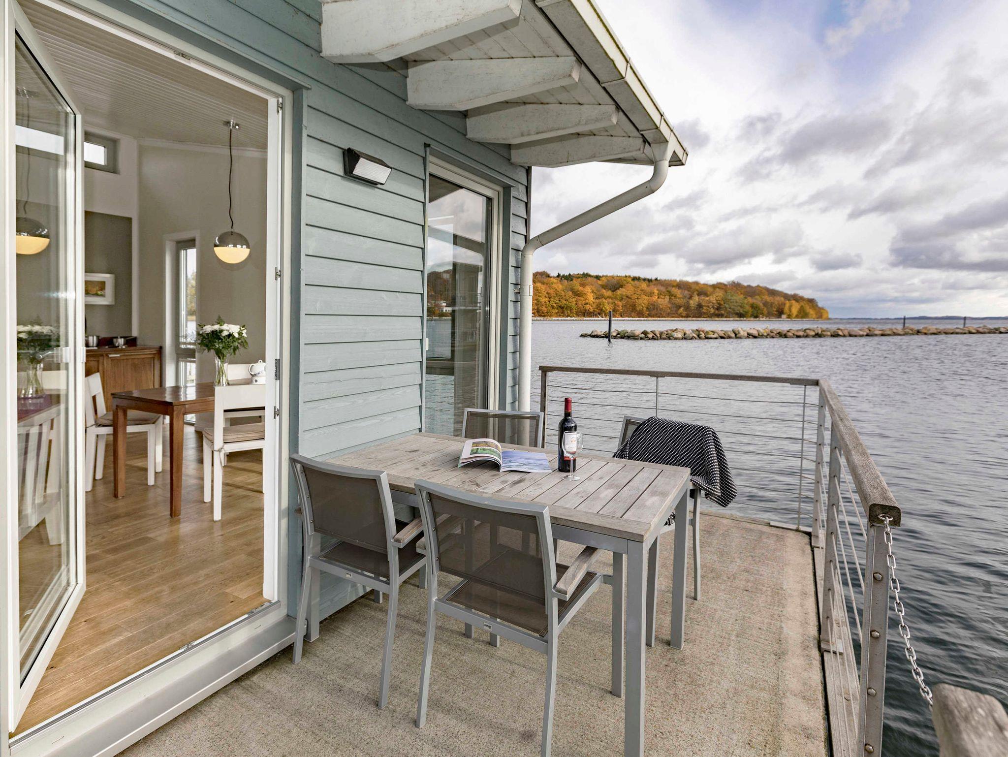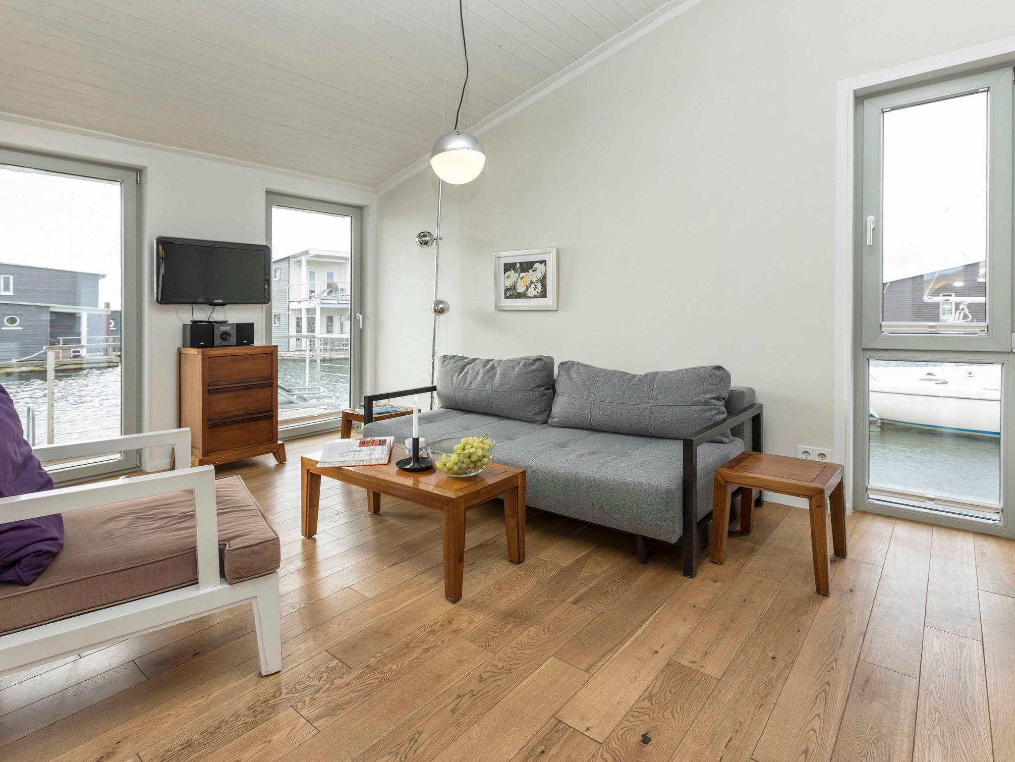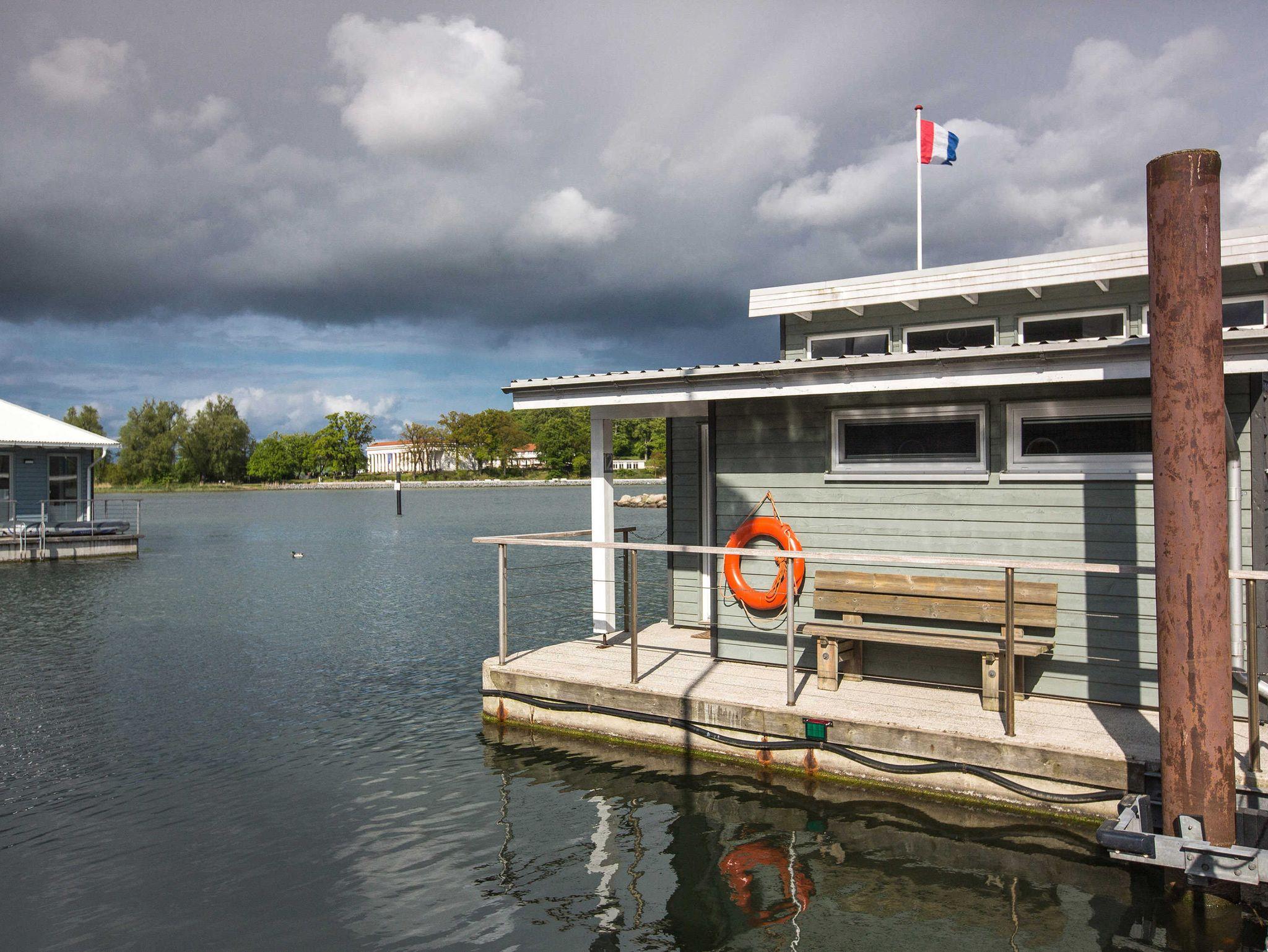 Schwimmendes Ferienhaus in Lauterbach mit Terrasse, Bootsliegeplatz und familienfreundlichen Angeboten.
