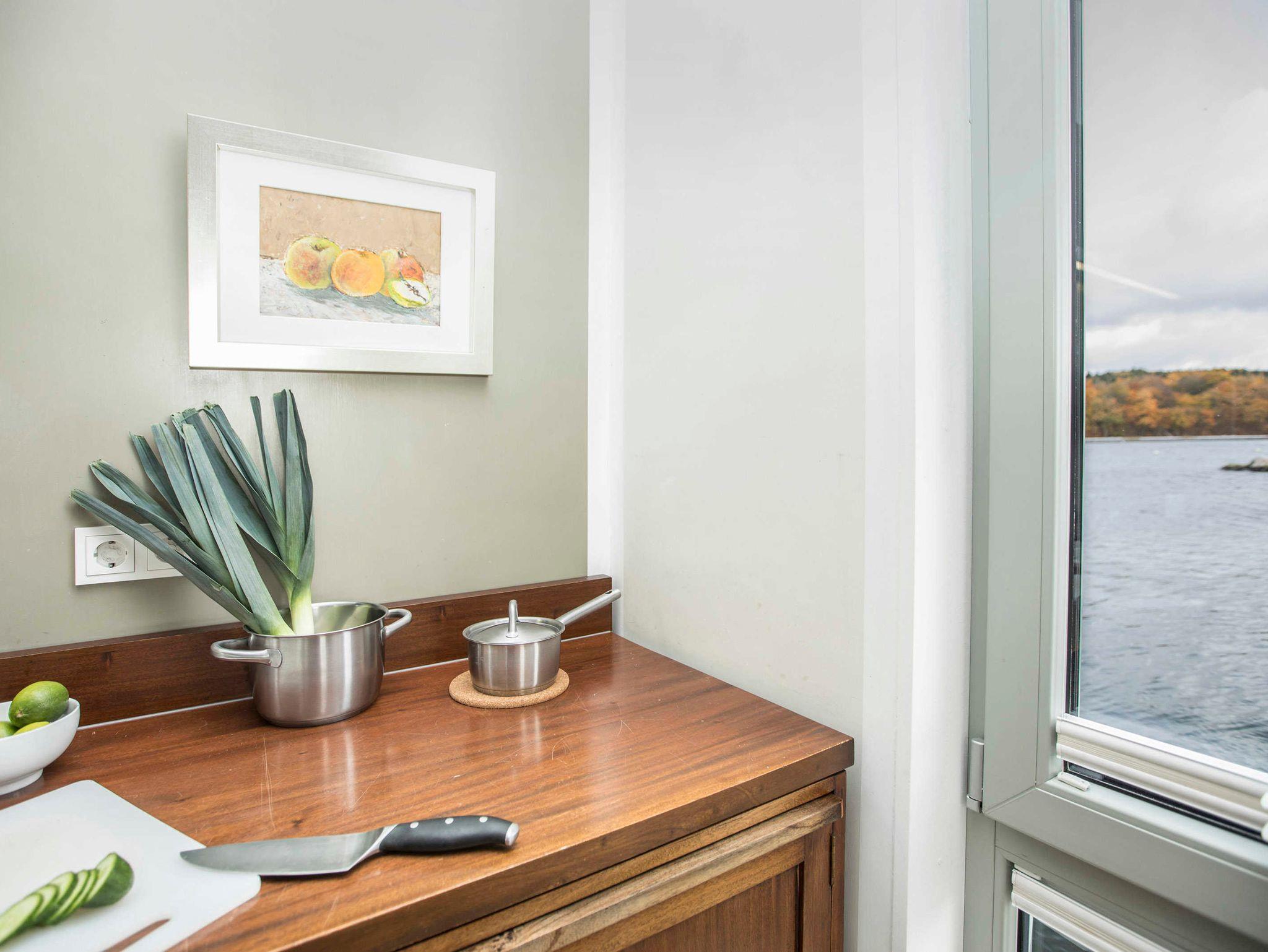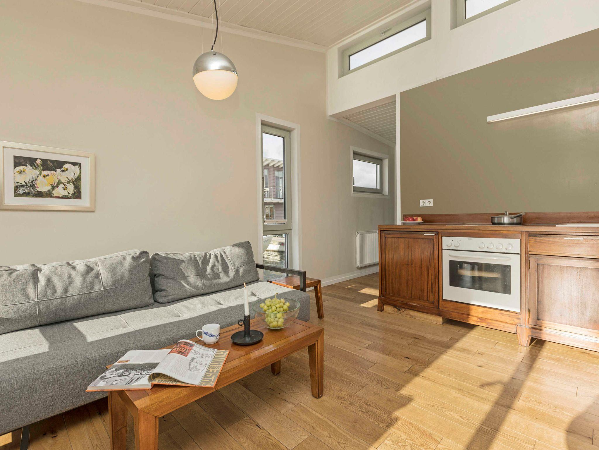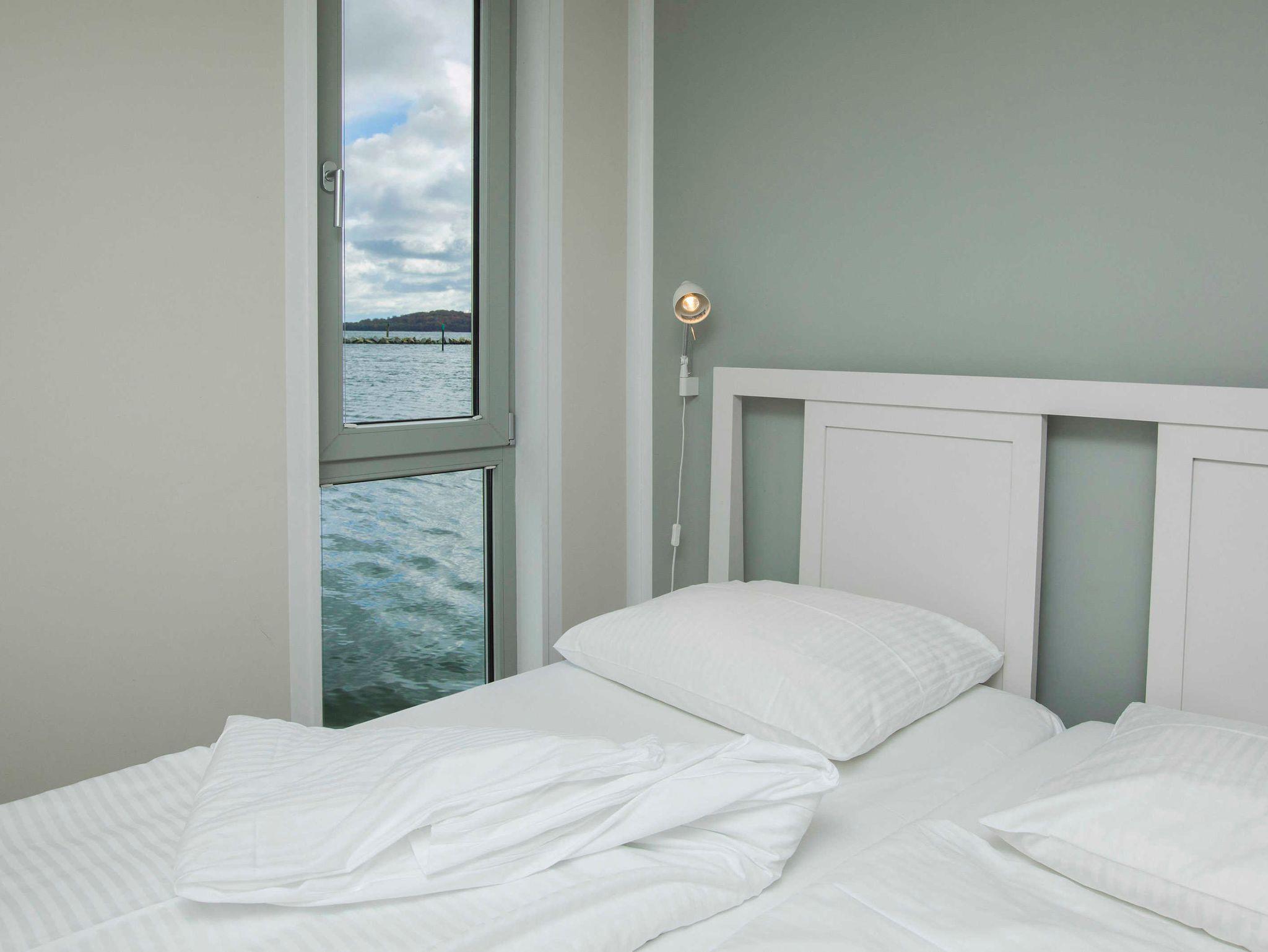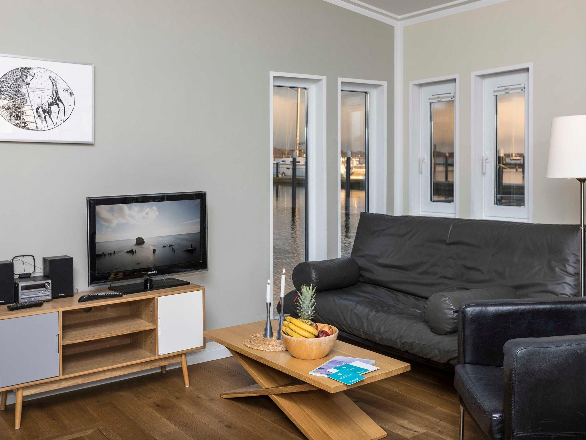 Ein Schlafraum mit Doppelbett, ein Wohnraum mit Aufbettung für zwei Personen (Schlafcouch). SAT-TV, Musikanlage, Küchenzeile, Dusche, WC, möblierte Terrasse, Bootsliegeplatz inkl.