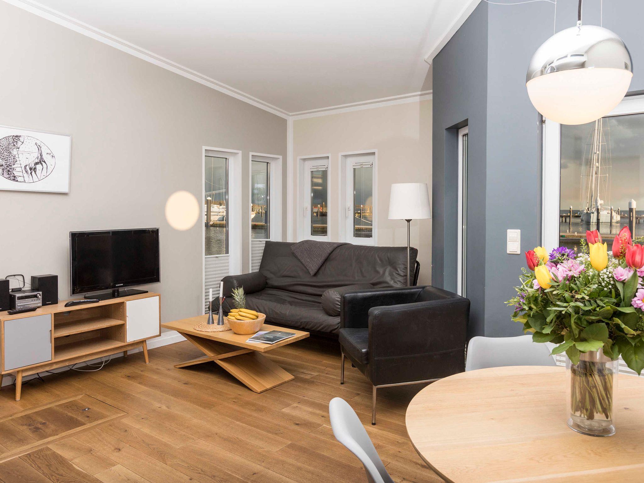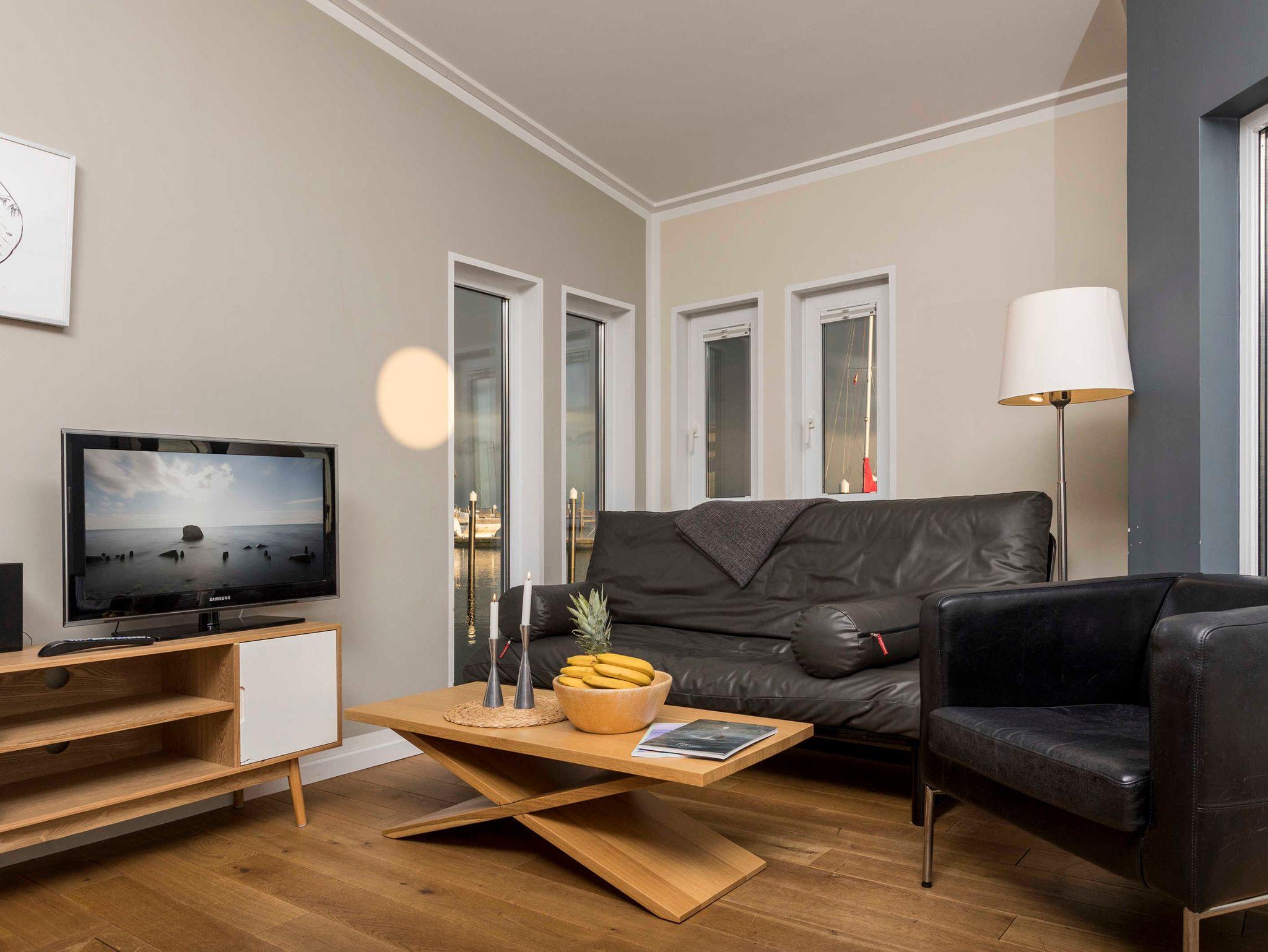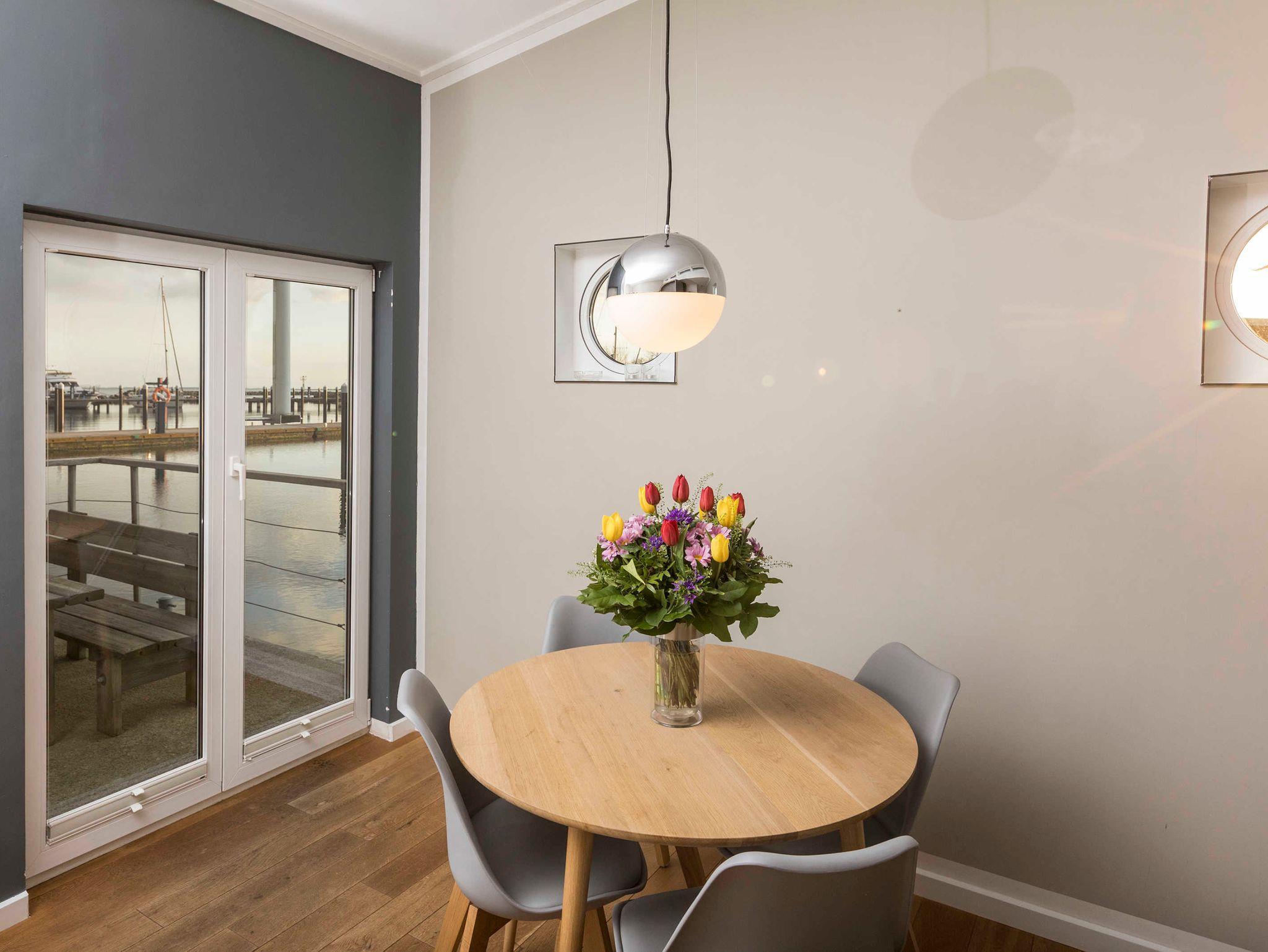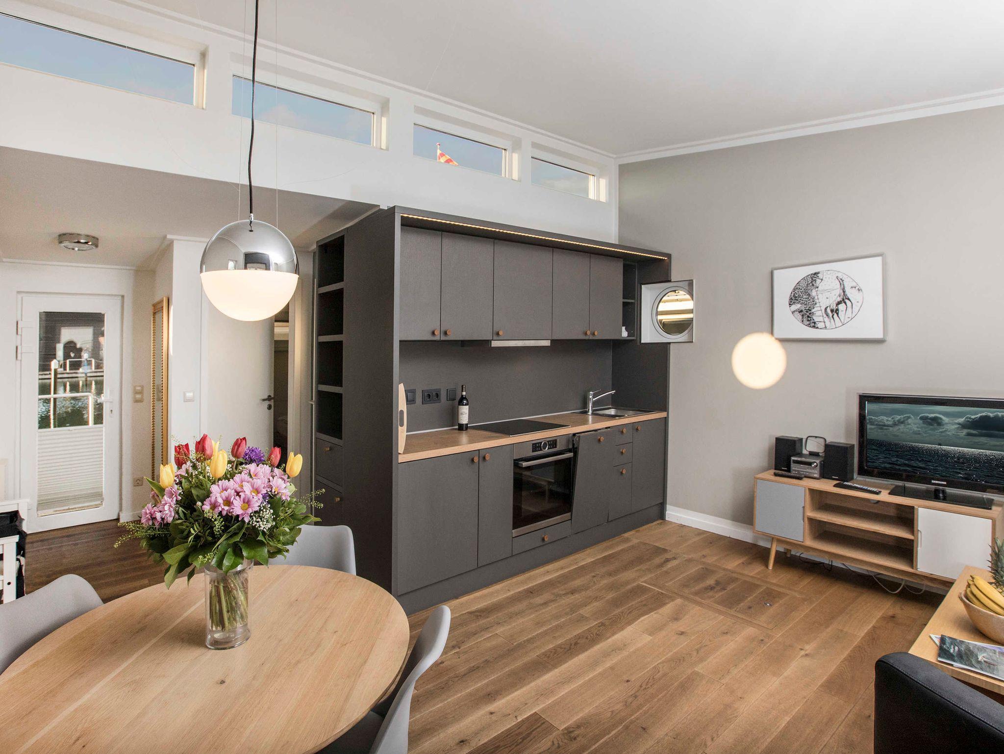Ein Schlafraum mit Doppelbett, ein Wohnraum mit Aufbettung für zwei Personen (Schlafcouch). SAT-TV, Musikanlage, Küchenzeile, Dusche, WC, möblierte Terrasse, Bootsliegeplatz inkl.