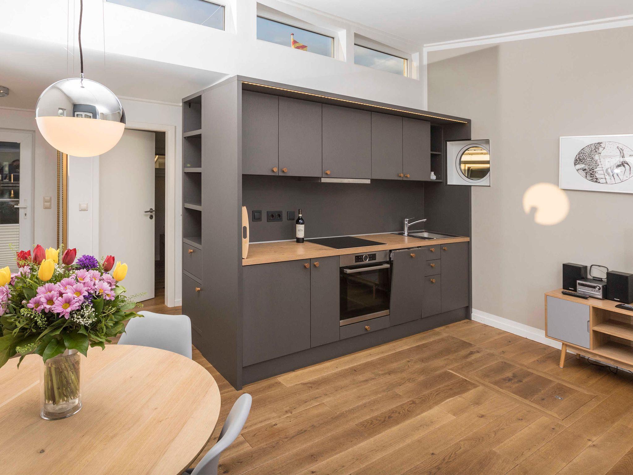 Ausstattung der Küche: 4-Zonen-Kochfeld, Backofen, Geschirrspüler, Filterkaffeemaschine, Wasserkocher, Toaster, Geschirr, Besteck, Pfannen und Töpfe.