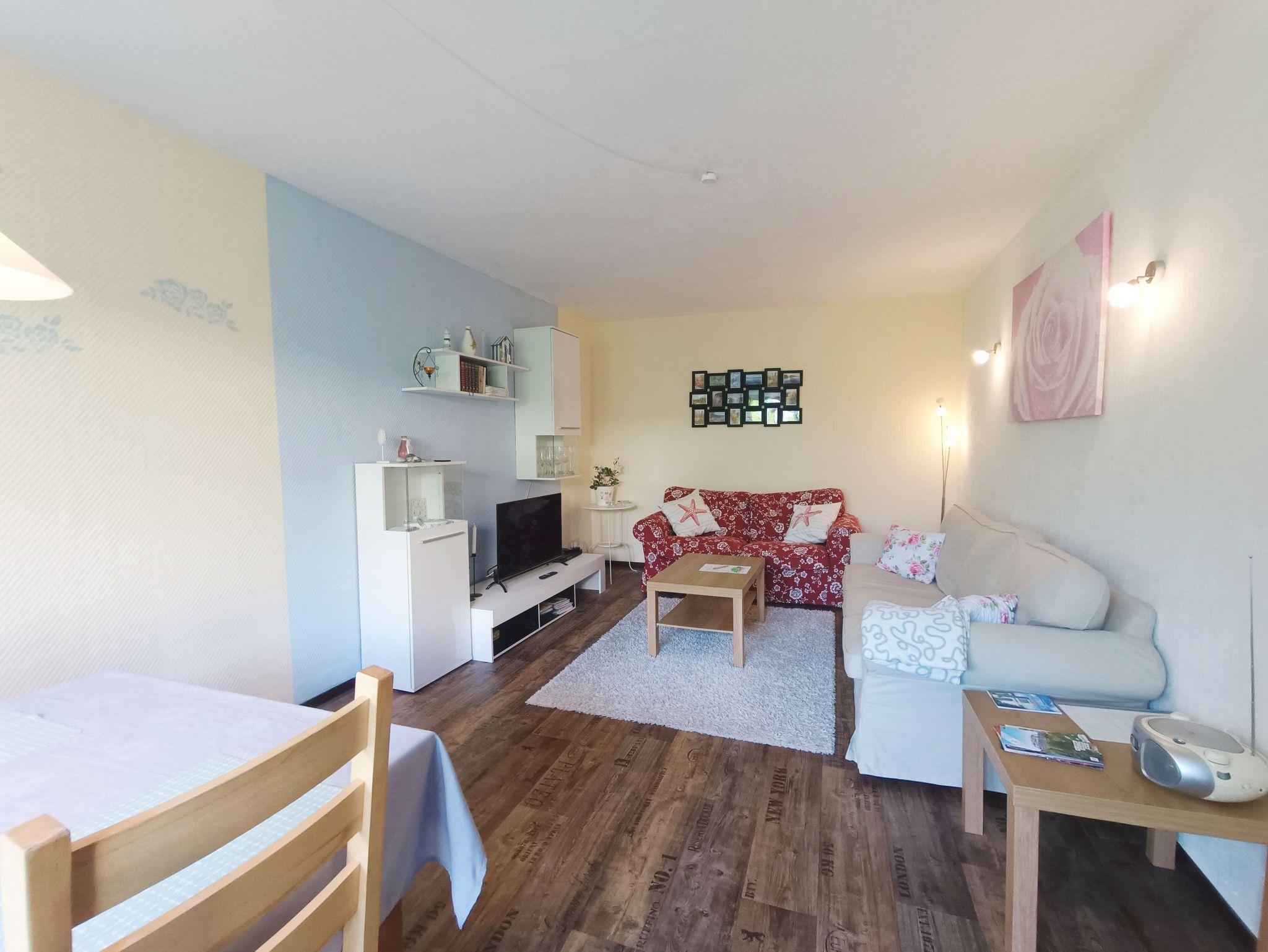 Zum Appartement Rosenblüte gehören eine Terrasse mit Sitzmöbeln, Grill und ein PKW-Stellplatz. Im großzügigen Wohnzimmer im Erdgeschoss befinden sich eine bequeme Sitzgruppe mit Tisch, eine Stereo-Anlage bzw. Buch- und Leseecke, Blu-Ray-DVD-Kombination, Essecke und einem modernen Flachbild-TV.