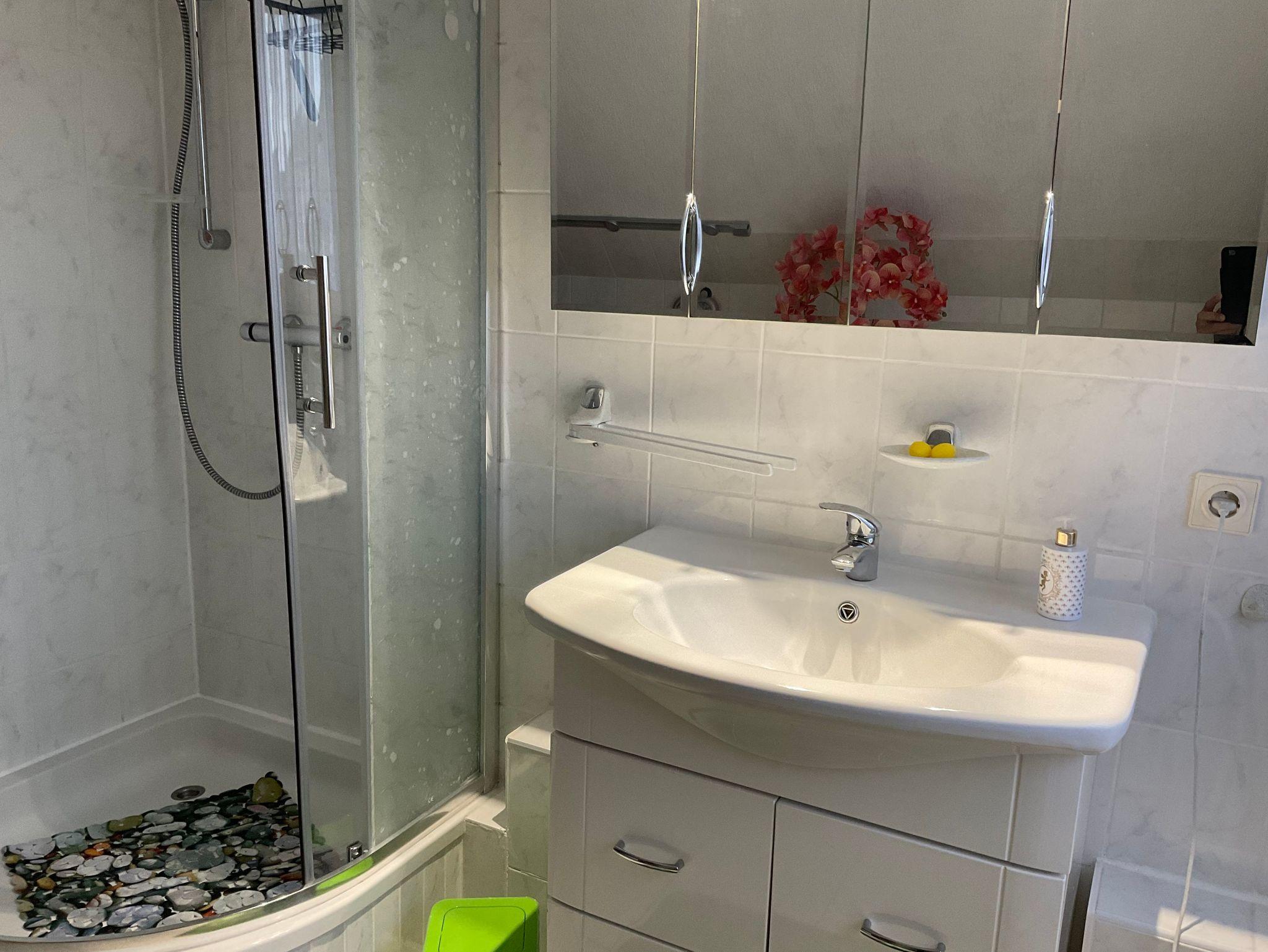 Die ca. 50 m² große Ferienwohnung im Obergeschoß bietet 2 Personen ausreichend Platz. Sie besteht aus einem Wohnraum mit Sitzgruppe dem Schlafraum mit dem Doppelbett. Die Küche ist in einem sep. Raum. Bad mit Dusche und WC.