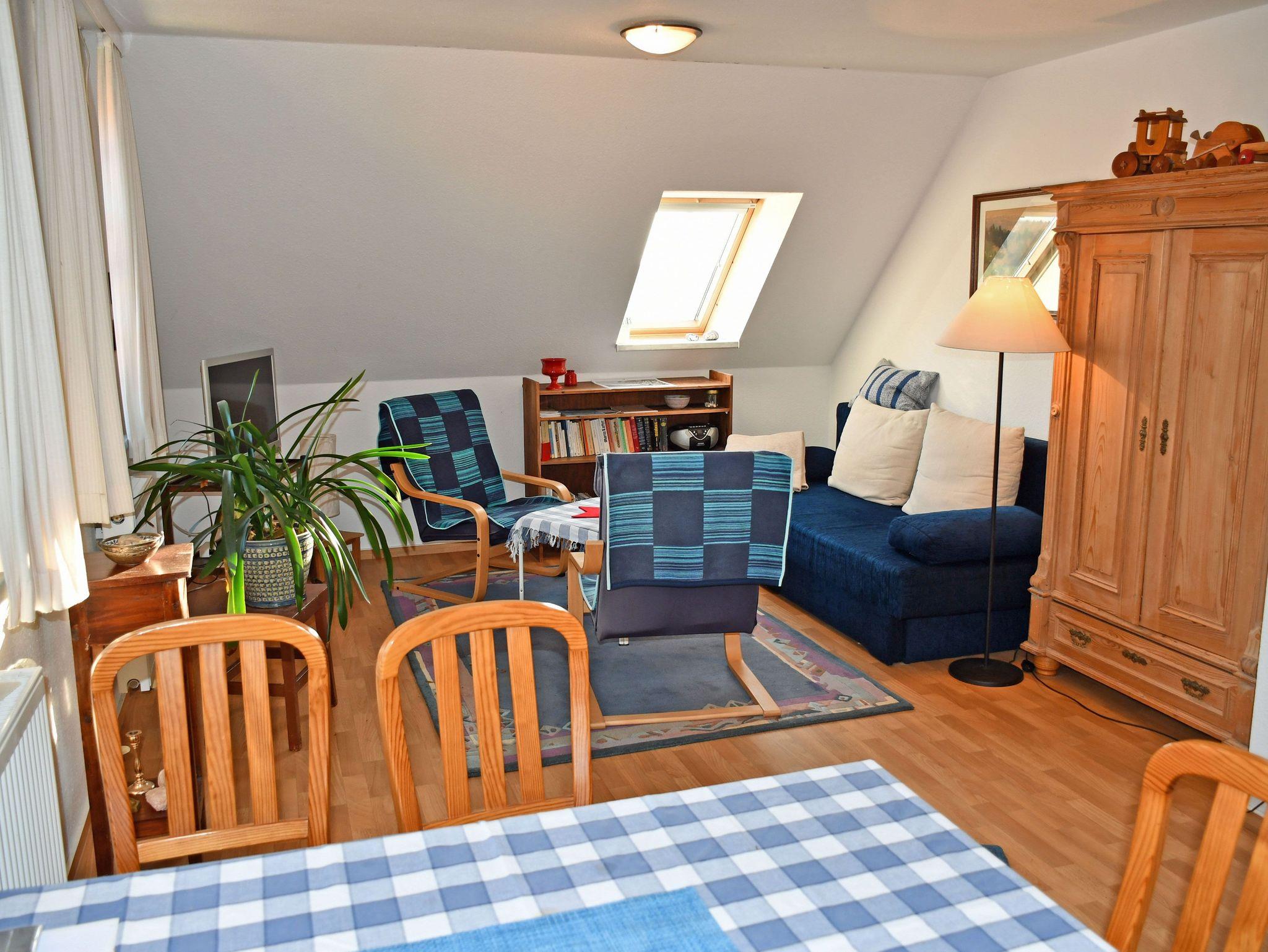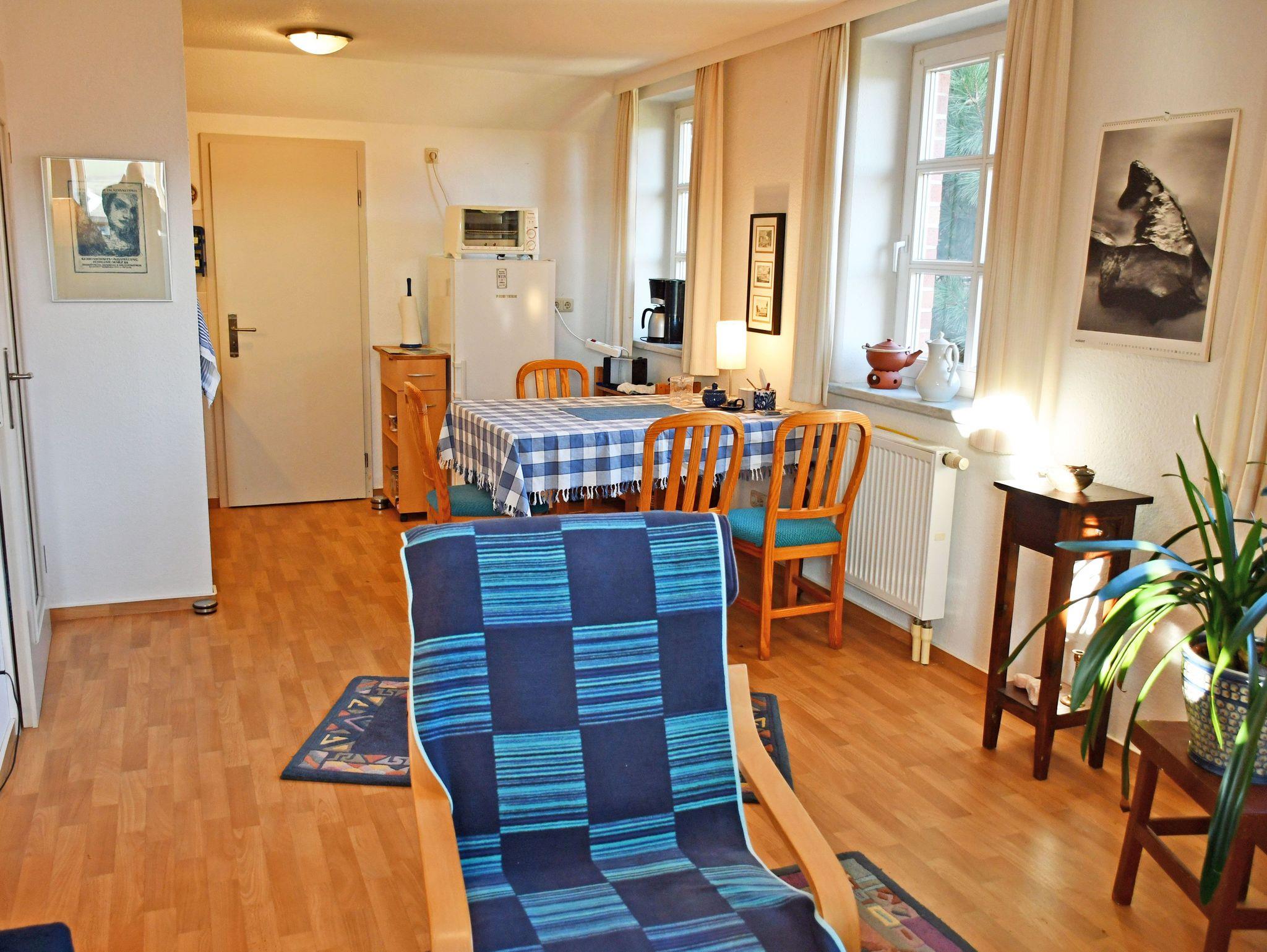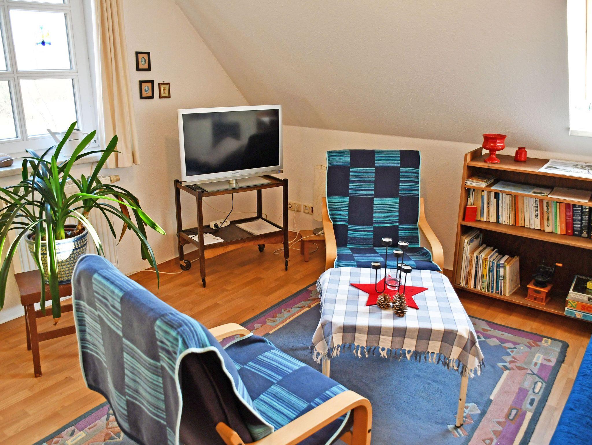Im Wohnraum befinden sich eine bequeme Couch mit Tisch und ein TV-Gerät. Hier steht auch ein Esstisch mit Sitzgelegenheiten. Aus dem Fenster genießen Sie einen wunderschönen Ausblick zur Goor (Waldgebiet) und die Vilmnitzer Weiden.