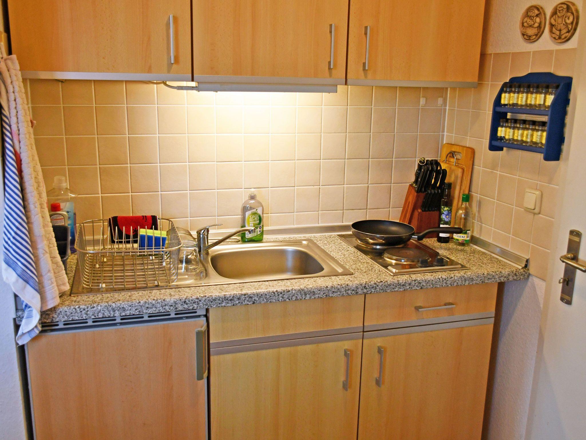 Die Küchenzeile ist mit einem Herd, Mikrowelle, Wasserkocher, Kaffeemaschine, Toaster, Minibackofen und Kühlschrank komplett ausgestattet. Das Schlafzimmer verfügt über ein bequemes Doppelbett mit Nachttischen und Leselampen sowie einem Kleiderschrank.