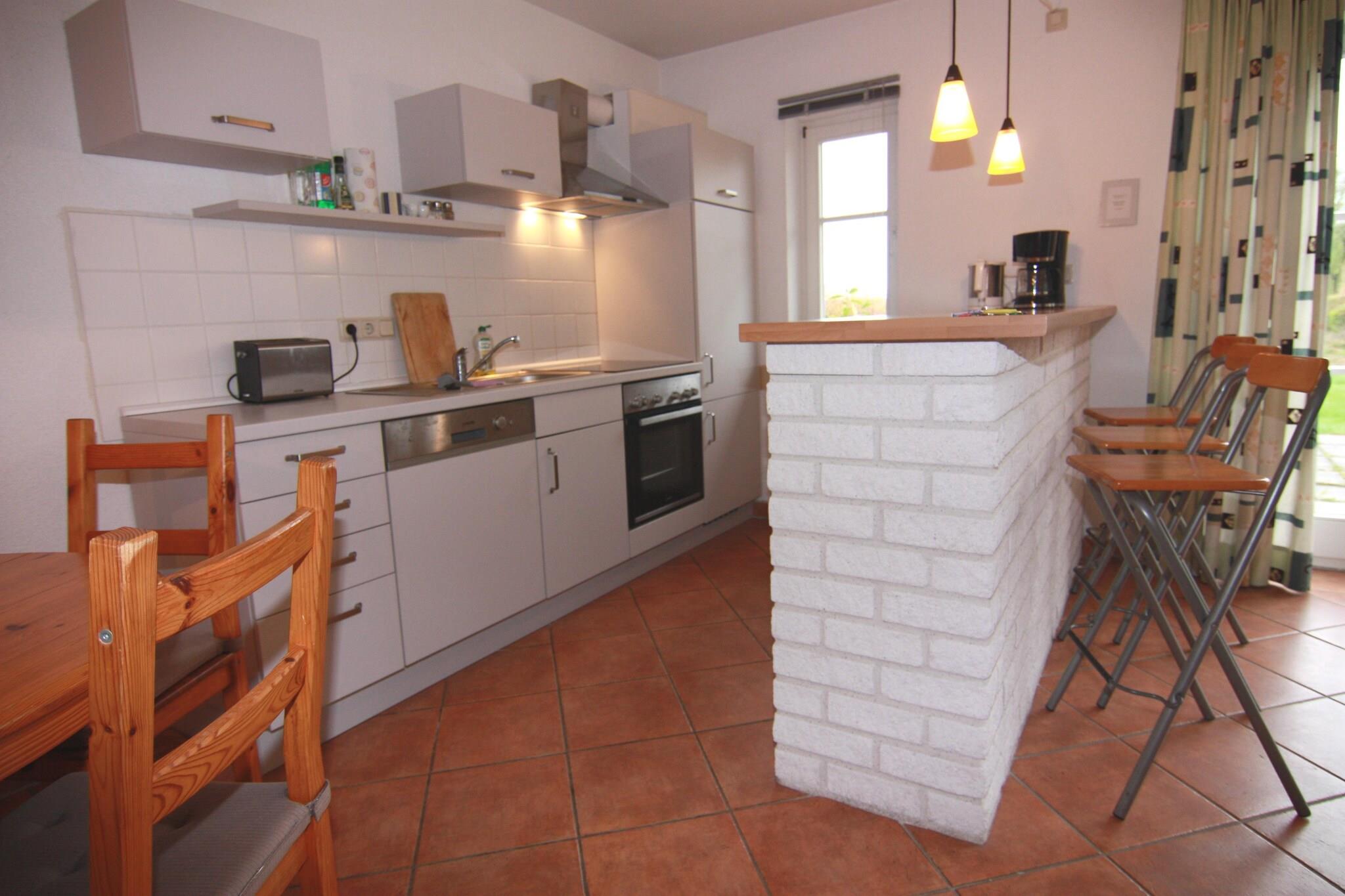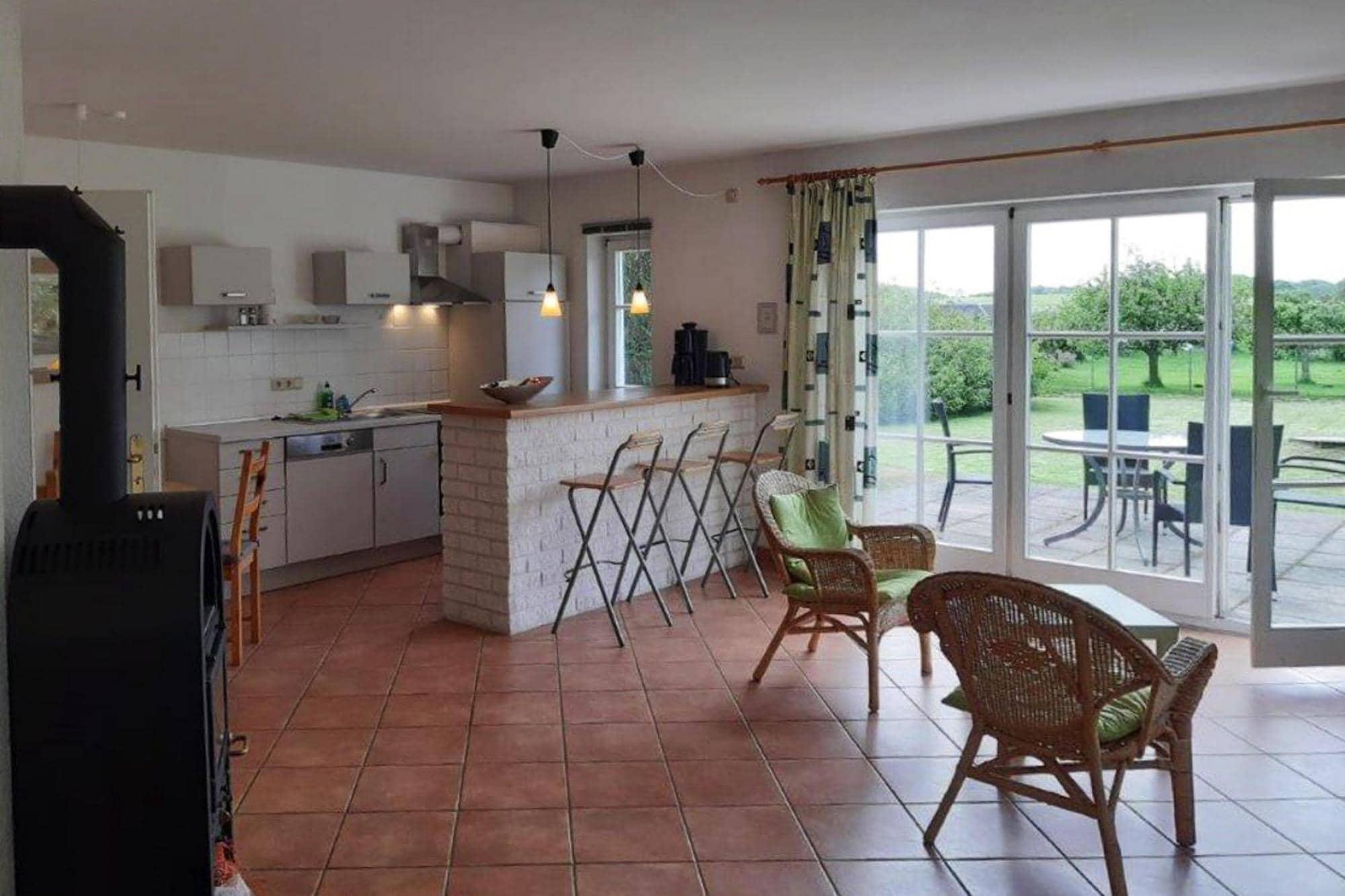 Parterre: (Wohnzimmer(Doppelschlafcouch, TV(Satellit), Kaminofen, Radio), offene Küche(Esstisch(4 Personen), Kochplatte(4 Kochplatten, Ceranfeld), Wasserkocher, Toaster, Dunstabzugshaube, Kaffeemaschine, Backofen, Spülmaschine, Kühlschrank(+ Gefrierfach)), Schlafzimmer(Doppelbett(180 x 200 cm)), Badezimmer(Dusche, Waschbecken, Toilette)) Grill, Heizung, Terrasse, Gartenmöbel, Parkplatz, Handtücher/Bettwäsche (extra Gebühr)