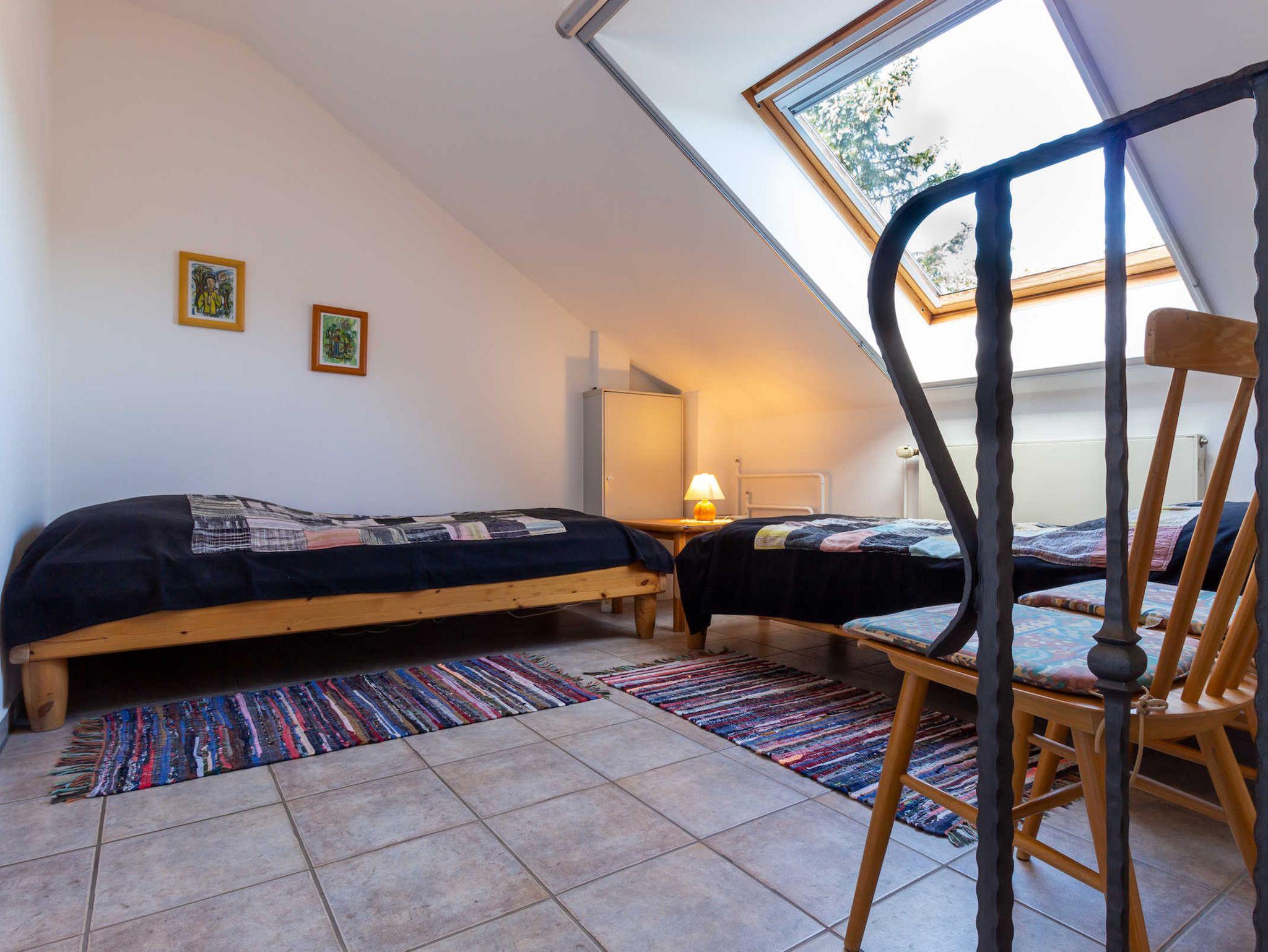 Im ebenfalls hellen, freundlichen Obergeschoss gibt es zwei Schlafräume. Diese sind jeweils mit zwei Betten (vier Betten pro Ferienwohnung) ausgestattet. Ein Schlafraum ist ein Durchgangszimmer (zur Treppe offen - siehe Grundriss). Beide Räume verfügen über große Dachfenster, die abgedunkelt werden können.