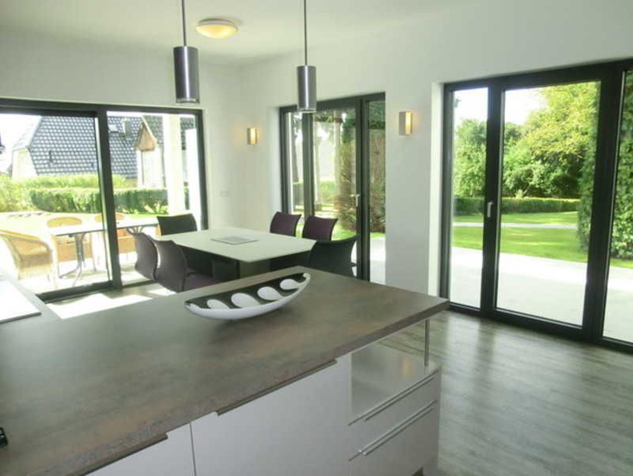 Einen zweiseitiger Kamin zwischen Küche und Wohnbereich sowie den Panoramablick in den Garten bietet Ihnen diese Luxuswohnung.