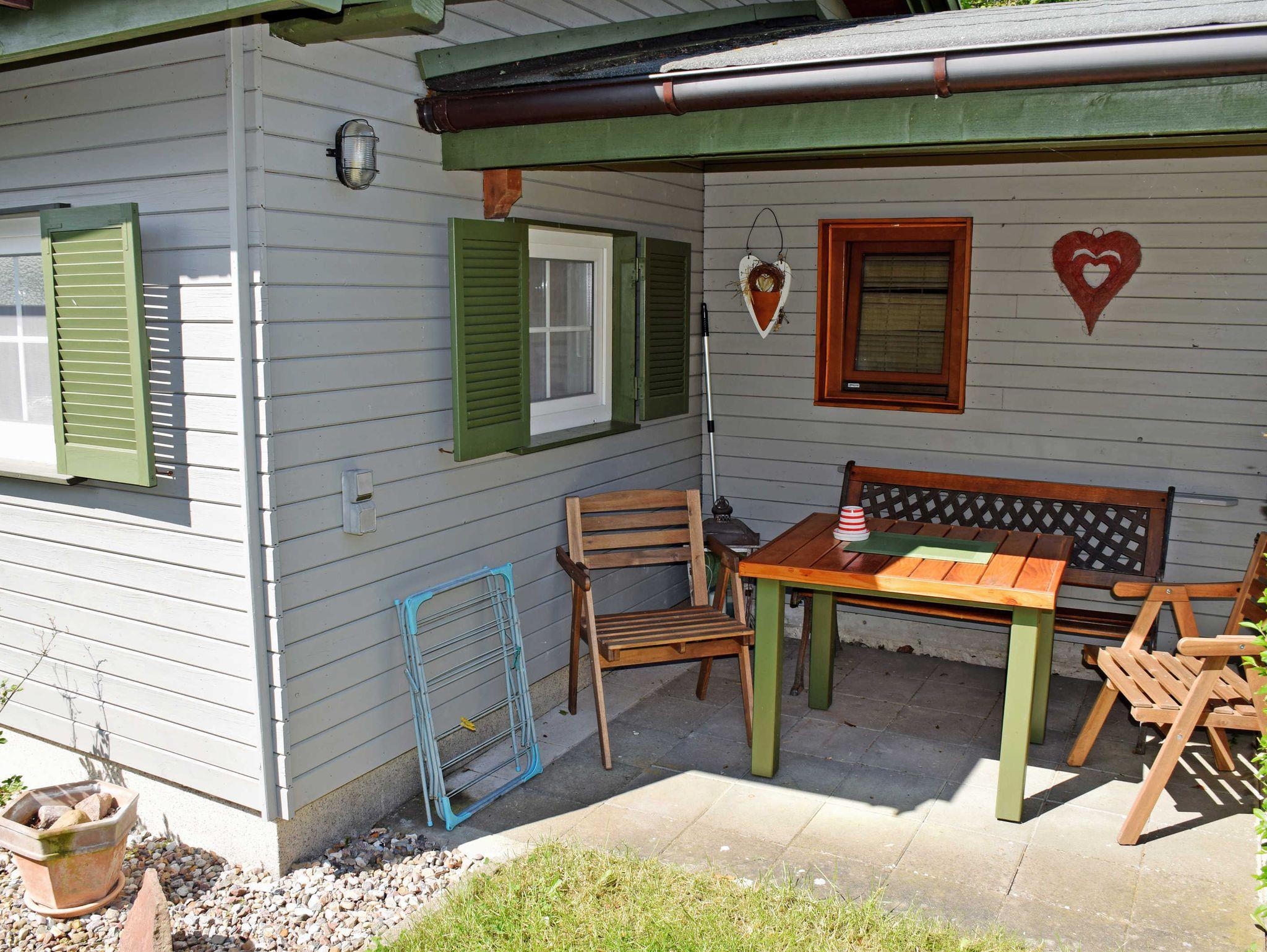 Im separaten Schlafzimmer befinden sich ein Doppelbett ein Kleiderschrank. Vor dem Ferienhaus gibt es eine schöne überdachte Terrasse mit Gartenmöbeln, auf der man Frühstücken oder abends grillen kann.