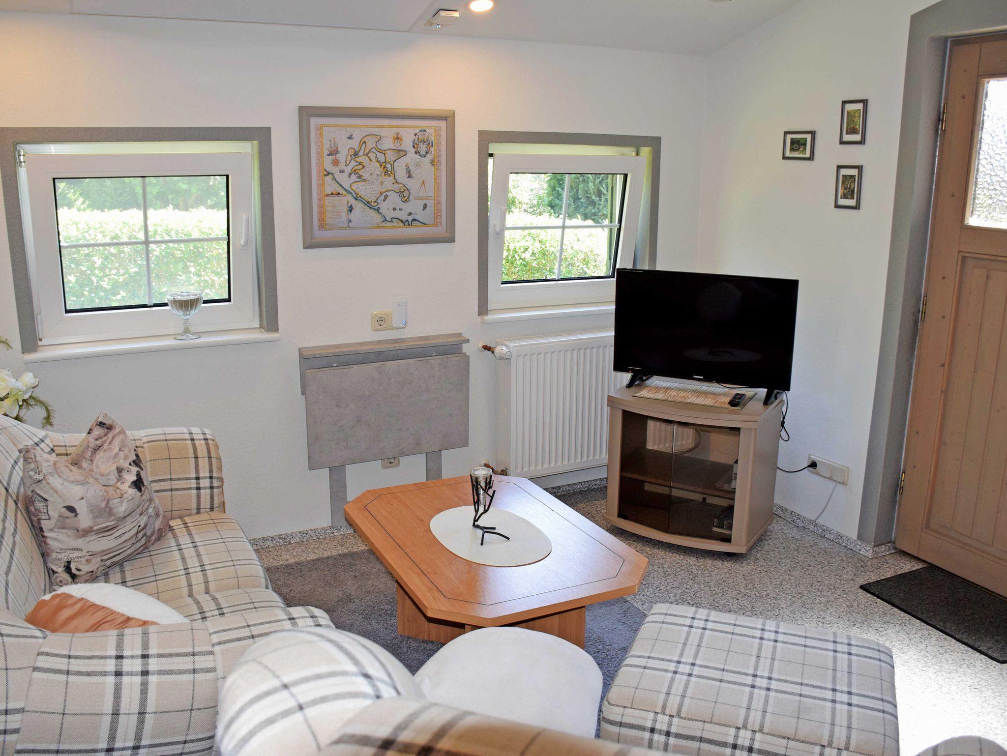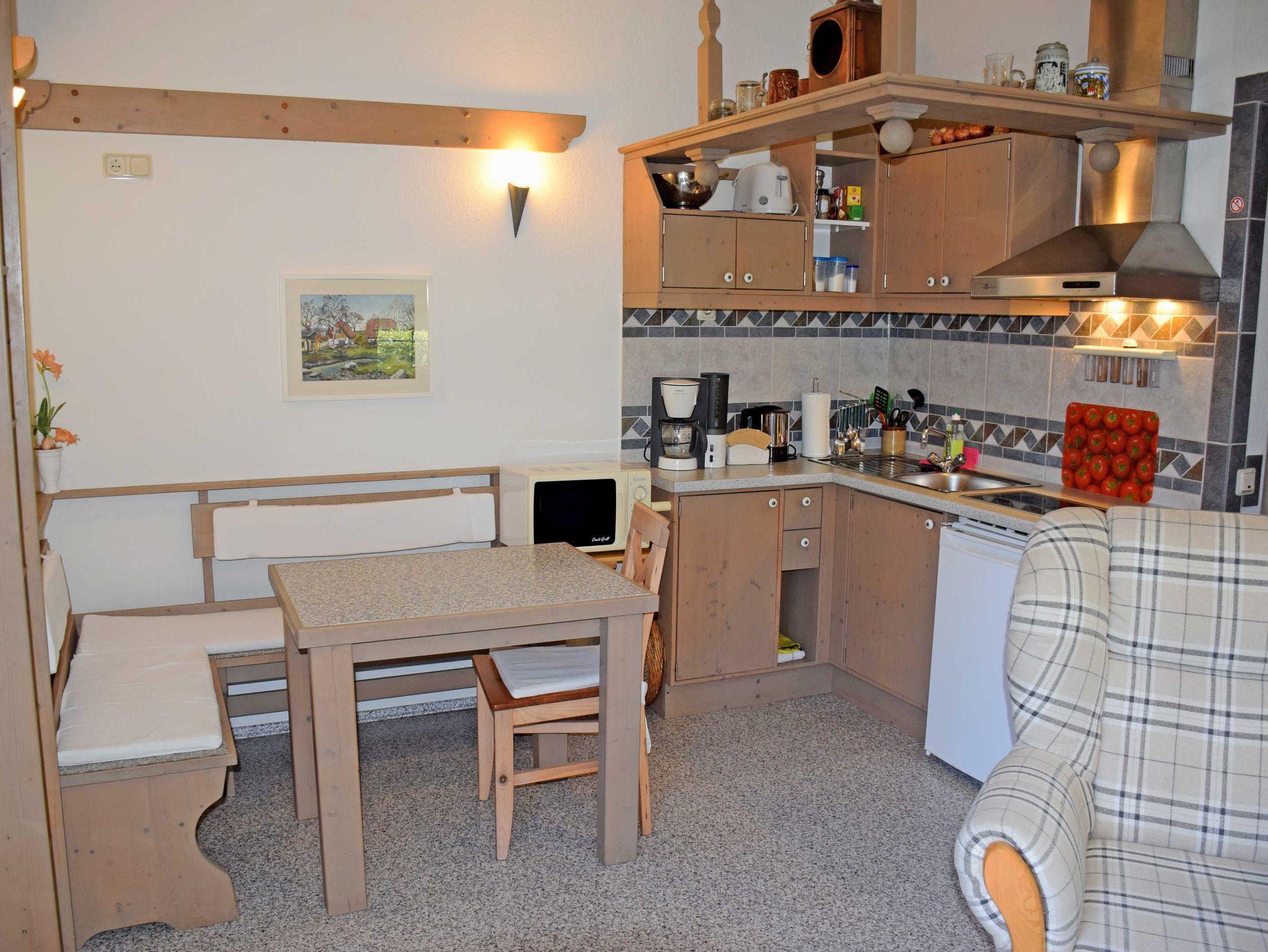 Das Ferienhaus Achtern im Grünen (30 qm, max. 2 Erwachsene, WLAN vorhanden) ist sehr gemütlich und modern eingerichtet. Zur Ausstattung im Wohnbereich gehören eine Couch mit Tisch, Flachbild-TV/Radio und Sitzecke mit Esstisch. Die Küchenzeile bietet Herd, Kühlschrank, Spüle, Kaffeemaschine, Wasserkocher und Küchenausstattung.