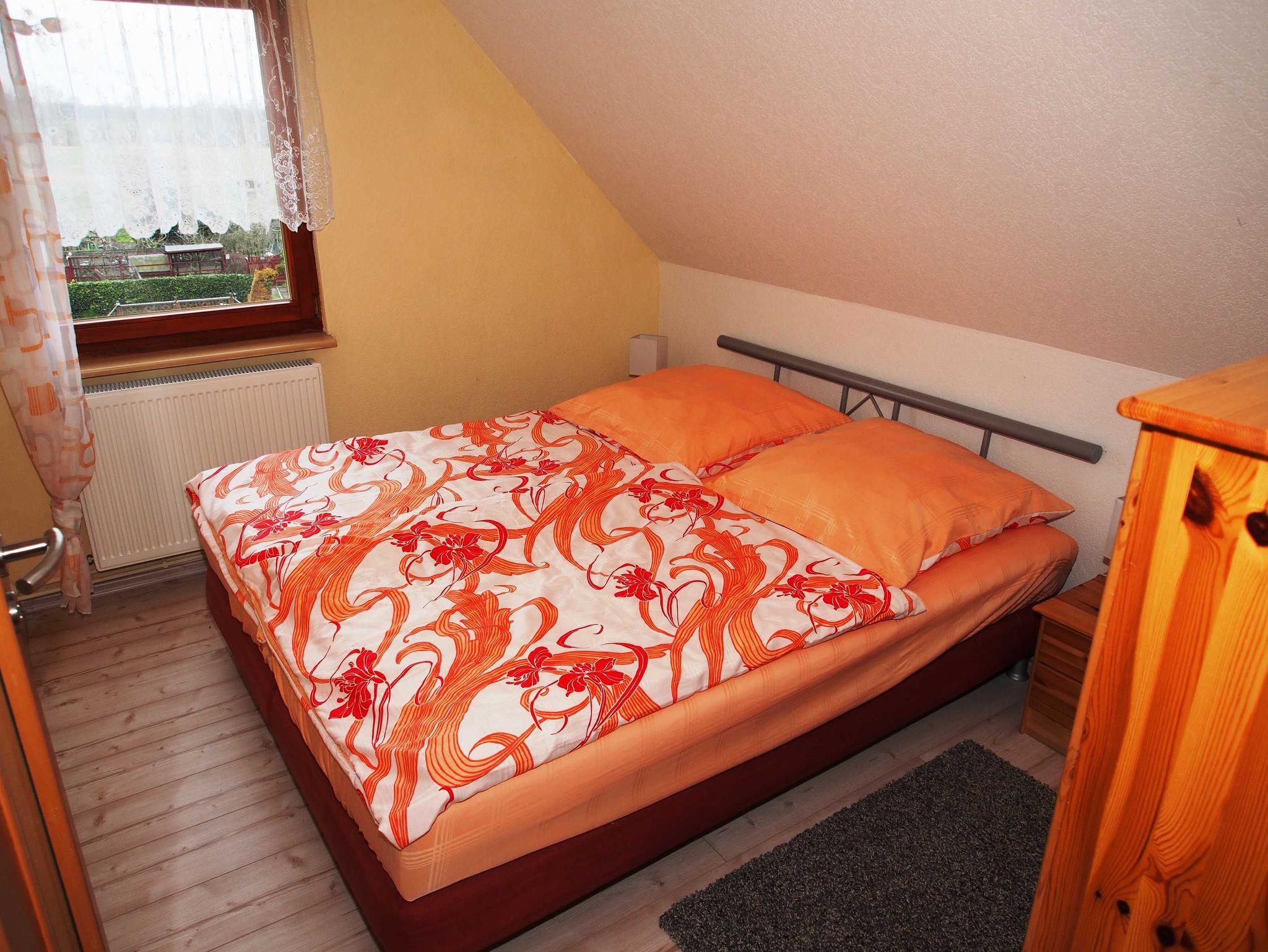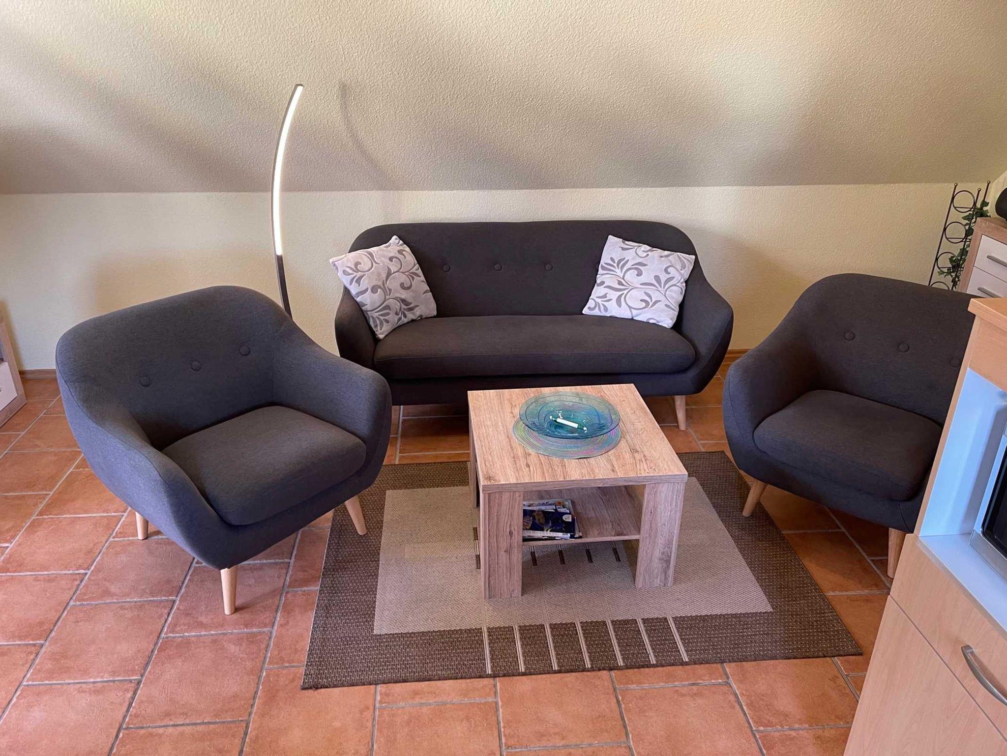 Die Ferienwohnung befindet sich im OG und ist über eine Außentreppe und den Balkon zu erreichen. Sie besteht aus einem Wohnzimmer mit Sitzgruppe, TV, der Küchenzeile mit dem Esstisch, zwei separaten Schlafzimmern mit je Doppelbetten und dem Duschbad.