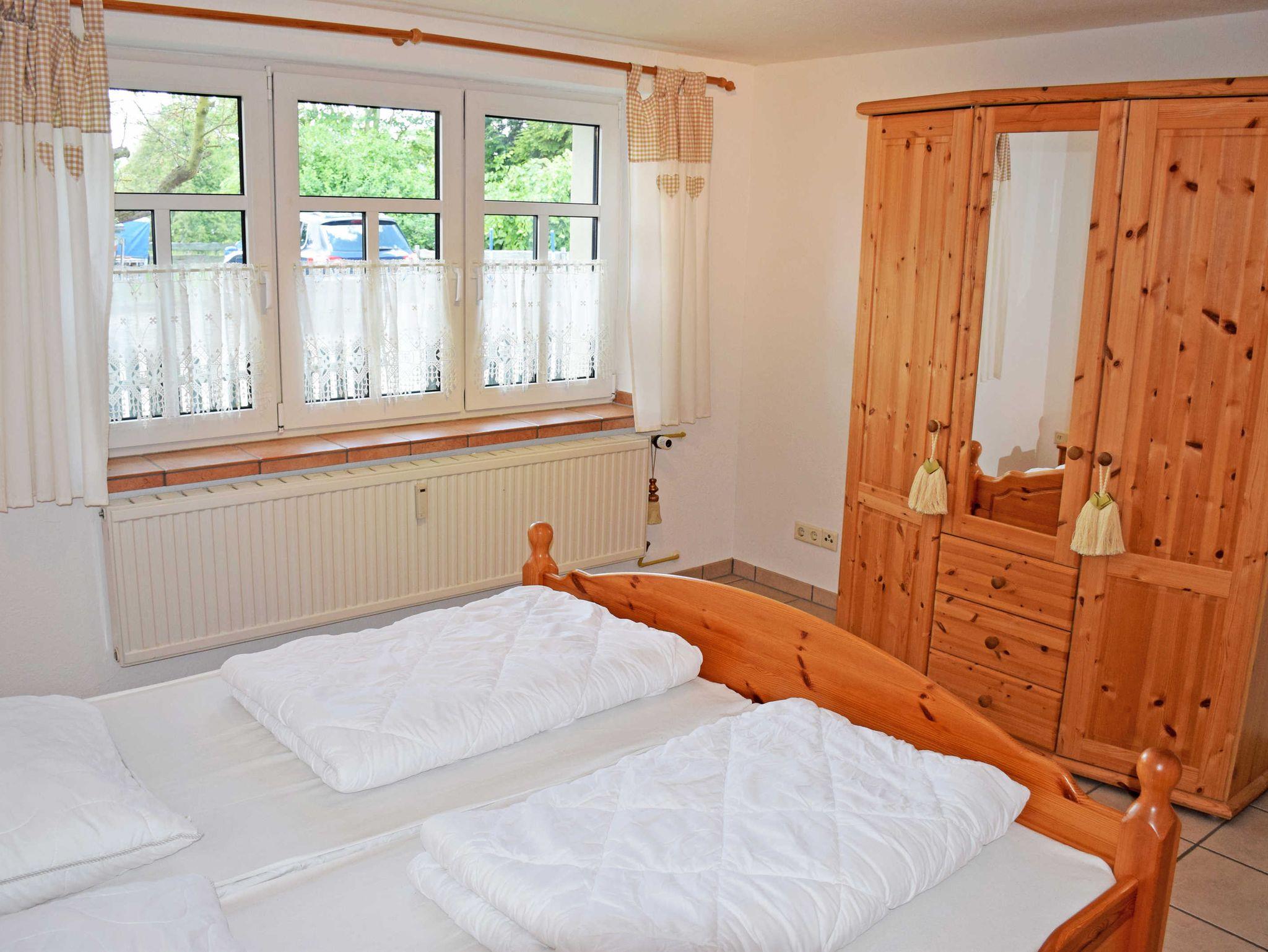 Im ersten Schlafzimmer stehen ein bequemes Doppelbett mit Nachttischen und Leselampen, sowie ein Kleiderschrank. Das zweite Schlafzimmer bietet ebenfalls ein Doppelbett an. Hinter dem Haus gibt es für diese Ferienwohnung einen großen Hofgarten mit Terrasse und Gartenmöbeln, wo man frühstücken oder abends grillen kann.