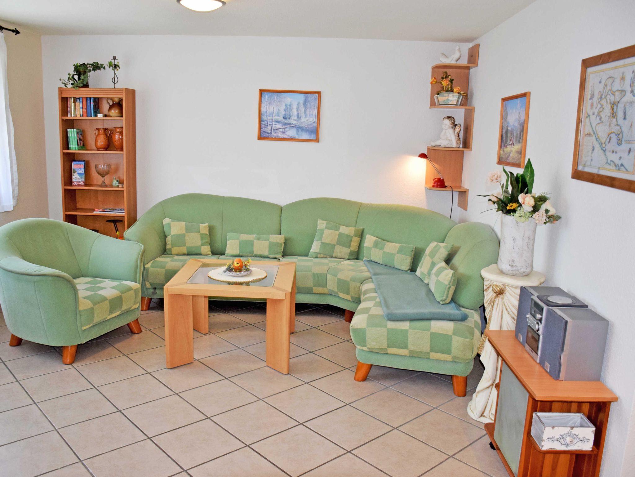 Die Ferienwohnung mit Gartenterrasse (78 qm, max. 2 Erwachsene, WLAN) ist modern und komfortabel eingerichtet. Zur Ausstattung im großzügigen Wohnbereich gehören eine Couch mit Tisch, Flachbild-TV/Radio. Der Küchenbereich verfügt über eine Sitzecke mit Esstisch.
