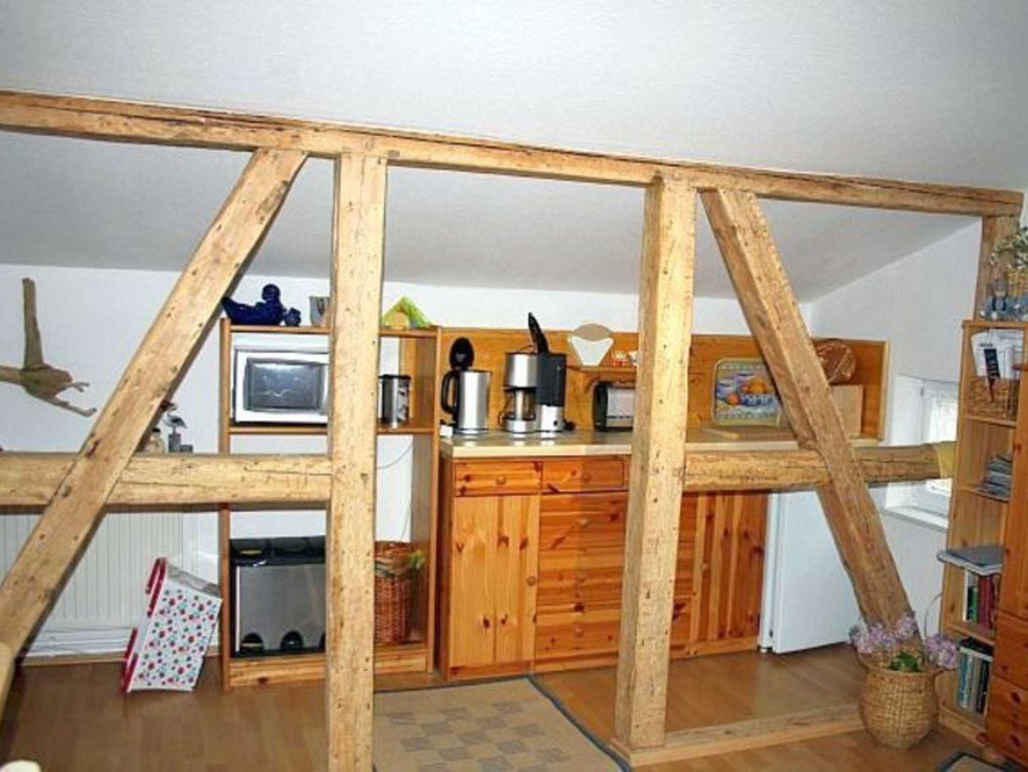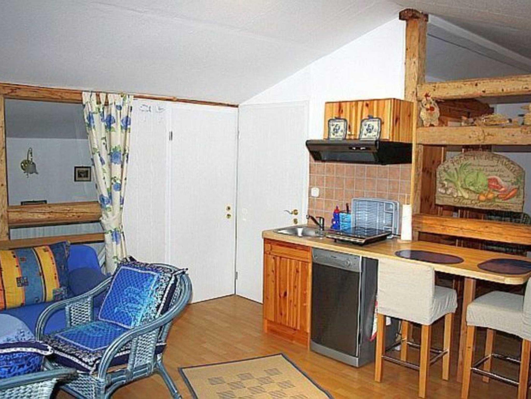 Die gemütlich eingerichtete Ferienwohnung befindet sich im Dachgeschoß und besteht aus einem kombinierten Wohn-/Schlafraum (Doppelbett und Sitzgruppe) mit einer Küchenzeile und dem Duschbad. Sie ist, wegen der offenen Treppe, für Kinder unter 10 Jahren nicht geeignet.
