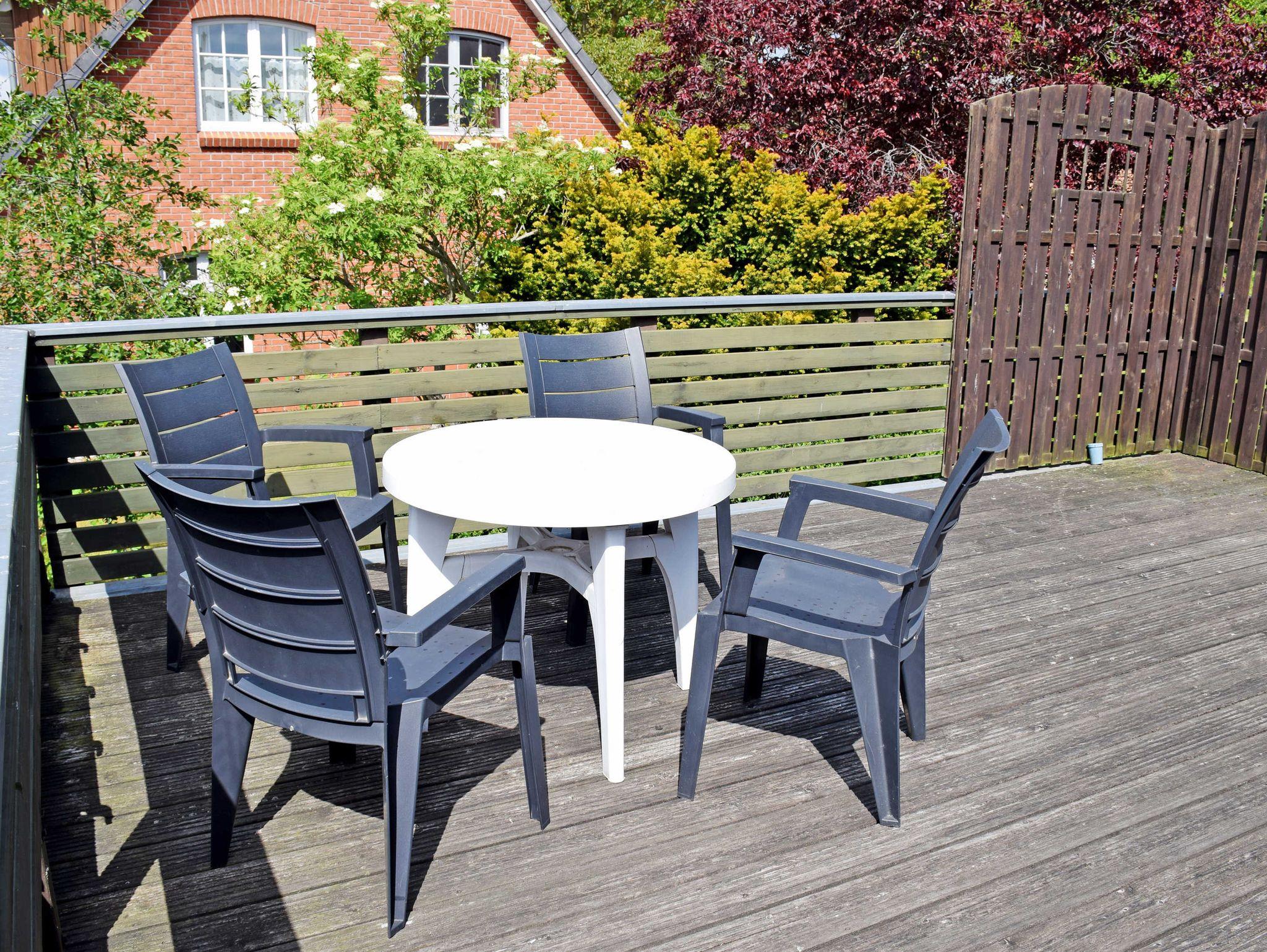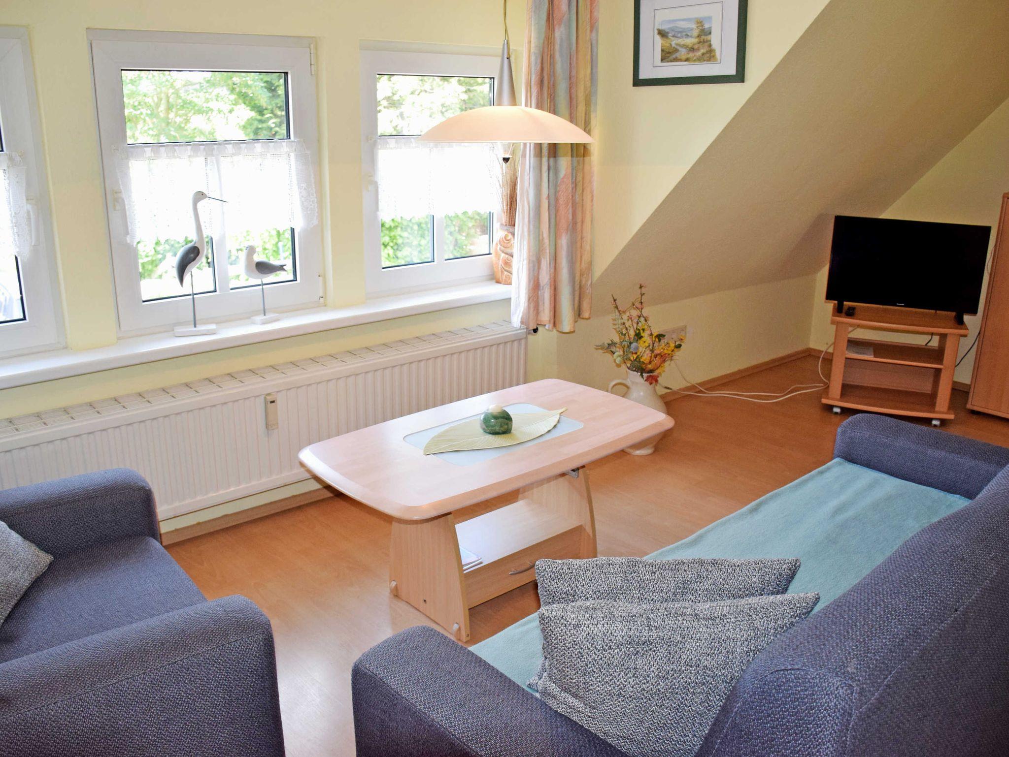 Die Ferienwohnung mit Sonnenterrasse (78 qm, max. 2 Erwachsene, WLAN) ist modern und komfortabel eingerichtet. Über eine Außentreppe gelangt man in diese im Obergeschoss liegende Ferienwohnung. Zur Ausstattung im großzügigen Wohnbereich gehören eine Couch mit Tisch, Flachbild-TV/Radio.