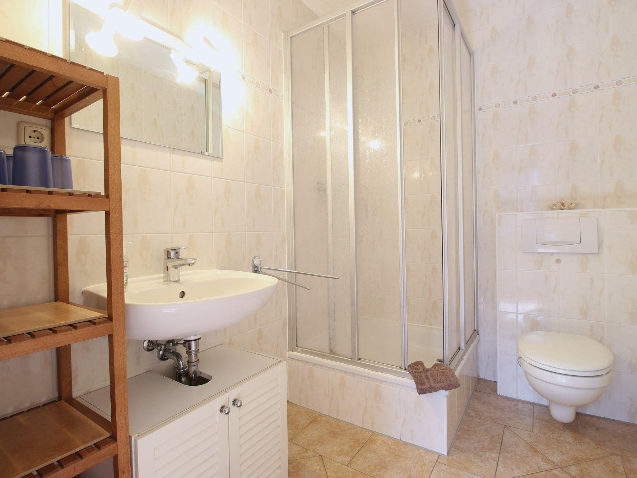 • Bad mit Dusche, Waschbecken, WC