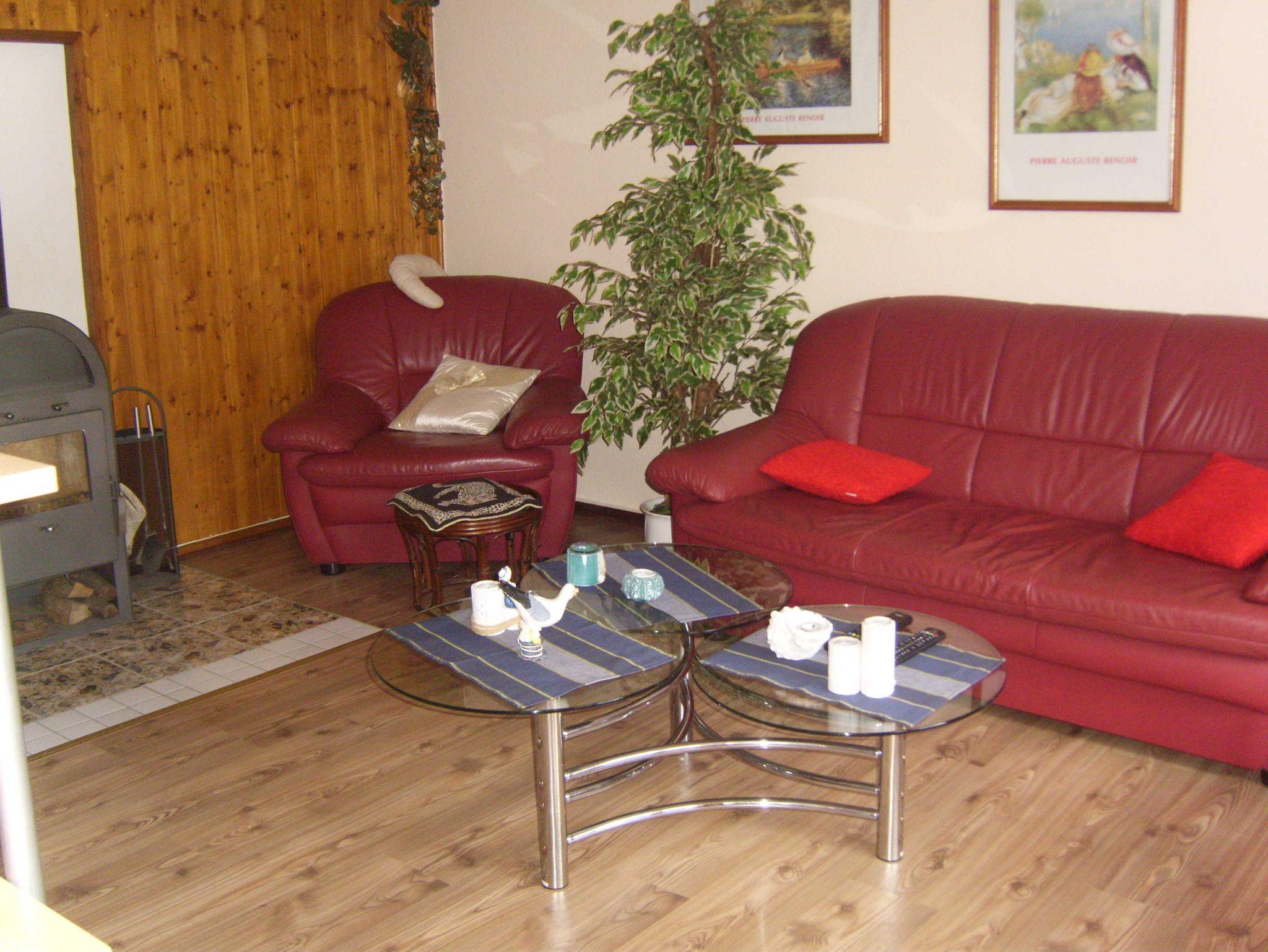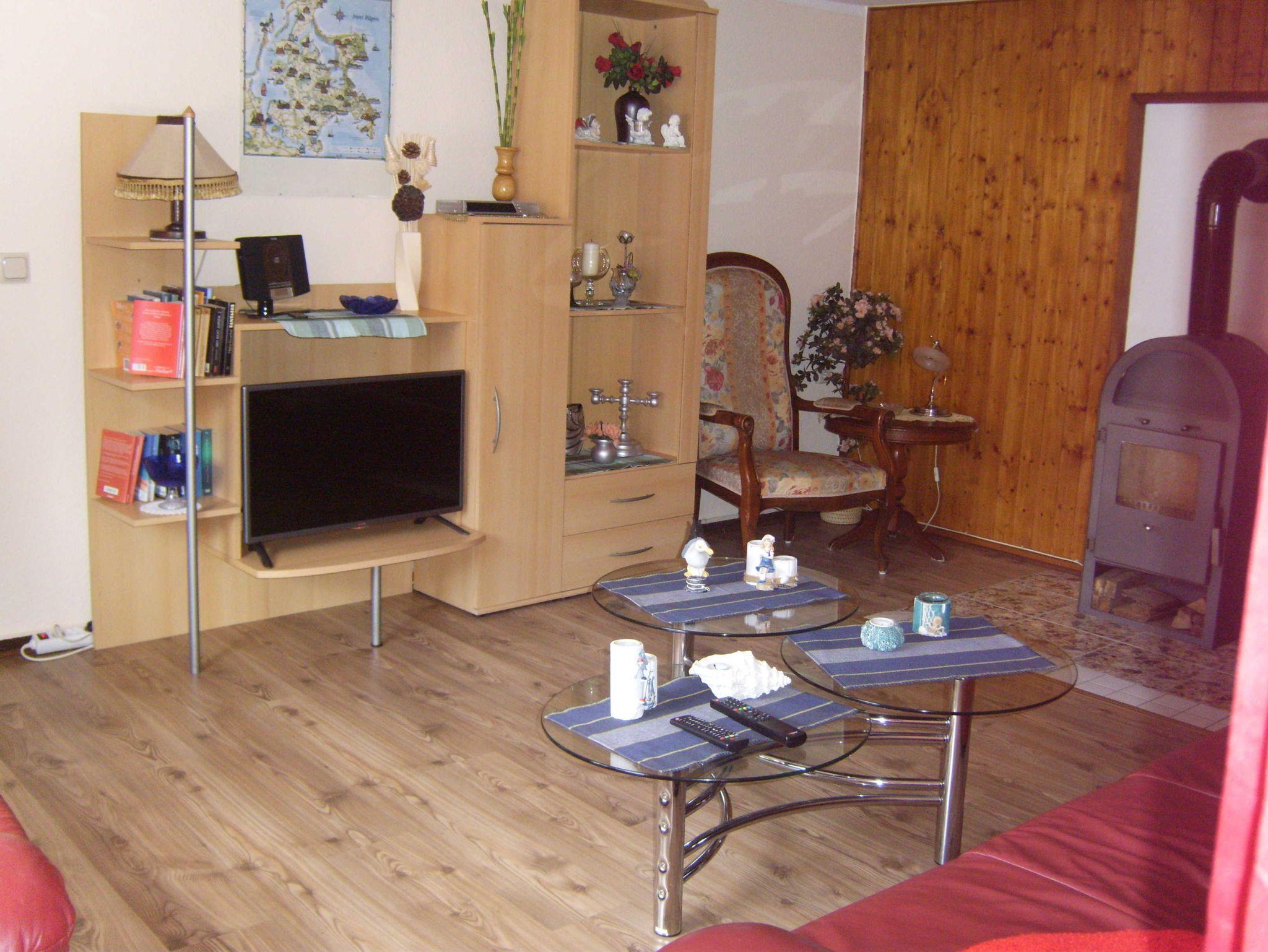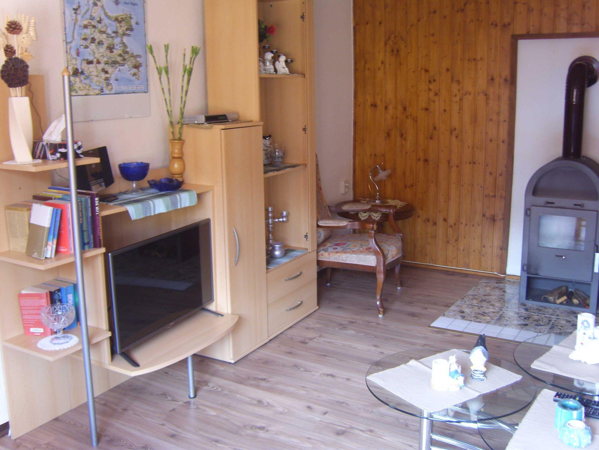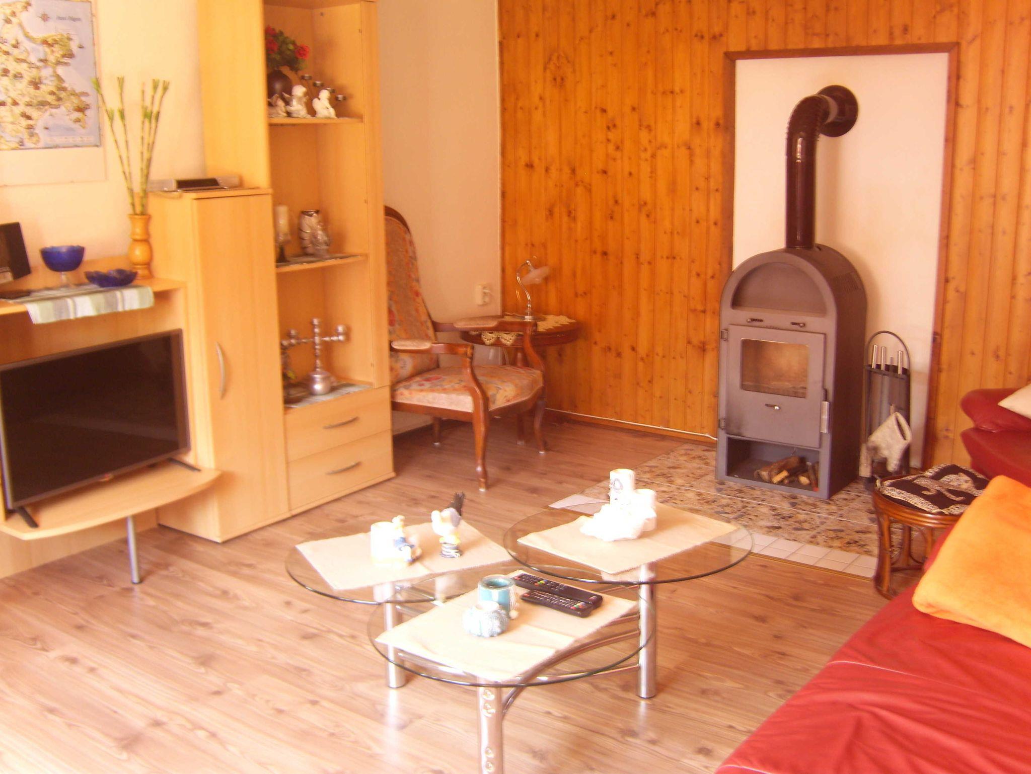 Ausstattung: 1 Wohnzimmer und Sitzgarnitur, eine Anbauwand, ein Dreiersofa, ein Zweier und ein Sessel mit Tisch. Einen Fernseher mit Sat.-Empfang stellen wir ebenfalls zur Verfügung. Sollte es abends mal etwas kühler werden, werden Sie vom Kaminofen gewärmt. 1 Schlafzimmer mit Doppelbett und Sofa zum Aussziehen (Aufbettung), 1 Küche - vorhanden sind eine Kaffeemaschine, ein Toaster, eine Kochgelegenheit, eine Mikrowelle, ein Kühlschrank, Geschirr sowie eine Spüle. Dusche und WC.