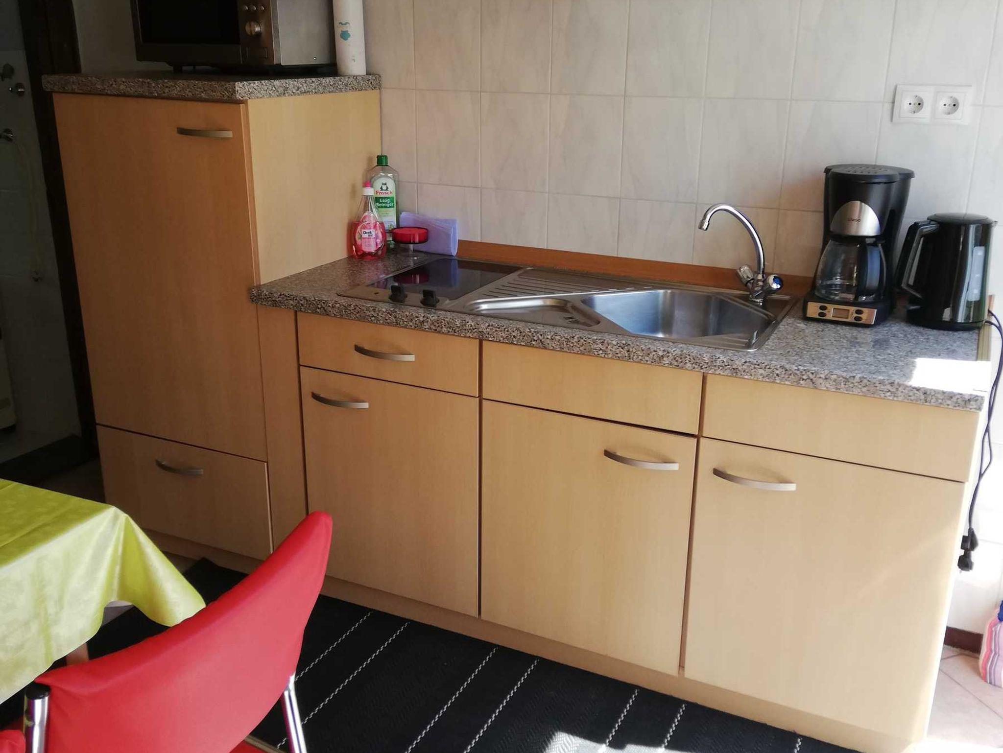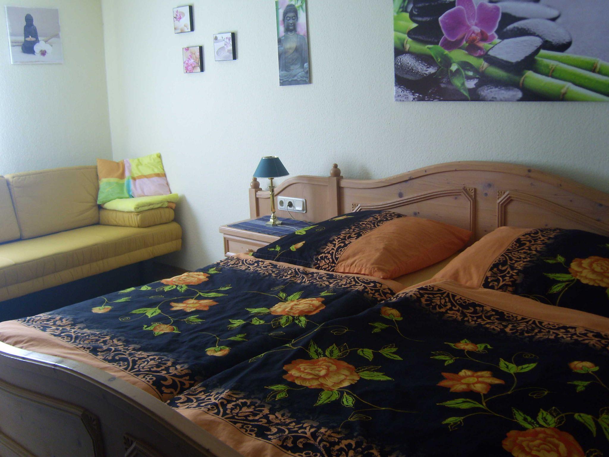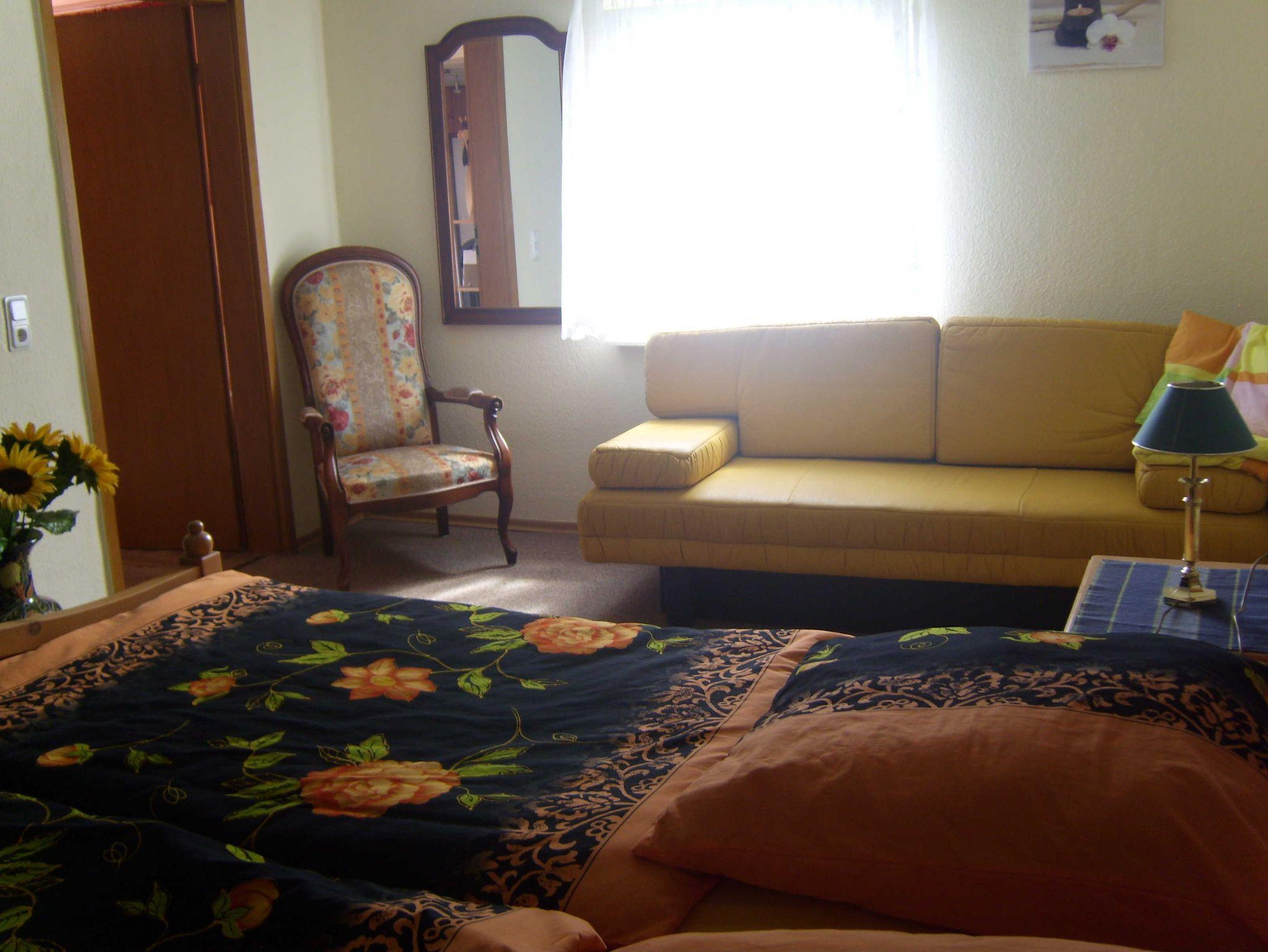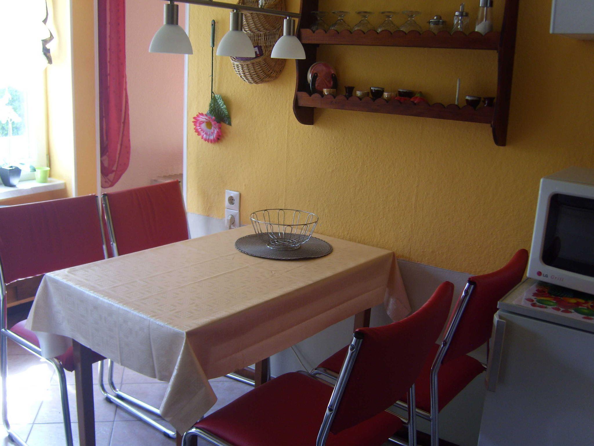 Ausstattung: 1 Wohnzimmer und Sitzgarnitur, eine Anbauwand, ein Dreiersofa, ein Zweier und ein Sessel mit Tisch. Einen Fernseher mit Sat.-Empfang stellen wir ebenfalls zur Verfügung. Sollte es abends mal etwas kühler werden, werden Sie vom Kaminofen gewärmt. 1 Schlafzimmer mit Doppelbett und Sofa zum Aussziehen (Aufbettung), 1 Küche - vorhanden sind eine Kaffeemaschine, ein Toaster, eine Kochgelegenheit, eine Mikrowelle, ein Kühlschrank, Geschirr sowie eine Spüle. Dusche und WC.