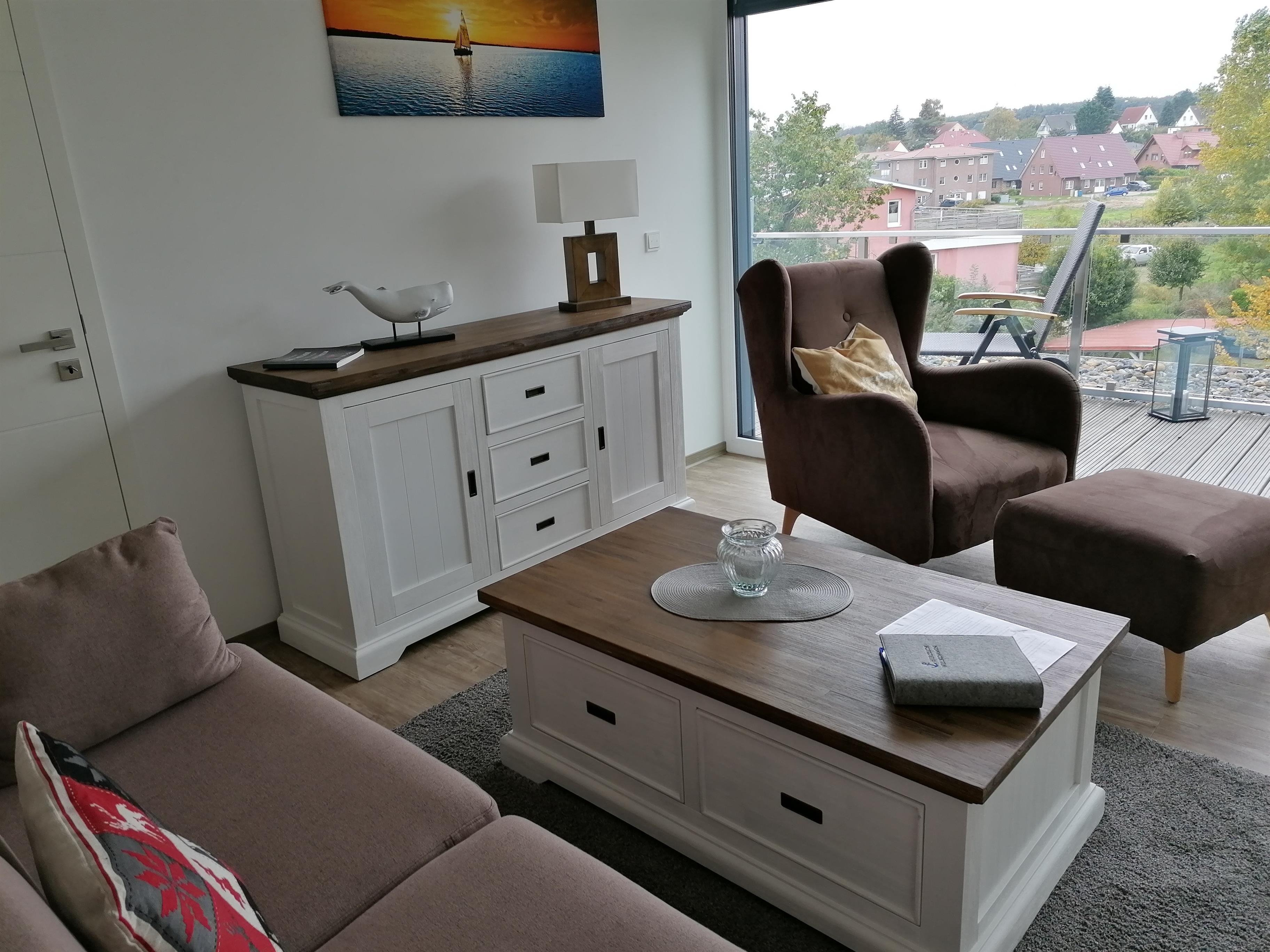 Im Wohnbereich im Obergeschoss erwartet Sie ein gemütliches Sofa (mit Schlaffunktion und Lattenrost), zwei bequeme Lesesessel und ein großer Flachbildfernseher – das Highlight aber ist das Panoramafenster, das Ihnen einen herrlichen Blick auf die Umgebung und den Hafen eröffnet.