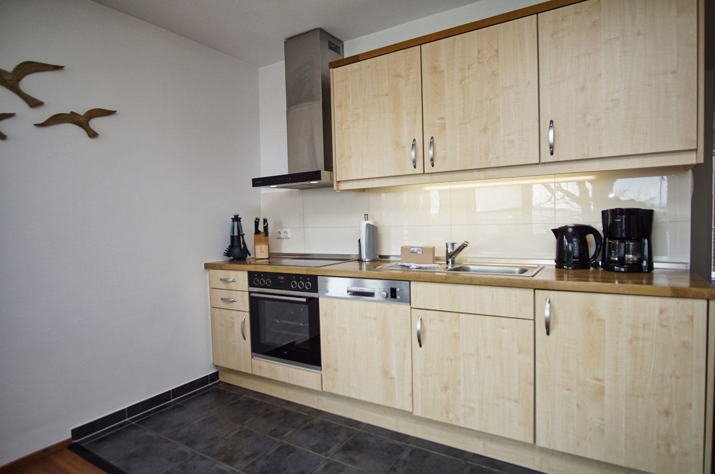 KÜCHE // Küchenzeile, 4-Platten Ceranherd, Spülmaschine, Kühlschrank mit Gefrierfach, Backofen, Toaster, Wasserkocher, Kaffeemaschine, reichlich Besteck, Geschirr und Küchenutensilien ++