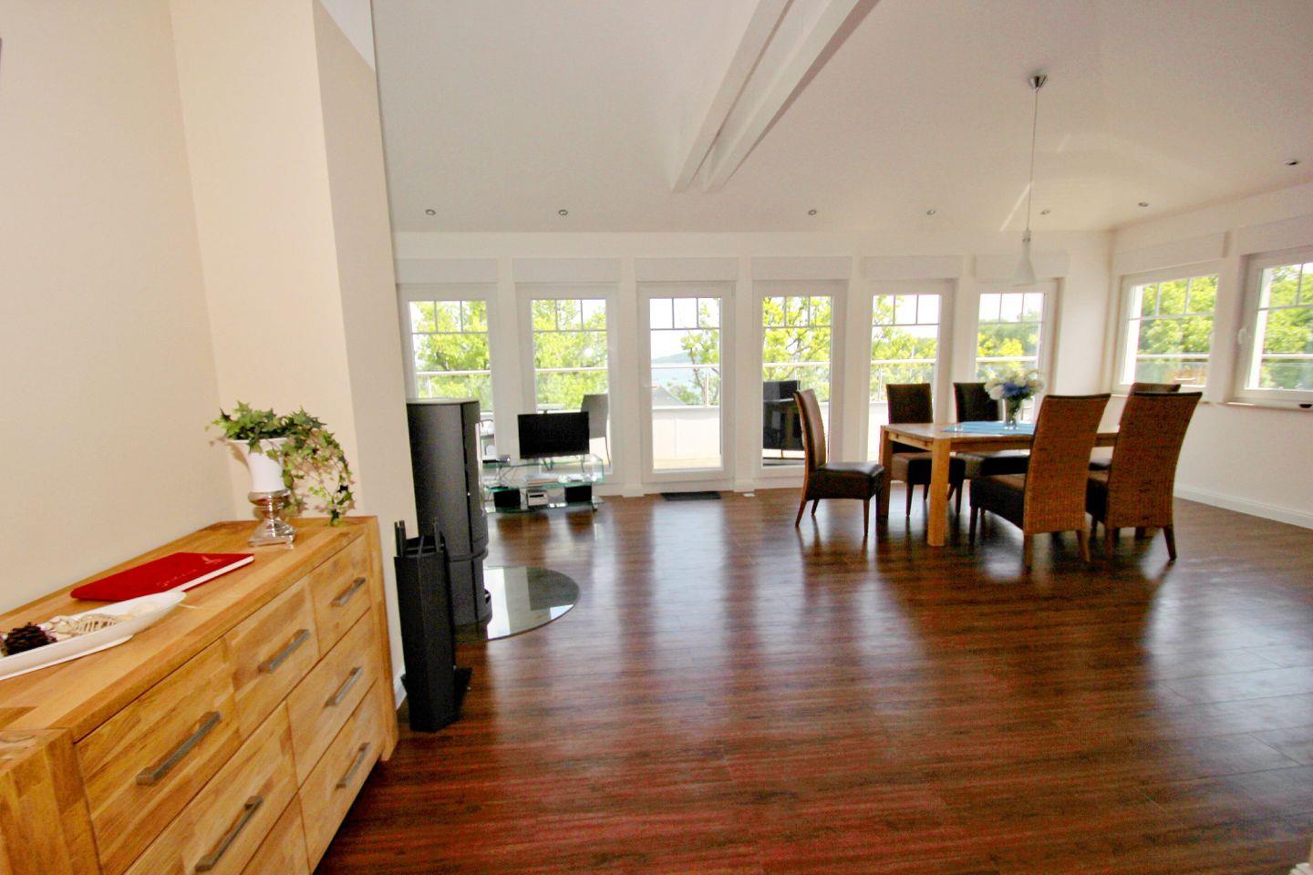 WOHNEN // Wohnraum mit Essbereich, Sitzgarnitur mit bequemer Couch, Kaminofen, Flachbild-TV (Kabel), Radio ++