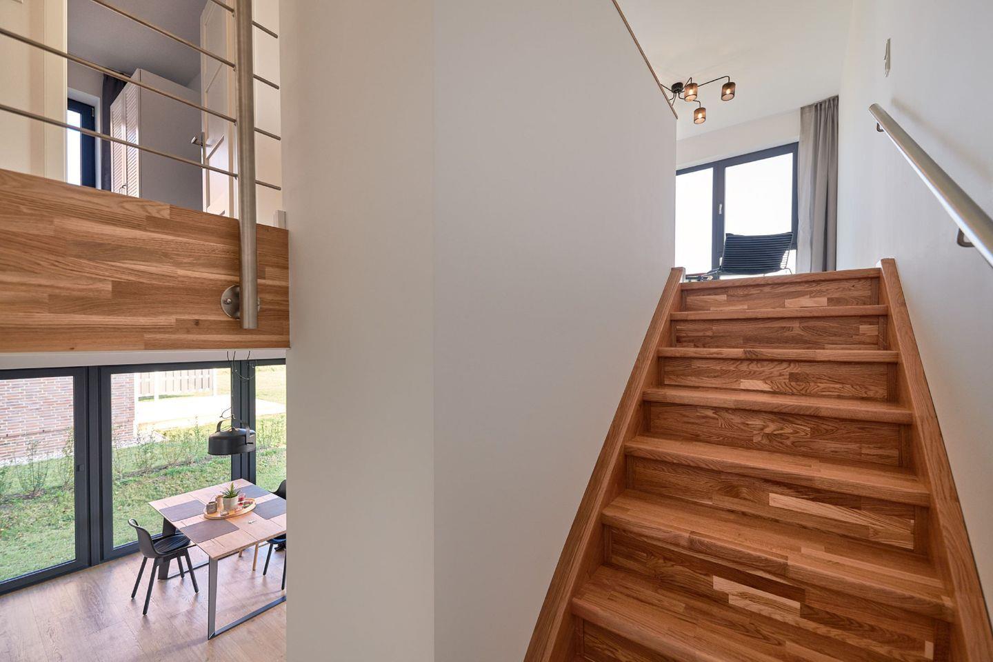 Klare Linien, eine typische Fassade, große Fensterflächen und eine stimmige Inneneinrichtung lassen keine Wünsche offen. In jeder Haushälfte stehen auf zwei Geschossen eine Wohnfläche von ca.100 qm zur Verfügung. Im Erdgeschoss gibt es ein Wohn-/Essbereich mit offener Küche, bestehend aus Küchenzeile und Küchenblock, sowie eine Sauna und ein Kamin. Großzügige Fensterfronten, die auf der Rückseite auf eine große zur Südseite hinausliegende Terrasse führen, bieten einen herrlichen Blick auf das Wasser. Im Erdgeschoss befinden sich ferner jeweils ein Gäste-WC und eine offene Garderobe. Im Obergeschoss, welches man über eine Eichenholztreppe erreicht, liegen jeweils zwei Schlafzimmer, ein Bad mit Badewanne und Dusche sowie eine Galerie mit Wasserblick. Die gesamte Wohnung ist mit einer Fußbodenheizung ausgestattet.