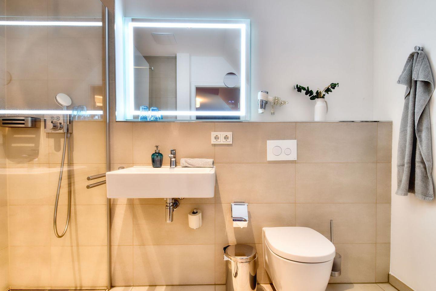 Badezimmer: Das moderne Badezimmer verfügt über eine Dusche, ein Waschbecken und eine Toilette. Handtücher und grundlegende Toilettenartikel sind für Sie bereitgestellt.