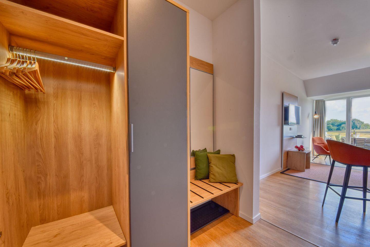 Im gemütlich ausgestatteten Apartment erwartet Sie ein großzügiges Doppelbett. Hier können Sie nach einem erlebnisreichen Tag entspannen, TV schauen oder vom Balkon aus den Blick in die Natur genießen. Zudem steht Ihnen ein kleiner Schreibtisch zur Verfügung.