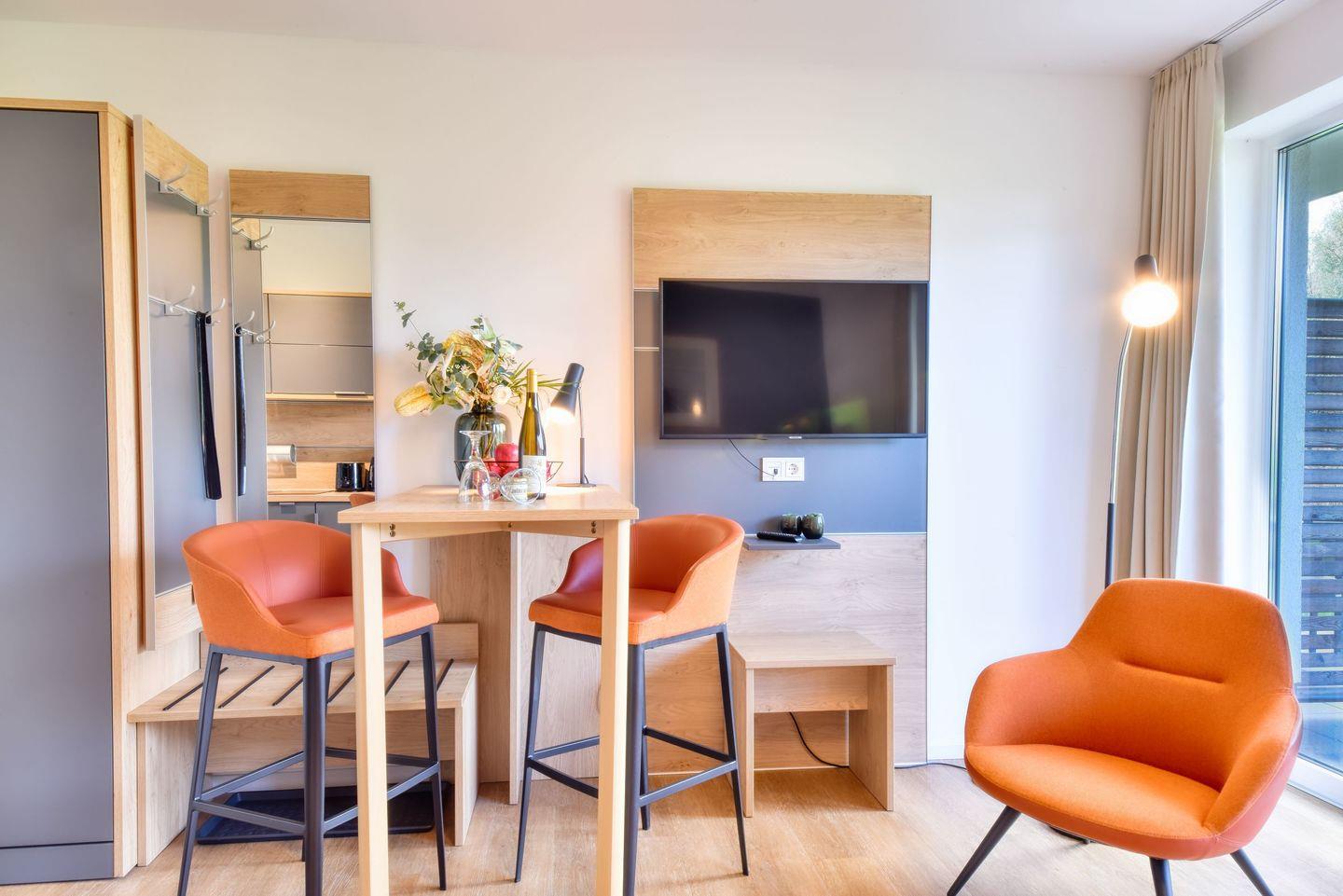 Wohnzimmer: Im gemütlichen Wohnzimmer erwartet Sie ein großzügiges Doppelbett, Hier können Sie nach einem erlebnisreichen Tag entspannen, TV schauen oder einfach den Blick in die Natur genießen.