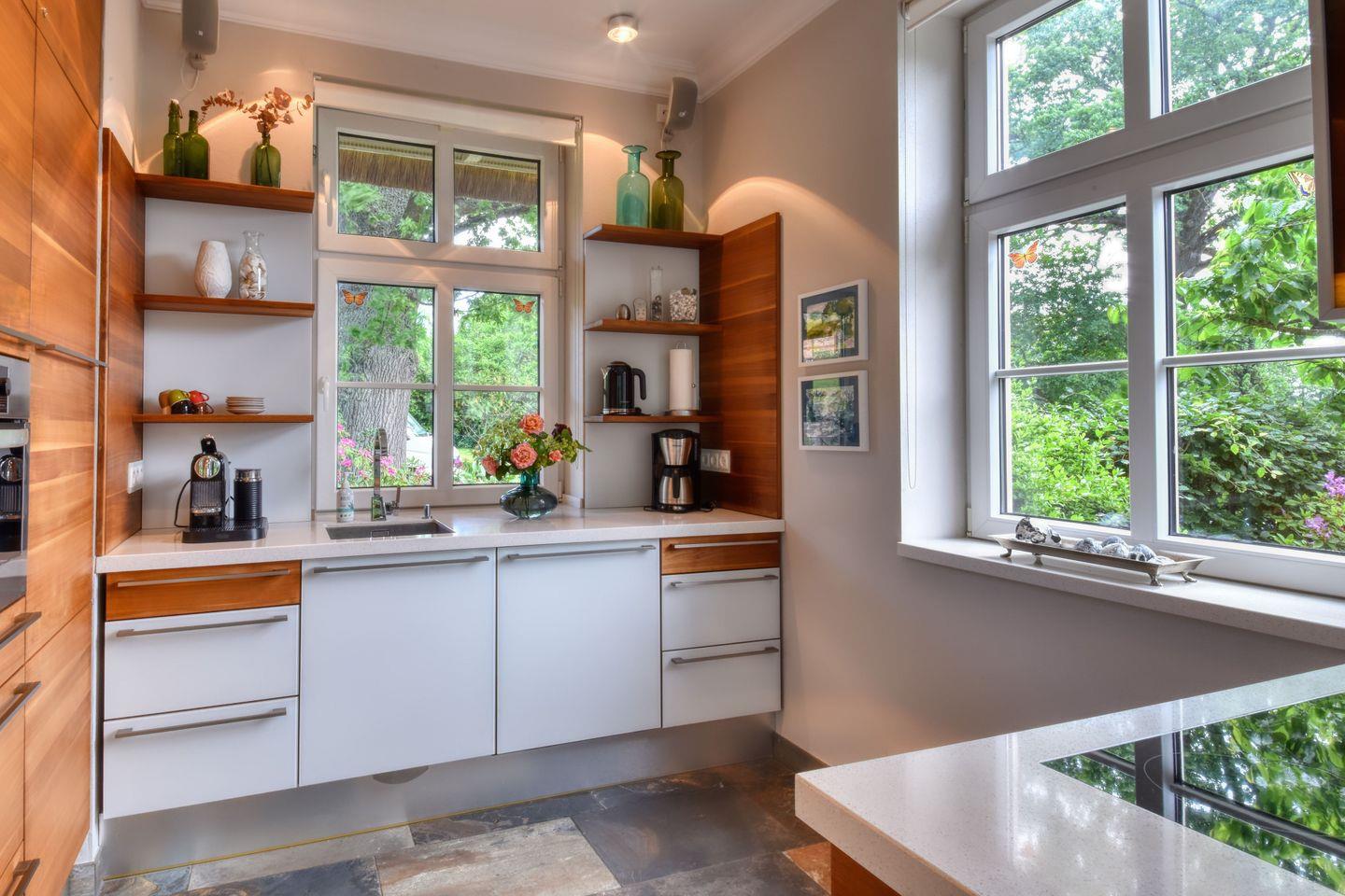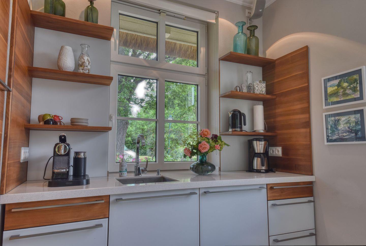 In der offenen Wohnküche bietet ein Schwedenofen die Möglichkeit für gemütliche Abende. Hervorzuheben ist die schnelle Internetverbindung über Starlink, die jederzeit eine Nutzung als Homeoffice möglich macht. Die fantastische Lage mit drei Terrassen und einem wunderschönen Garten bietet Ausblicke auf den Greifswalder Bodden und die romantische Landschaft. Urlaub machen wie in Ballerbü