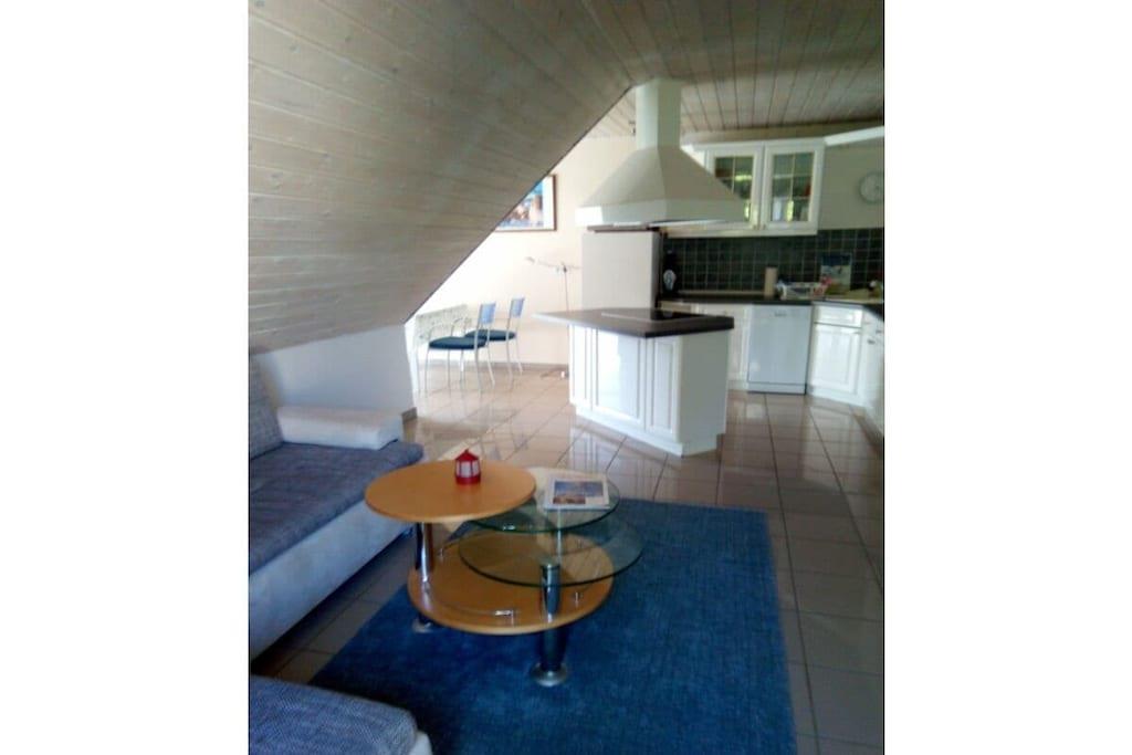 Dachgeschoss: (Wohn/Esszimmer(, Schlafcouch 1 Pers., TV, Esstisch, DVD-Spieler, CD-Spieler, Kochplatte, Wasserkocher, Toaster, Kaffeemaschine, Backofen, Mikrowelle, Spülmaschine, Kühlschrank, Tiefkühlschrank, Fliegenfenster, ), Schlafzimmer(, , , Doppelbett, Fliegenfenster), Badezimmer(, Toilette, Dusche, Waschbecken, Föhn)) , , Internet, Erste-Hilfe-Station, Balkon(Gartenmöbel), Heizung(Zentral), Parkplatz, Bügelbrett, Bügeleisen, Trockenschrank