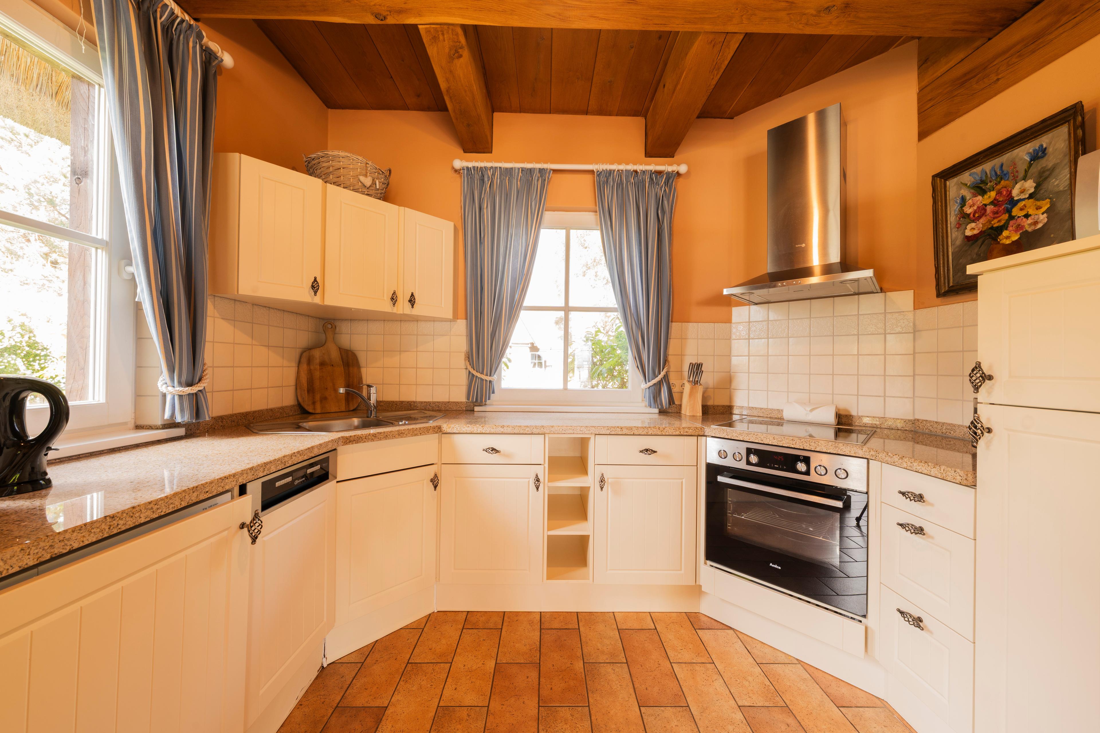 Voll ausgestattete Komfortküche: Spülmaschine, Waschmaschine, Backofen, Kaffeemaschine, Mikrowelle und Toaster