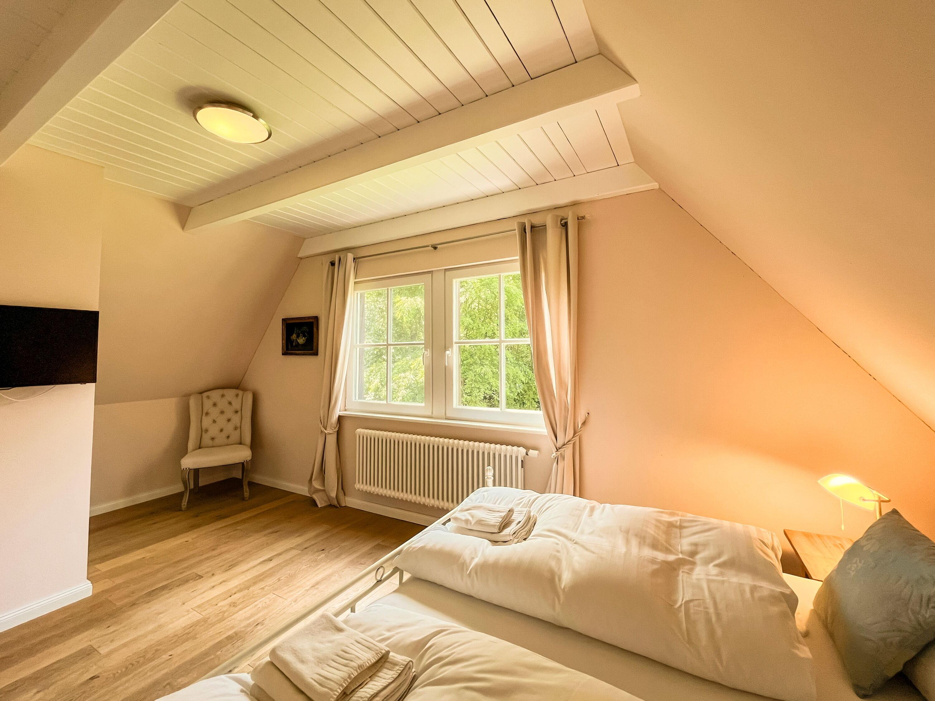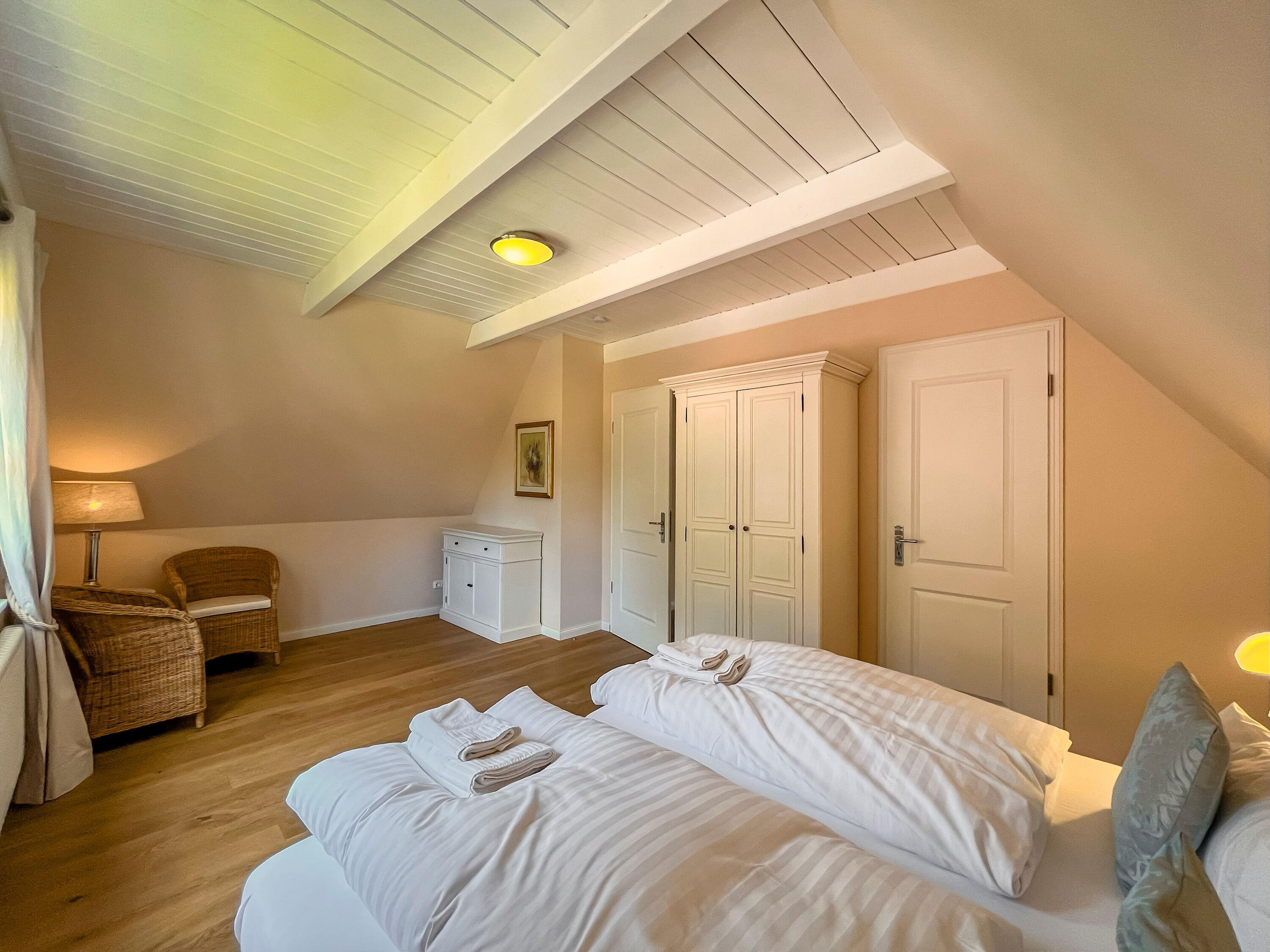 Zwei Schlafzimmer mit komfortablen Doppelbetten, eines davon ausgestattet mit TV. Der Zugang zur Schlafgalerie im Dachgeschoss erfolgt über eine innenliegende Treppe innerhalb eines der Schlafzimmer.