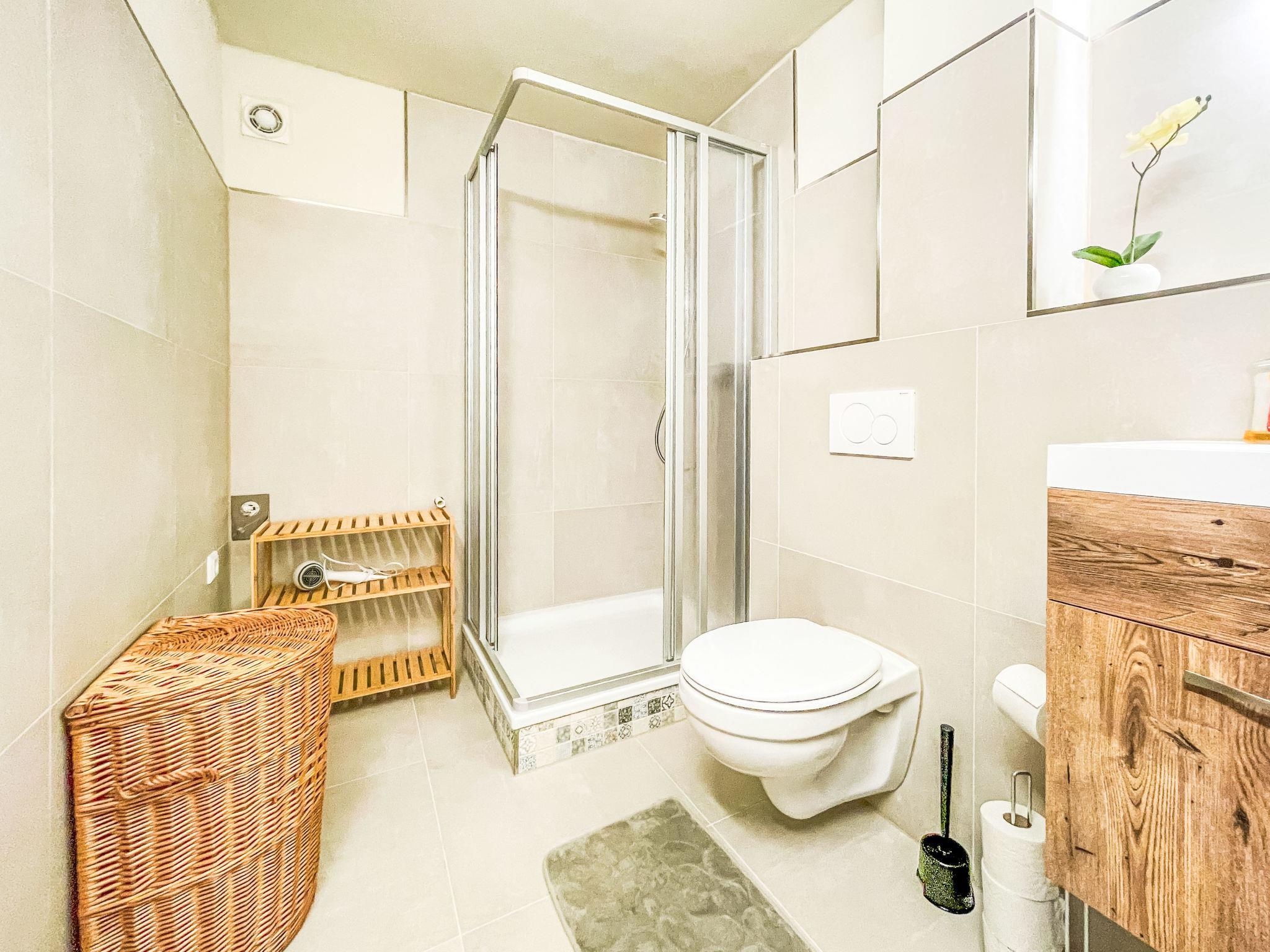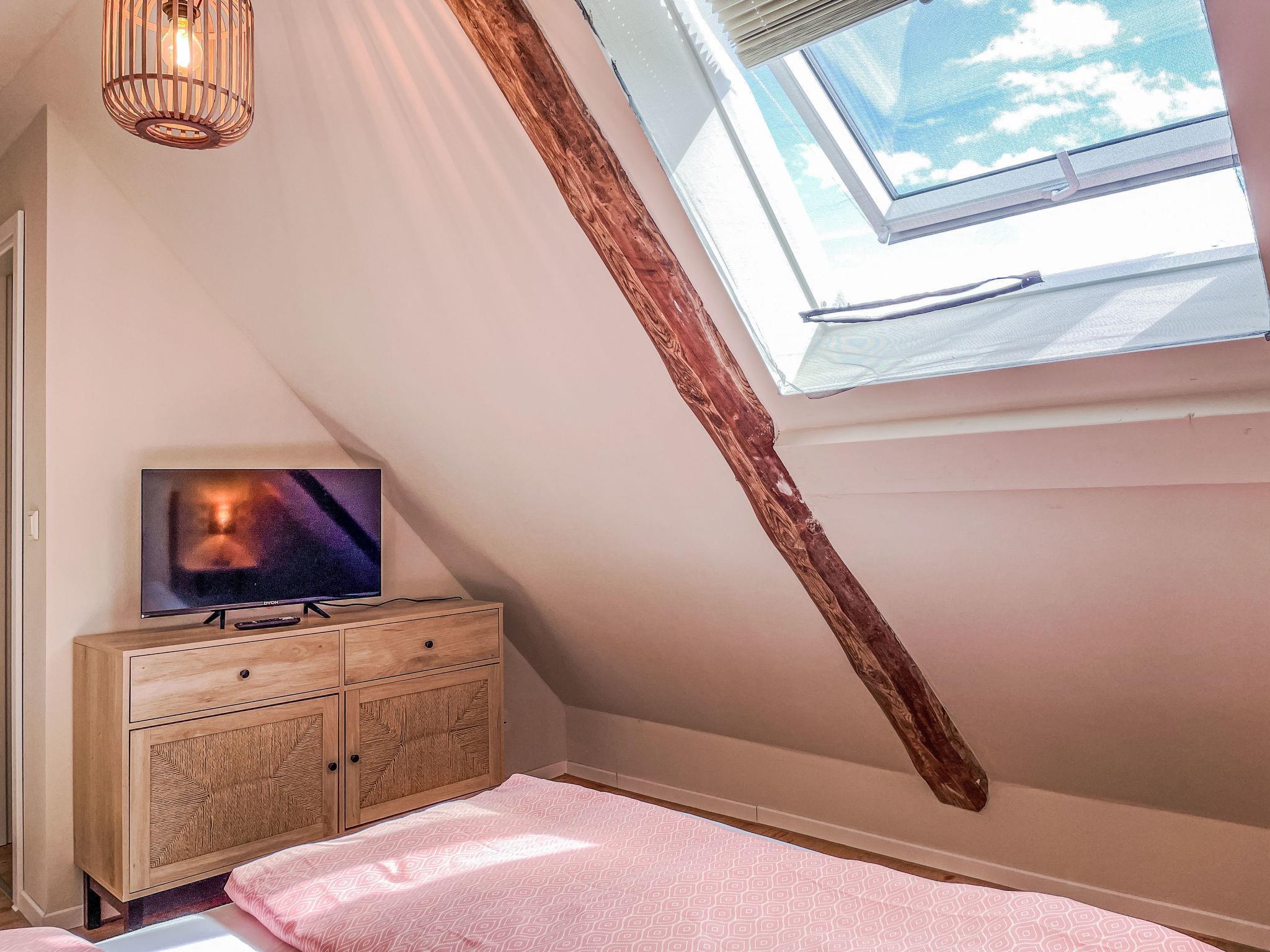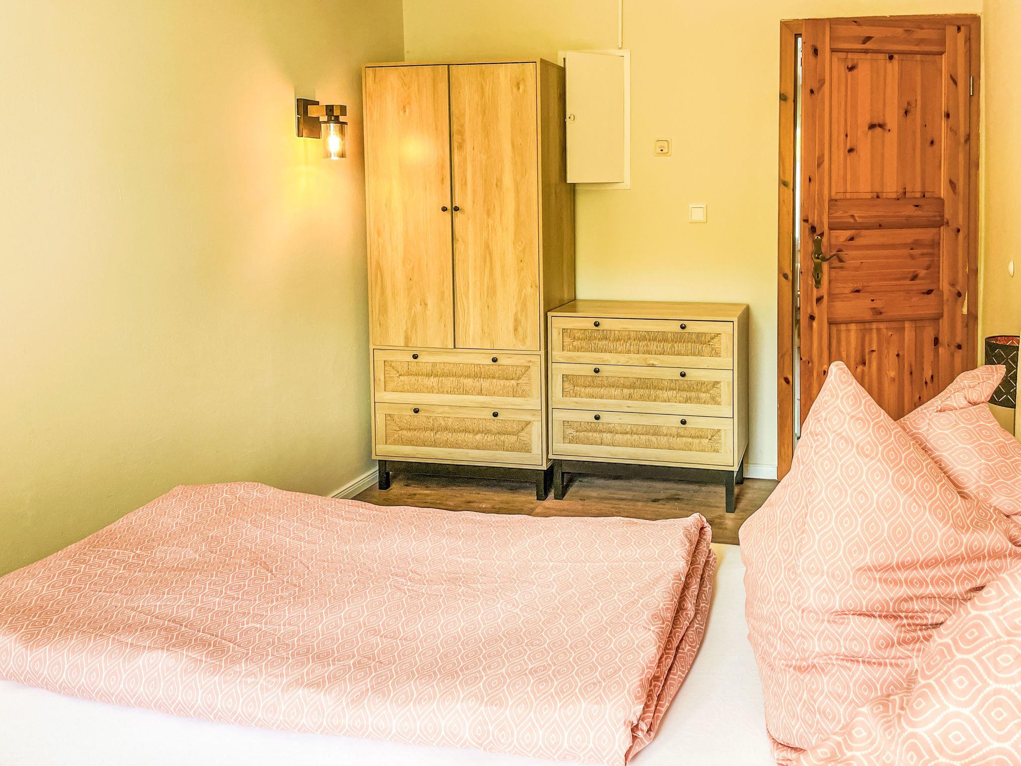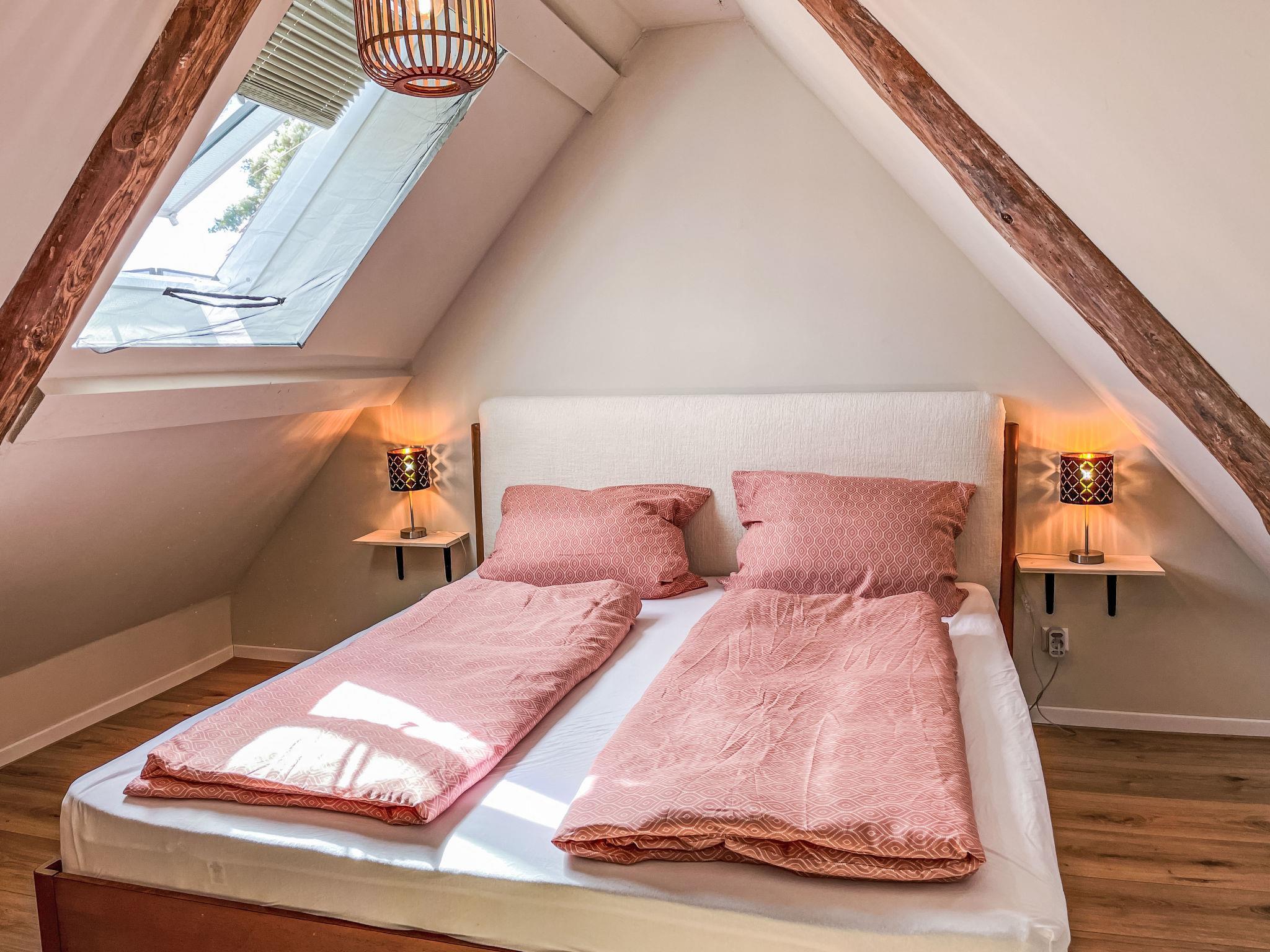 4-Zimmer-Doppelhaushälfte 120 m2 auf 2 Stockwerken. Geräumig, teilweise abgeschrägt, gemütlich und mit viel Holz eingerichtet: Eingang mit Schwedenofen. 2 Zimmer, jedes Zimmer mit 1 Doppelbett (180 cm, Länge 200 cm). Grosse, offene Küche (Backofen, Geschirrspüler, 4 Glaskeramikplatten, Toaster, Wasserkocher, Tiefkühler, elektrische Kaffeemaschine) mit Esstisch. Ausgang zum Garten, zur Terrasse. Dusche/WC. Obergeschoss: grosses Wohnzimmer mit Sat-TV (Flachbildschirm). Dusche/WC. 2. Obergeschoss: (steile Treppe) 1 abgeschrägtes Zimmer mit Dachfenster mit 1 Doppelbett (160 cm, Länge 200 cm). Grosse Terrasse 28 m2. Terrassenmöbel, Gartengrill. Zur Verfügung: Waschmaschine, Kinderhochstuhl. Internet (WLAN, gratis). Parkplatz beim Haus. Bitte beachten: geeignet für Familien. Nichtraucher-Haus.
