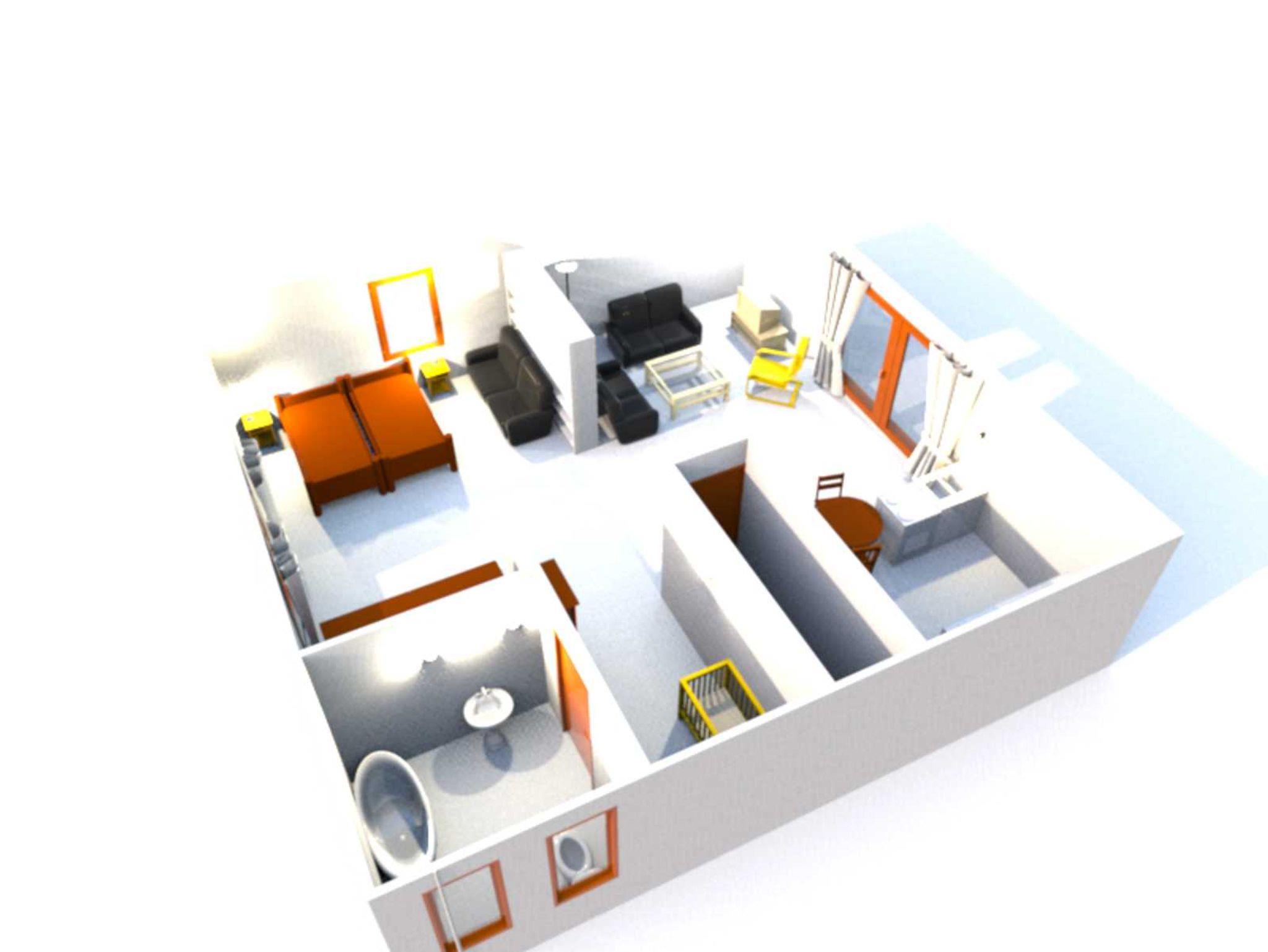 Neben einem großzügigen Wohnbereich, einem Schlafbereich für 3 Personen mit zwei Boxspringbetten (wahlweise als Doppel- oder Twinbed buchbar) und einer Schlafcouch sowie einer offenen Küche liegt das separate Tageslicht-Bad mit Badewanne.