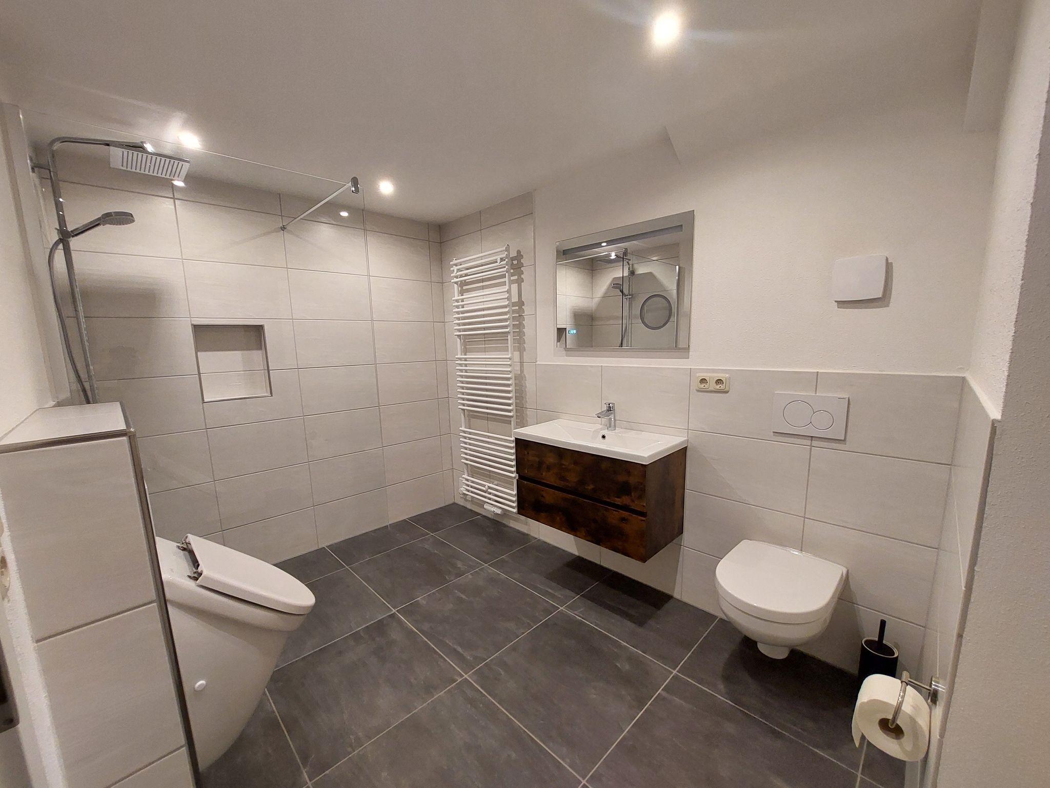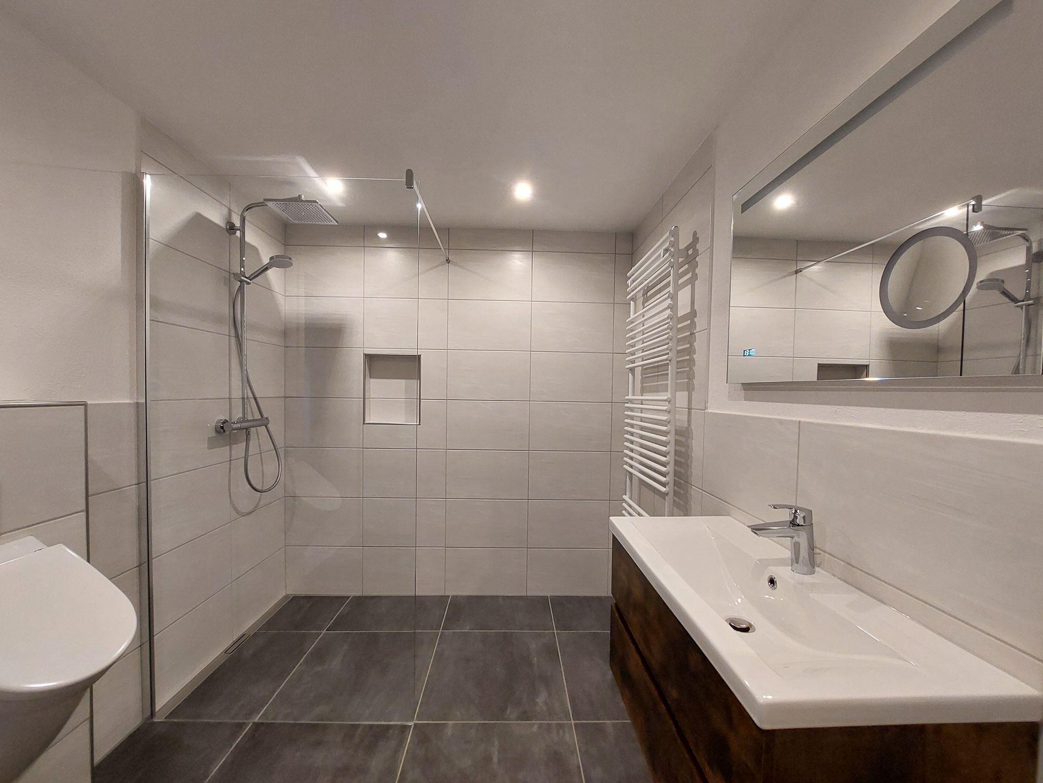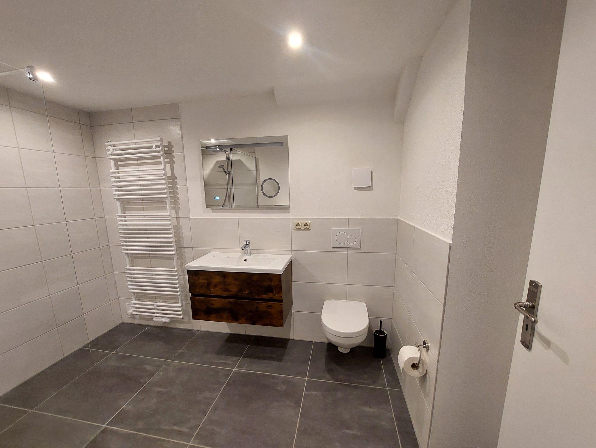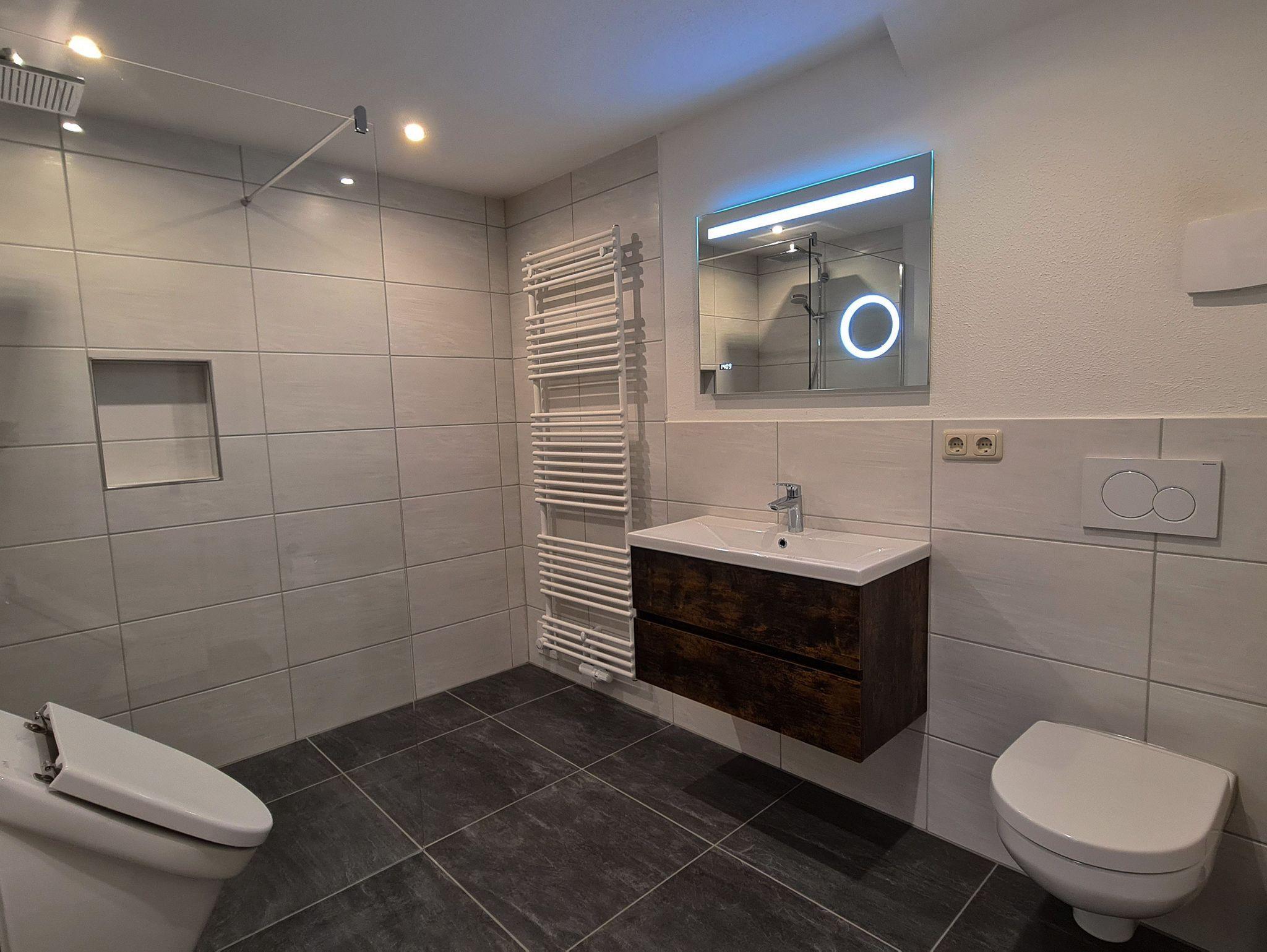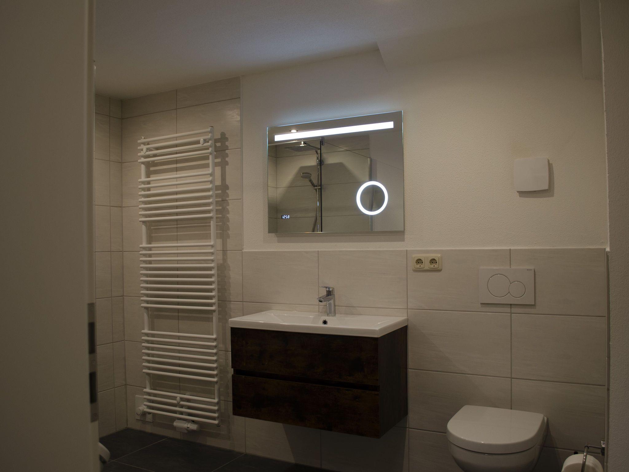 Das frisch sanierte Badezimmer lädt zum Wohlfühlen und Erfrischen für den Tag ein. Hier finden Sie ein Waschbecken mit beleuchtetem Spiegel inkl. Make-up Spiegel, WC, Urinal sowie eine schwellenfrei begehbare Dusche. Die Fußbodenerwärmung rundet das Bild des schönen Badezimmers ab.