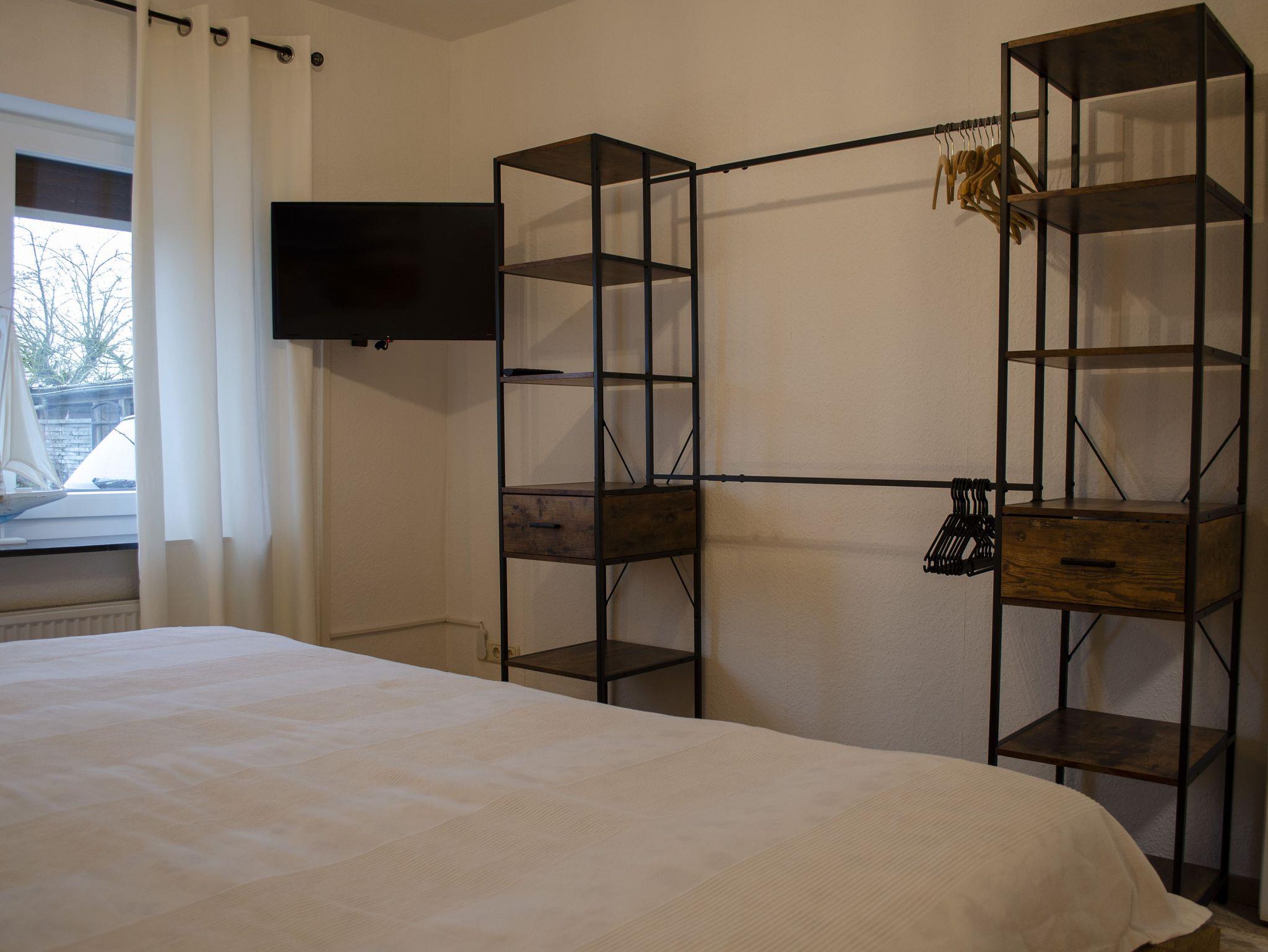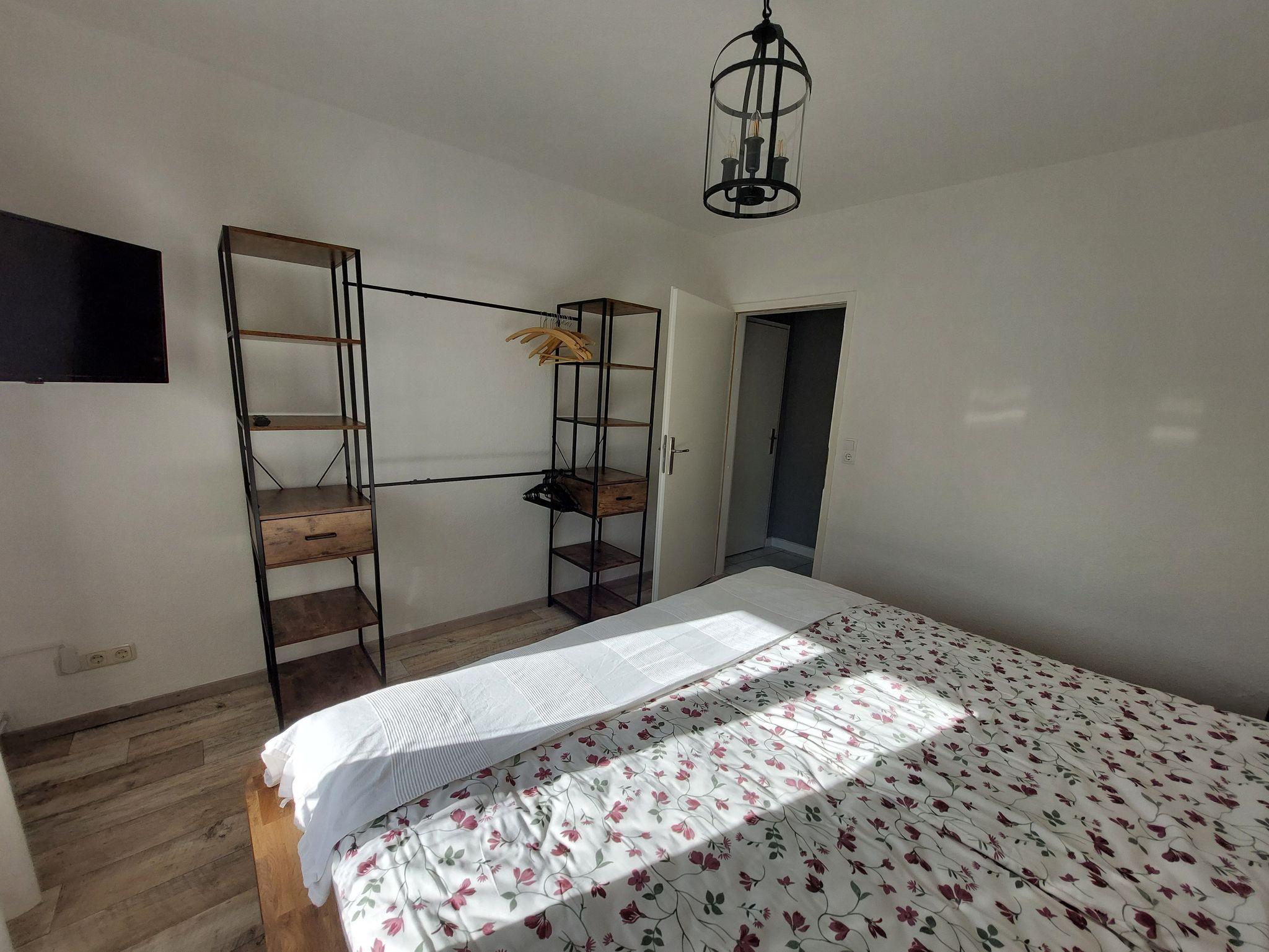 Im Schlafzimmer ist ein offener Kleiderschrank zu finden sowie ein TV an der Wand. Es befindet sich ein sehr bequemes 2x2 Meter Bett darin. Handtücher und Bettwäsche sind im Preis mitinbegriffen.
