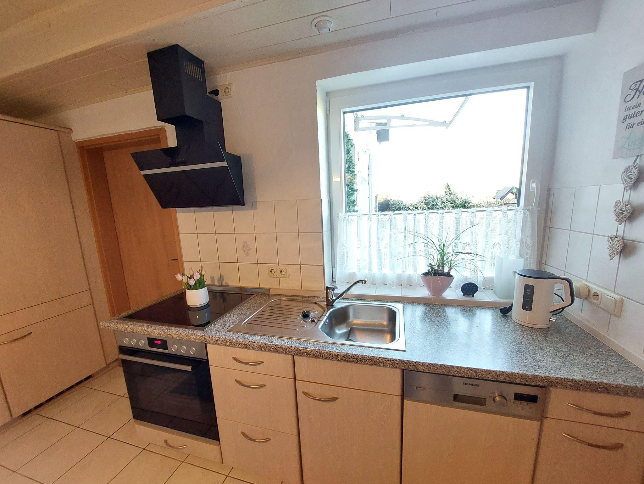 Vom Flur aus gelangt man in die geräumige Küche mit zweigeteilter Küchenzeile. Hier finden Sie alle möglichen Küchenutensilien, um sich zu versorgen. Ceranfeld mit Backofen und Dunstabzugshaube, Spüle sowie Spülmaschine. Ein Wasserkocher, eine Kaffeemaschine sowie ein Kühlschrank und eine Mikrowelle gehören selbstverständlich auch dazu. Ein kleiner Esstisch mit Stühlen lädt zum Frühstücken ein.