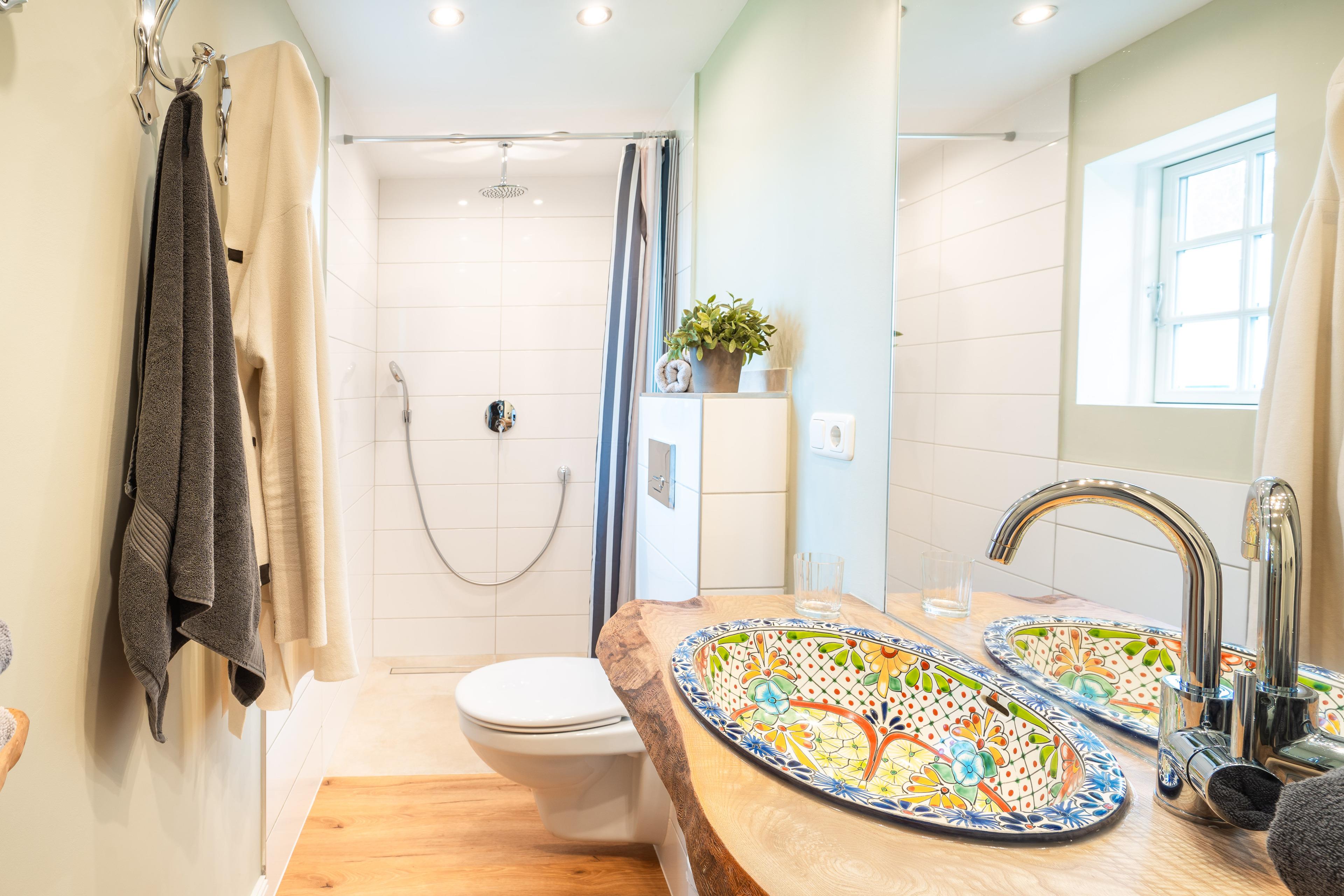 Am Kaminofen lässt es sich abends einfach herrlich abschalten . WLAN mit Glasfaser steht kostenlos zur Verfügung. Das Haus ist 2024 komplett saniert und verfügt über einen Wohn-Essbereich mit einer offenen vollaugestatteten Luxusküche. Die Heizung ist eine hochmoderne Wandheizung, die ein herrliches Raumklima schafft. Neben dem Vorraum mit klassischer Klönschnacktür, befindet sich das Bad mit Regendusche. Im oberen Teil des Ferienhauses sind 2 schöne Schlafzimmer mit Doppelbetten, in die man sich herrlich zurückziehen kann. Der Wellnessbereich für all unsere Gäste auf dem Hof lässt mit seiner finnischen Sauna und Infrarotkabine keine Wünsche offen. Auch ihr E-Auto hat eine schnelle Ladestation.
