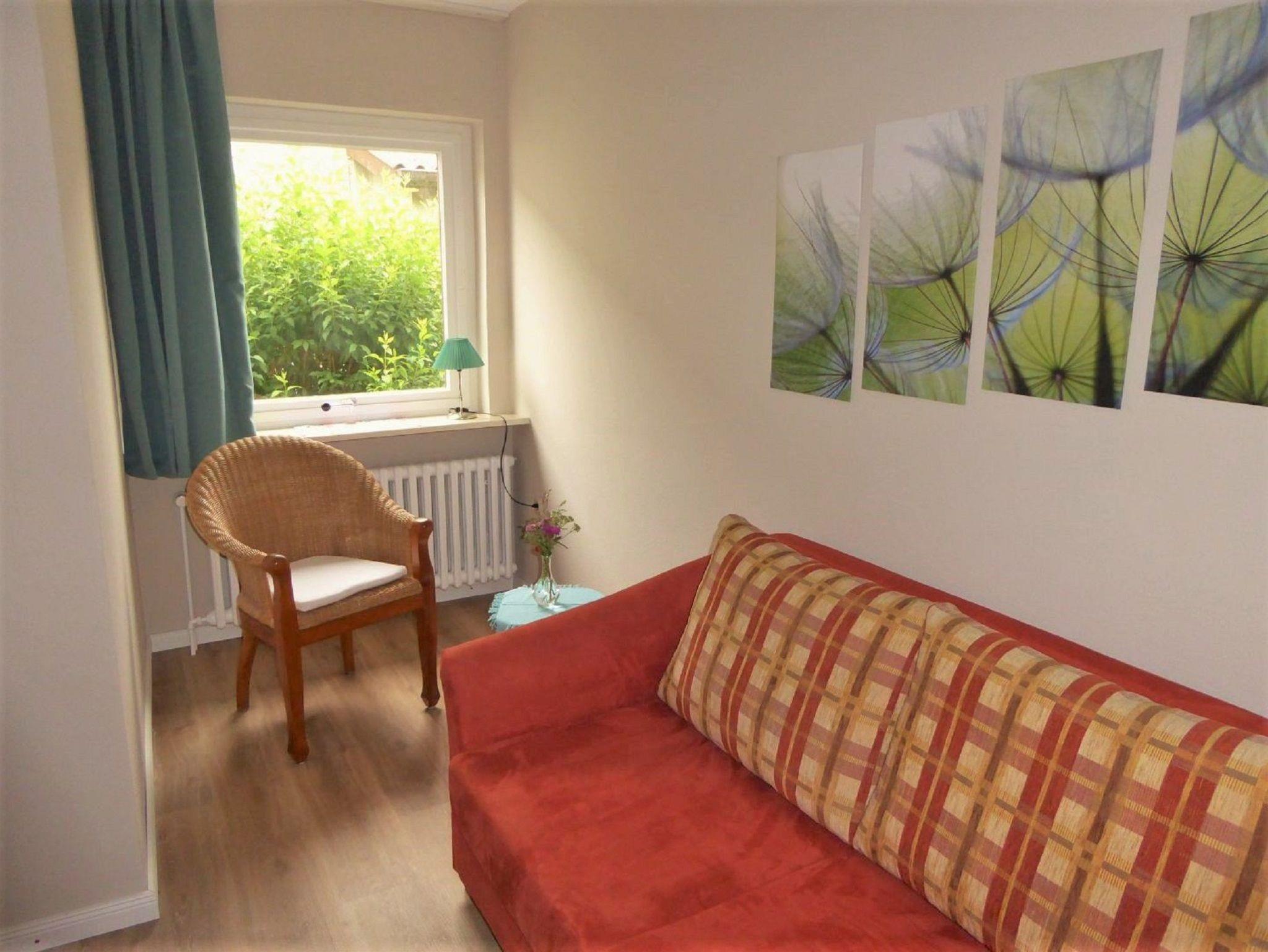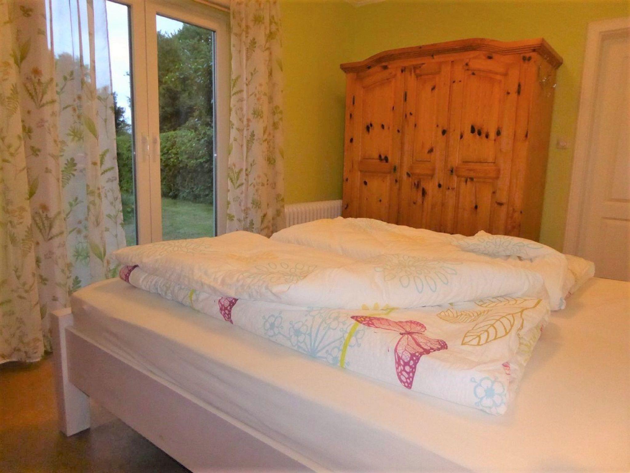 Die Ferienwohnung Schleikate hat ein großes Wohnzimmer mit Blick in den Garten, einen Kaminofen, eine große gemütliche Küche mit Eßecke, Badezimmer mit Dusche/WC, ein Schlafzimmer mit Doppelbett (160x200cm) und ebenfalls Blick in den Garten, ein zweites Schlafzimmer mit zwei Einzelbetten (90x200cm), daran anschließend ein drittes Schlafzimmer mit einer Schlafcouch. Das dritte Schlafzimmer mit Schlafcouch ist nur über das zweite Schlafzimmer zu erreichen, es hat keinen separaten Eingang.