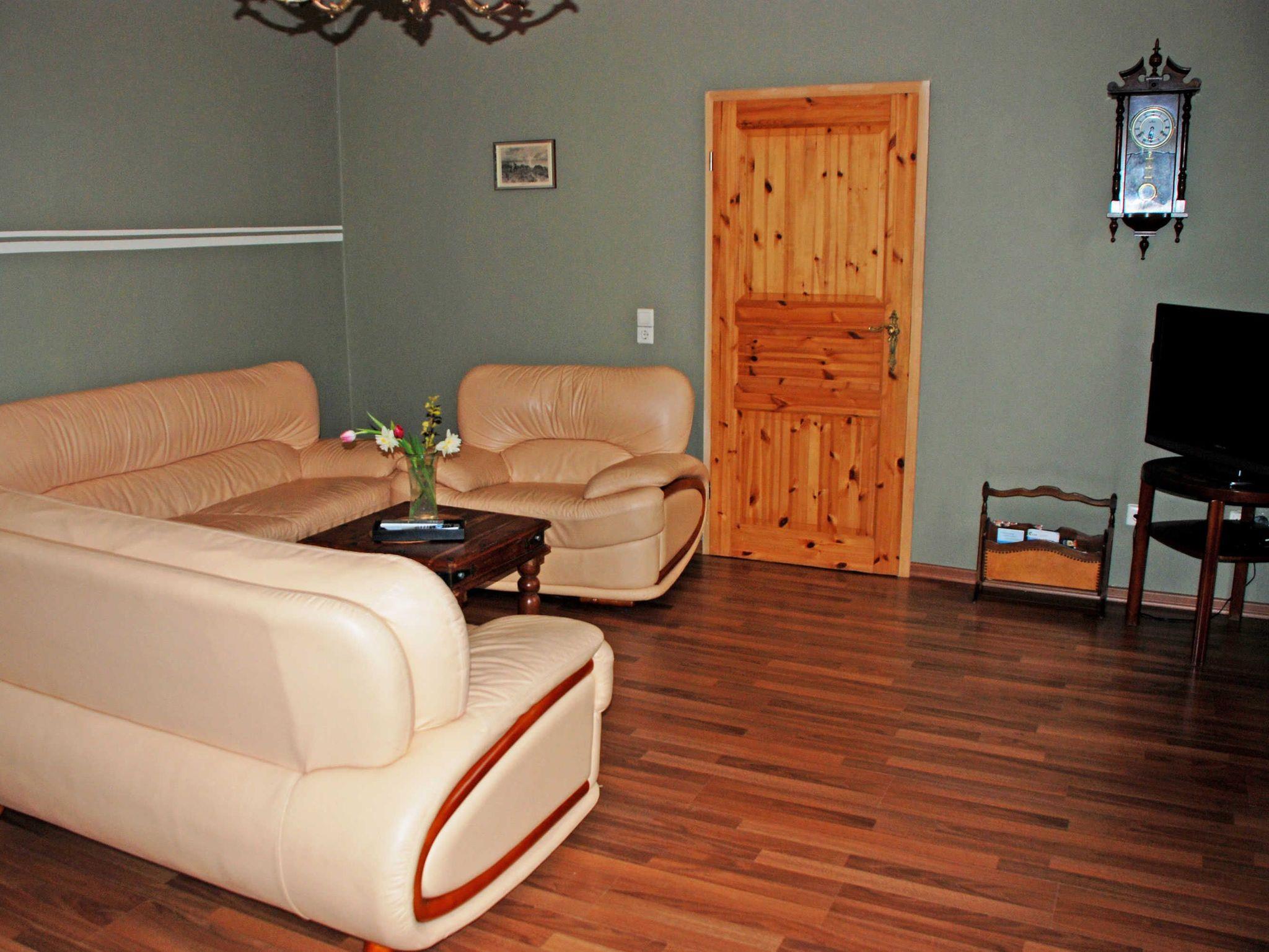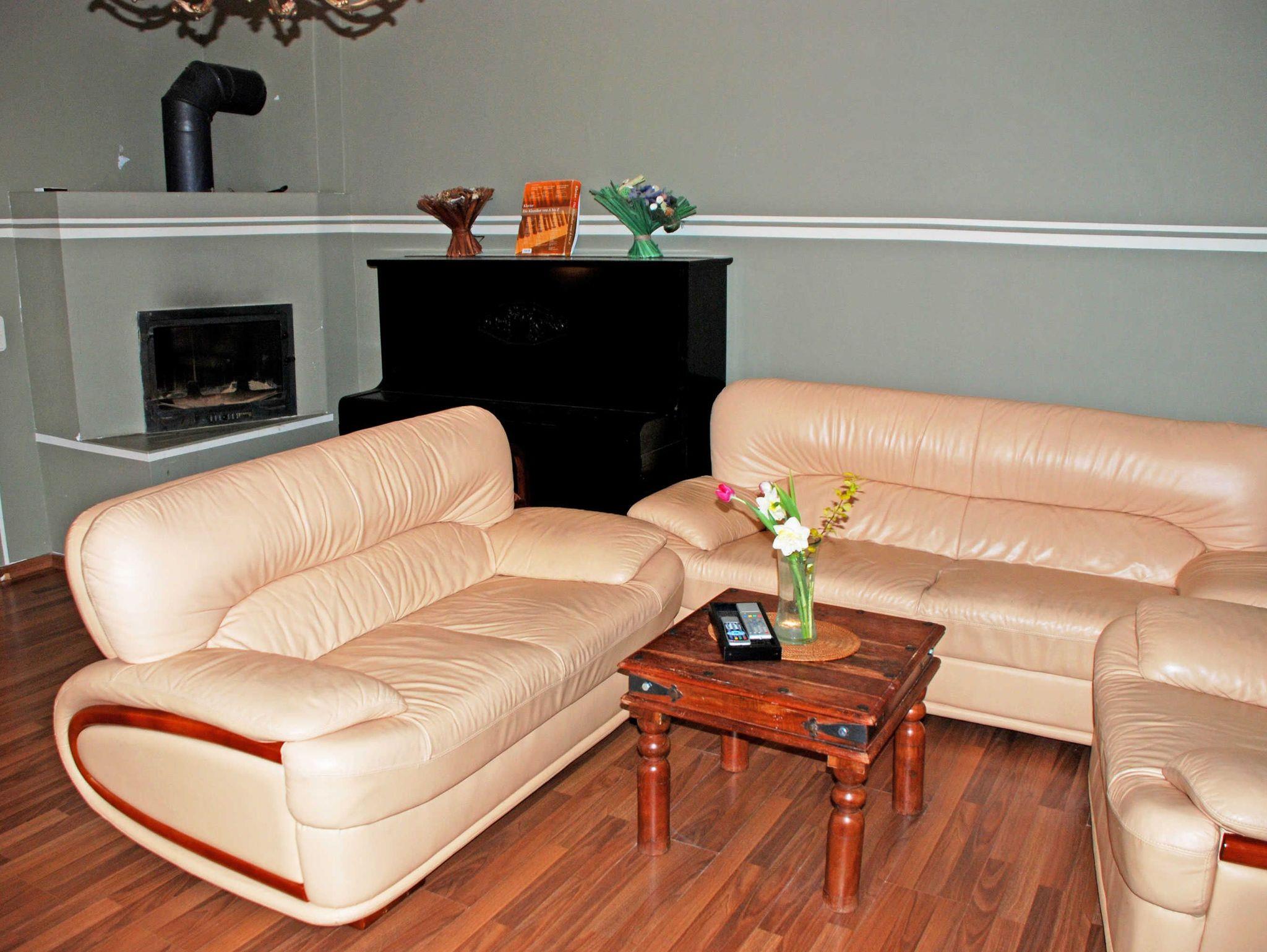 Im großen Wohnzimmer befinden sich eine Sitzcouch (für zwei Gäste aufbettbar) mit Tisch, ein Ledersofa, ein Schrank und ein TV-Gerät sowie ein Klavier. Ein besonderes Flair erhält diese Wohnung durch den vorhandenen Kamin, der besonders im Winter Behaglichkeit bietet. In der großen Küche finden Sie neben einem Esstisch mit Stühlen, einen Herd mit Backofen, Mikrowelle, Kaffeemaschine, Wasserkocher, Toaster und Kühlschrank.