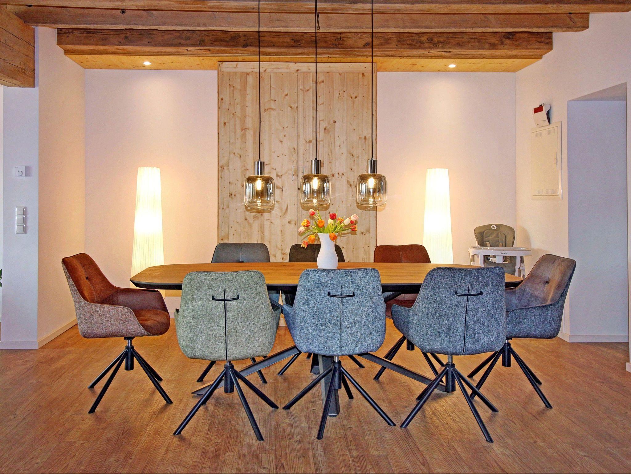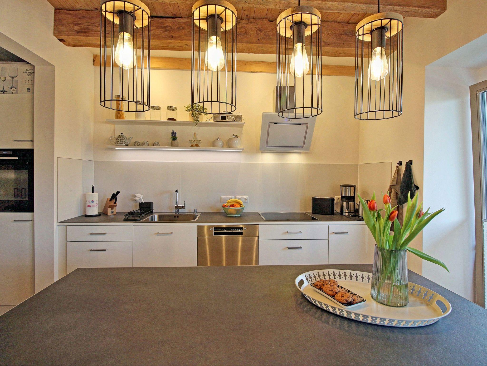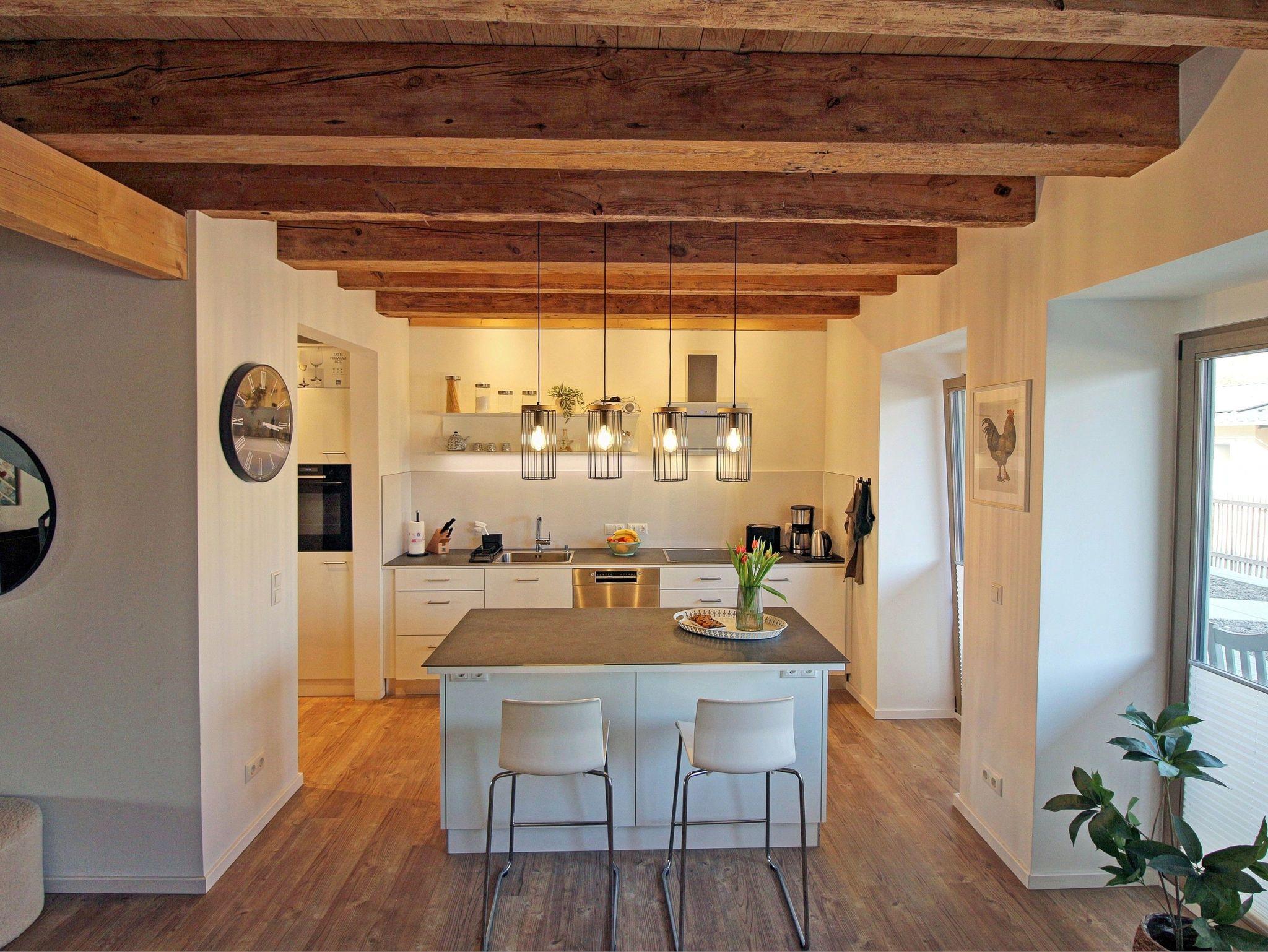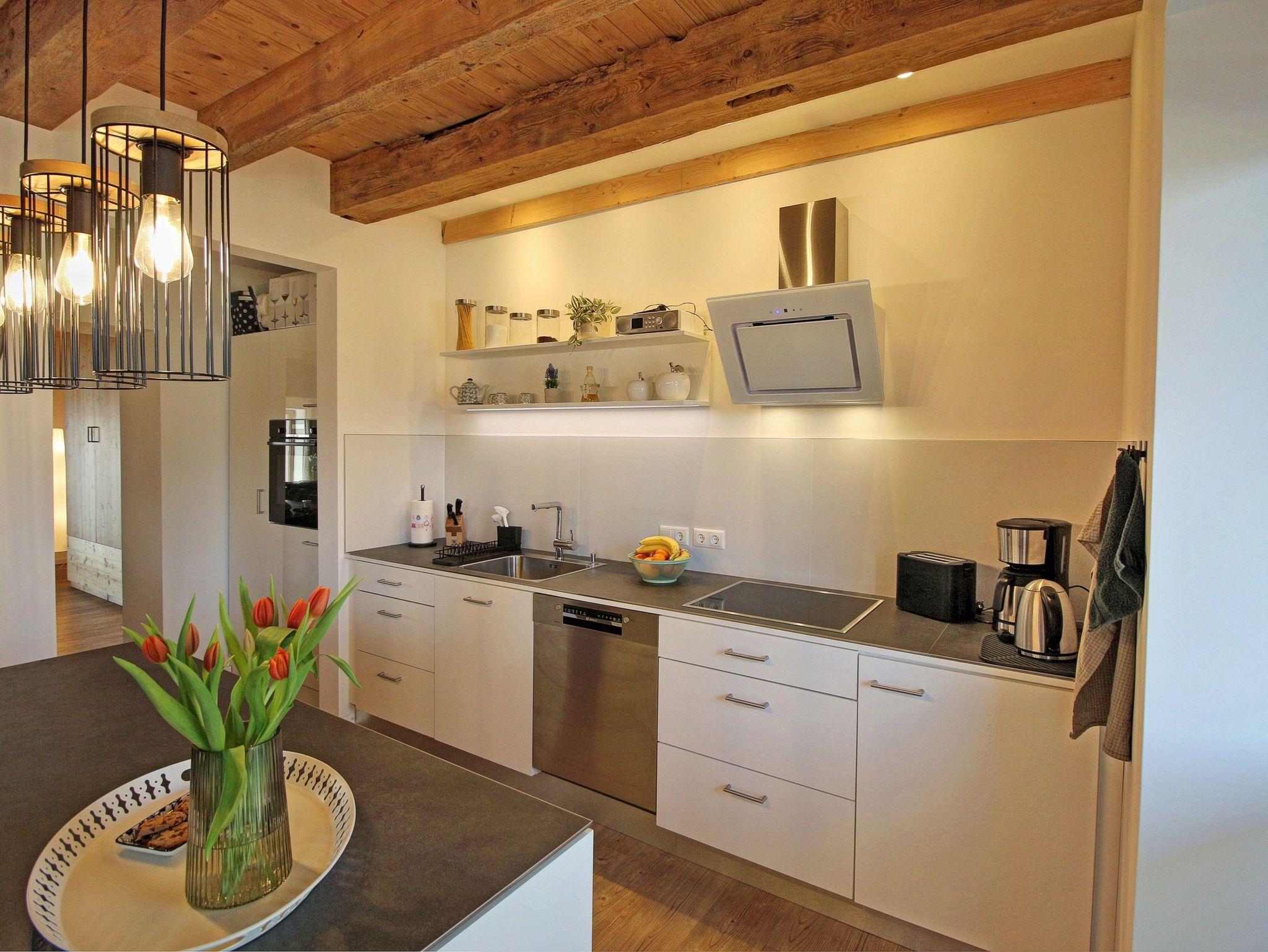 Gleich vornean befindet sich der optisch getrennte Küchenbereich mit einem kleinem Sitz- und Essplatz und komplett ausgestatteter Einbauküche. Die Küche ist voll ausgestattet mit großem Kochfeld, Backofen, Kühl- und Gefrierschrank, Geschirrspüler, diversen Küchengeräten und sämtlichen nötigen Küchenutensilien - hier wird die Selbstverpflegung zum Kinderspiel. Gleich neben dem Küchenbereich befindet sich ein großer Esstisch, an dem die ganze Familie Platz findet. Auch ein Kinderhochstuhl steht bei Bedarf zur Verfügung.