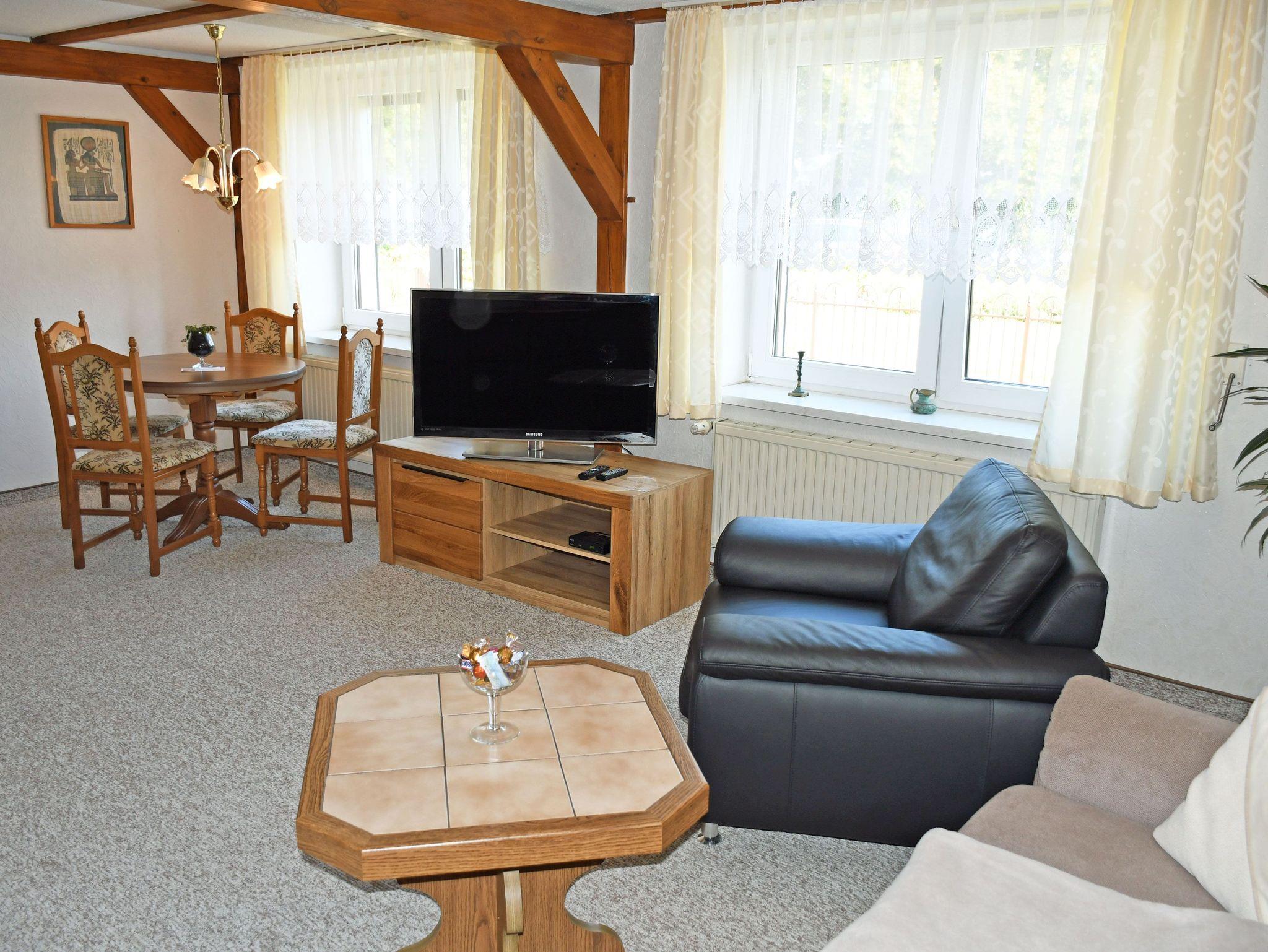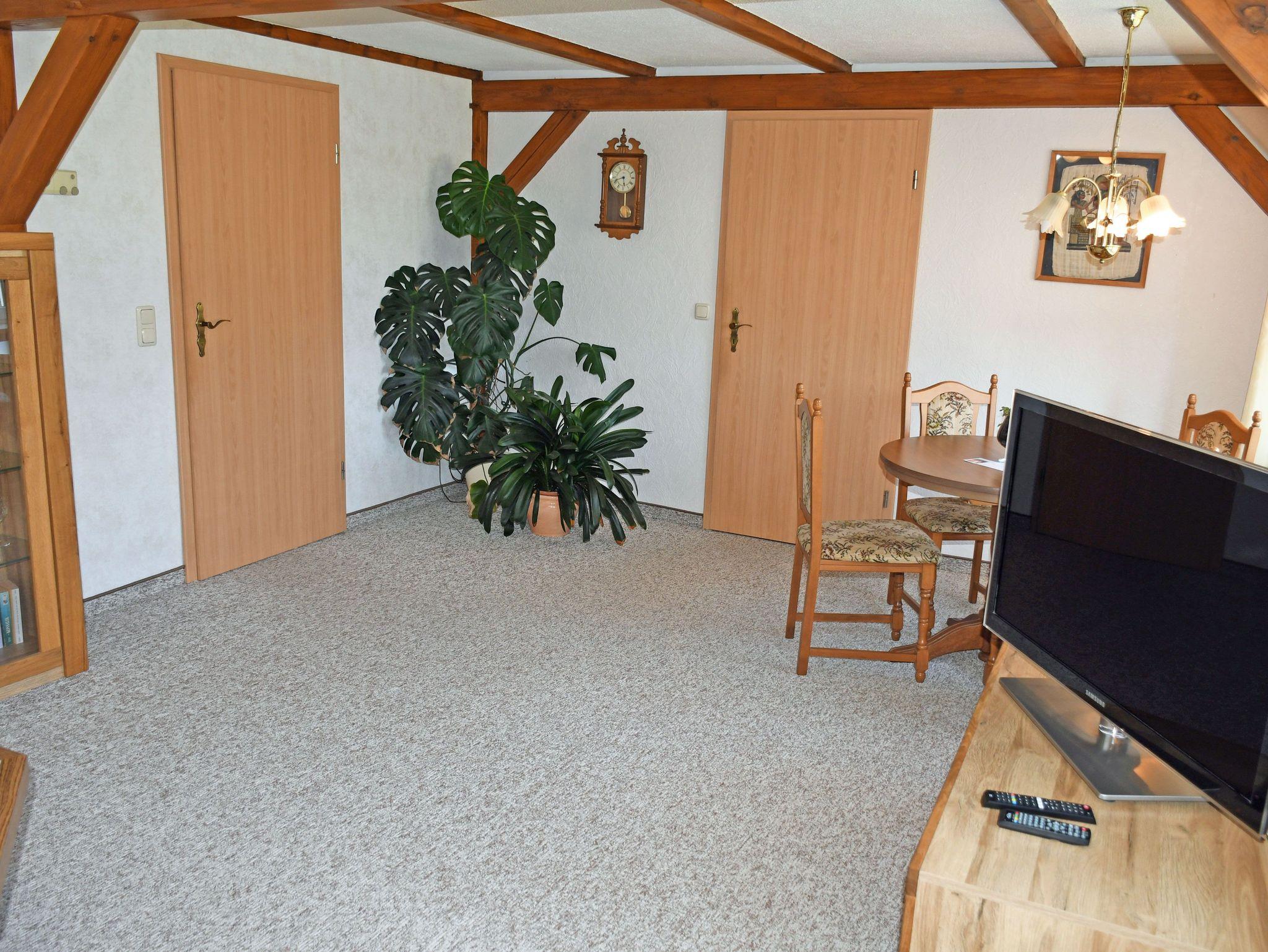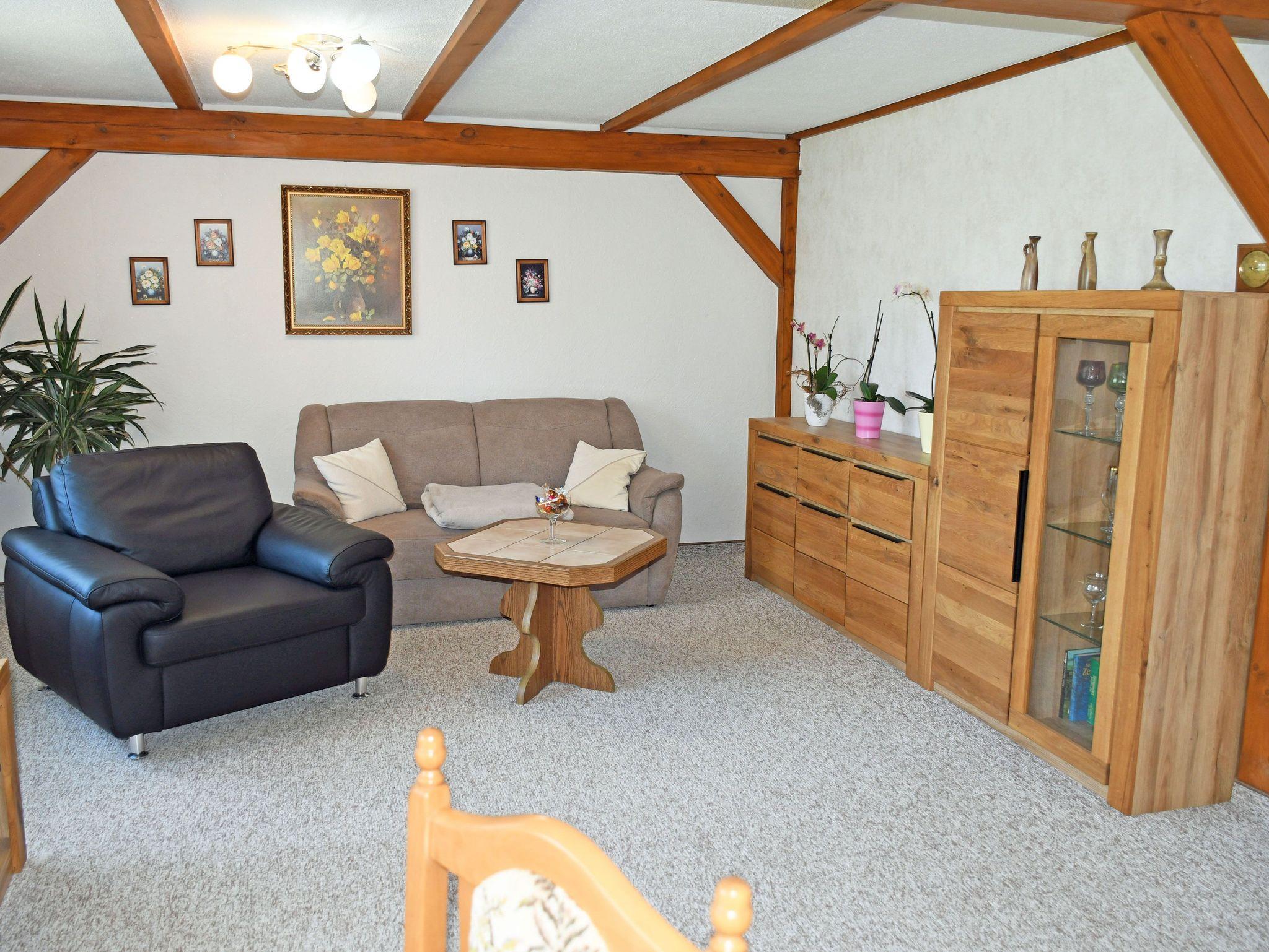 Die Ferienwohnung befindet sich mit separatem Eingang im Erdgeschoss eines Einfamilienhauses. Sie ist ca. 60 qm groß, hat Platz für maximal 4 Gäste und wurde modern und liebevoll eingerichtet. Im großen Wohnraum mit schönen Deckenbalken befinden sich eine bequeme Sitzcouch mit Tisch und ein modernes Flachbild-TV-Gerät. Hier steht auch ein Esstisch mit Sitzgelegenheiten. Die separate Küche ist mit einem Ceranfeld-Herd mit Abzugshaube, Backofen, Mikrowelle, Wasserkocher, Kaffeemaschine, Toaster und Kühlschrank komplett ausgestattet.