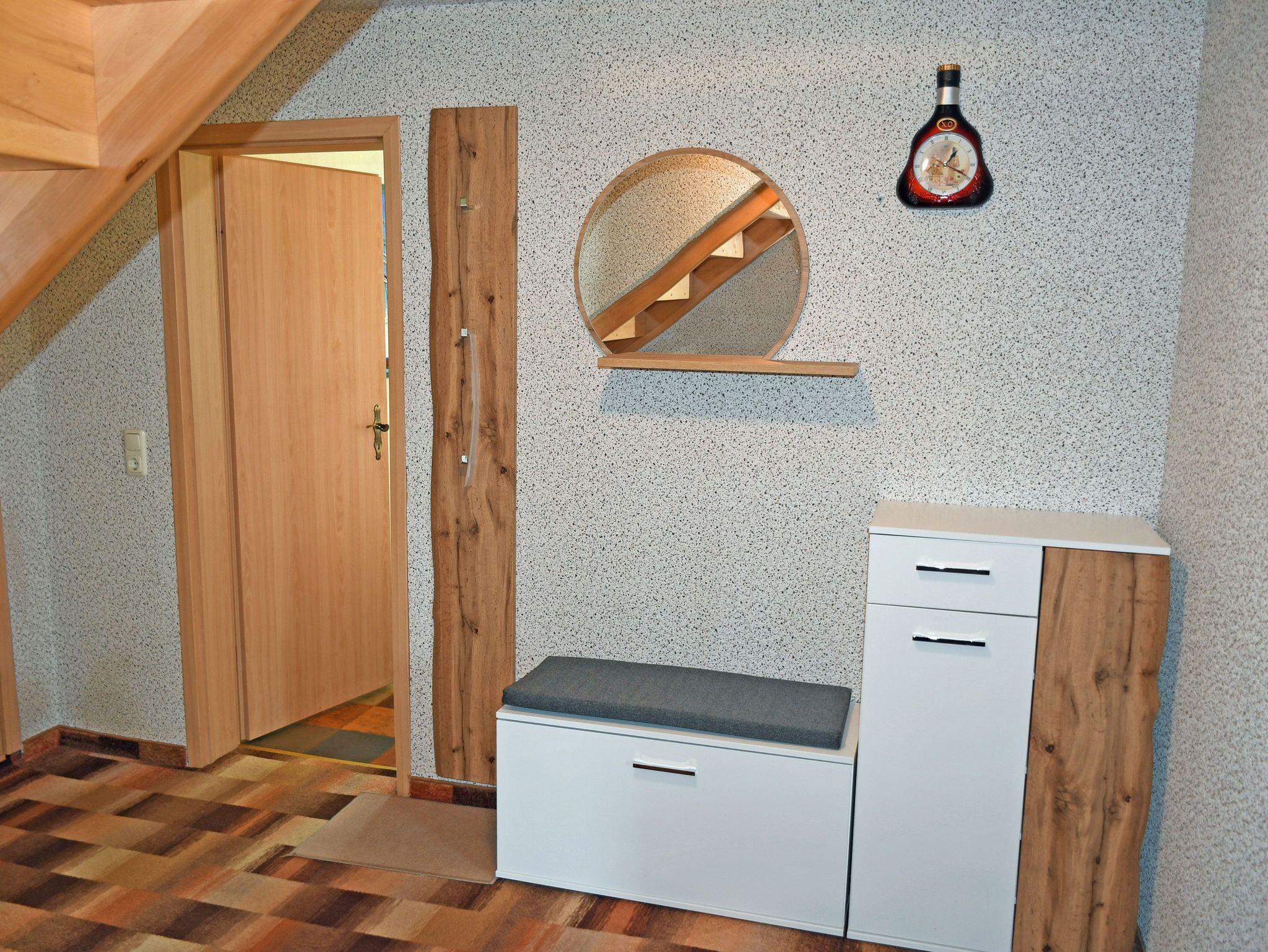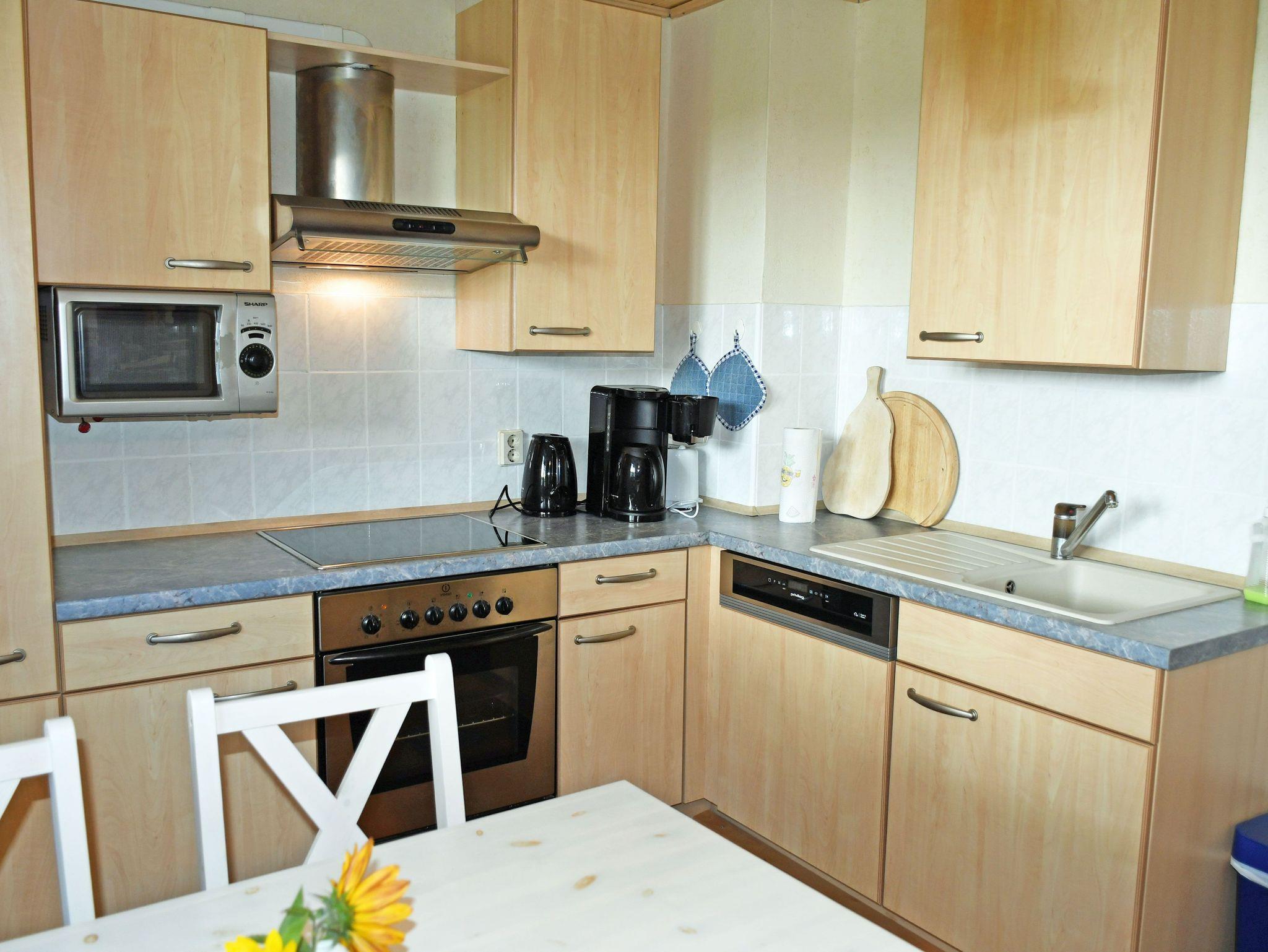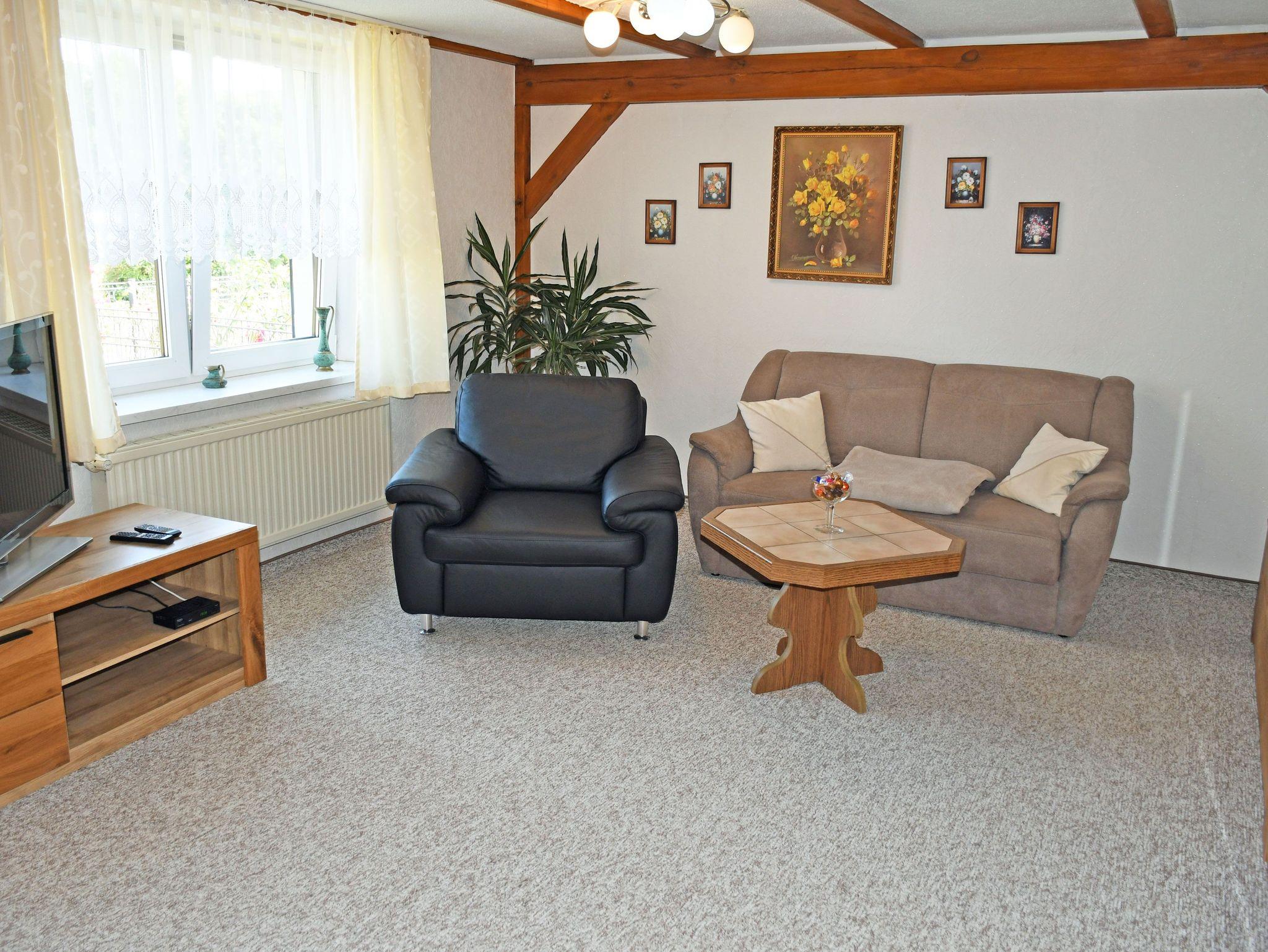 Die Ferienwohnung befindet sich mit separatem Eingang im Erdgeschoss eines Einfamilienhauses. Sie ist ca. 60 qm groß, hat Platz für maximal 4 Gäste und wurde modern und liebevoll eingerichtet. Im großen Wohnraum mit schönen Deckenbalken befinden sich eine bequeme Sitzcouch mit Tisch und ein modernes Flachbild-TV-Gerät. Hier steht auch ein Esstisch mit Sitzgelegenheiten. Die separate Küche ist mit einem Ceranfeld-Herd mit Abzugshaube, Backofen, Mikrowelle, Wasserkocher, Kaffeemaschine, Toaster und Kühlschrank komplett ausgestattet.